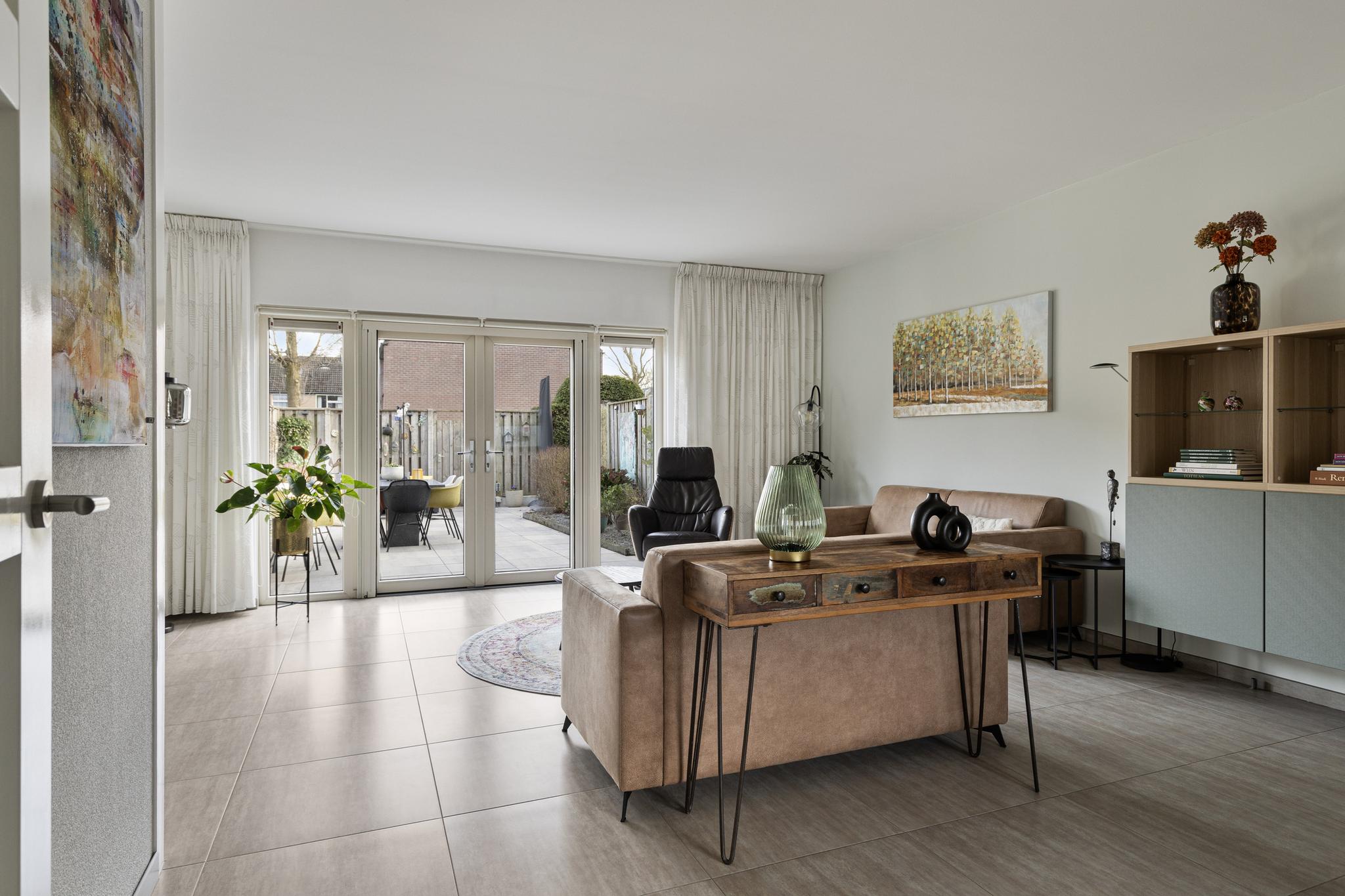 De royale tuingerichte woonkamer beschikt over een praktische trapkast en een grote glazen pui met openslaande deuren naar de achtertuin. Deze pui zorgt voor veel lichtinval in de woonkamer en biedt een mooi uitzicht op de tuin.