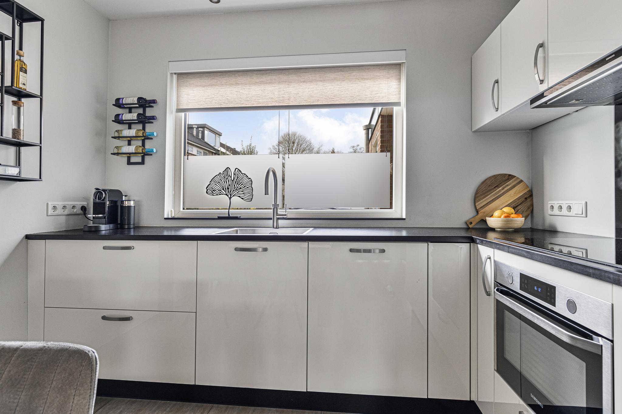 Aan de voorzijde bevindt zich de open keuken, uitgerust met een moderne L-vormige inbouwkeuken (2020) en de volgende inbouwapparatuur: inductiekookplaat, afzuigkap, vaatwasser, combi-magnetron, koel/vriescombinatie en quooker.