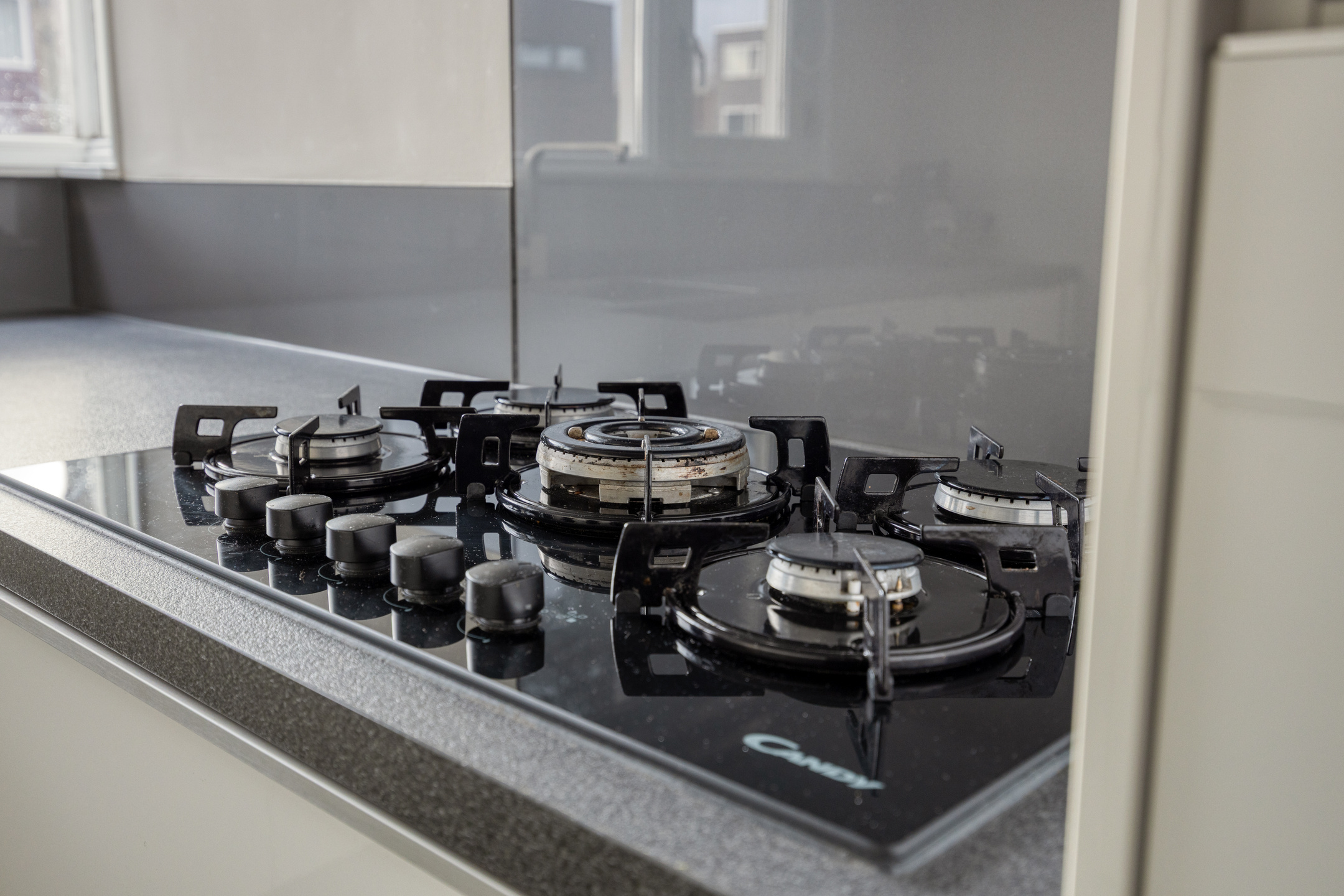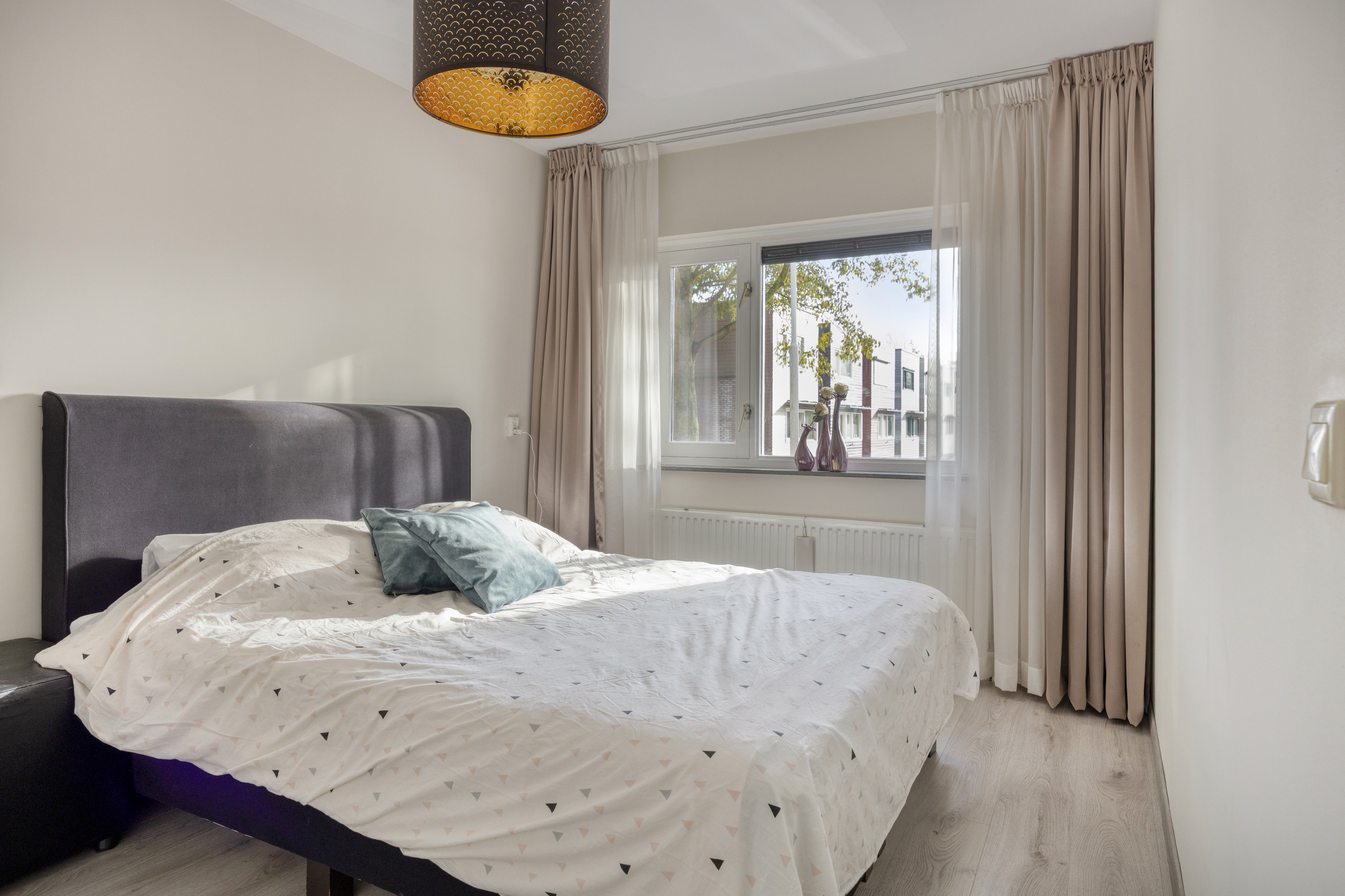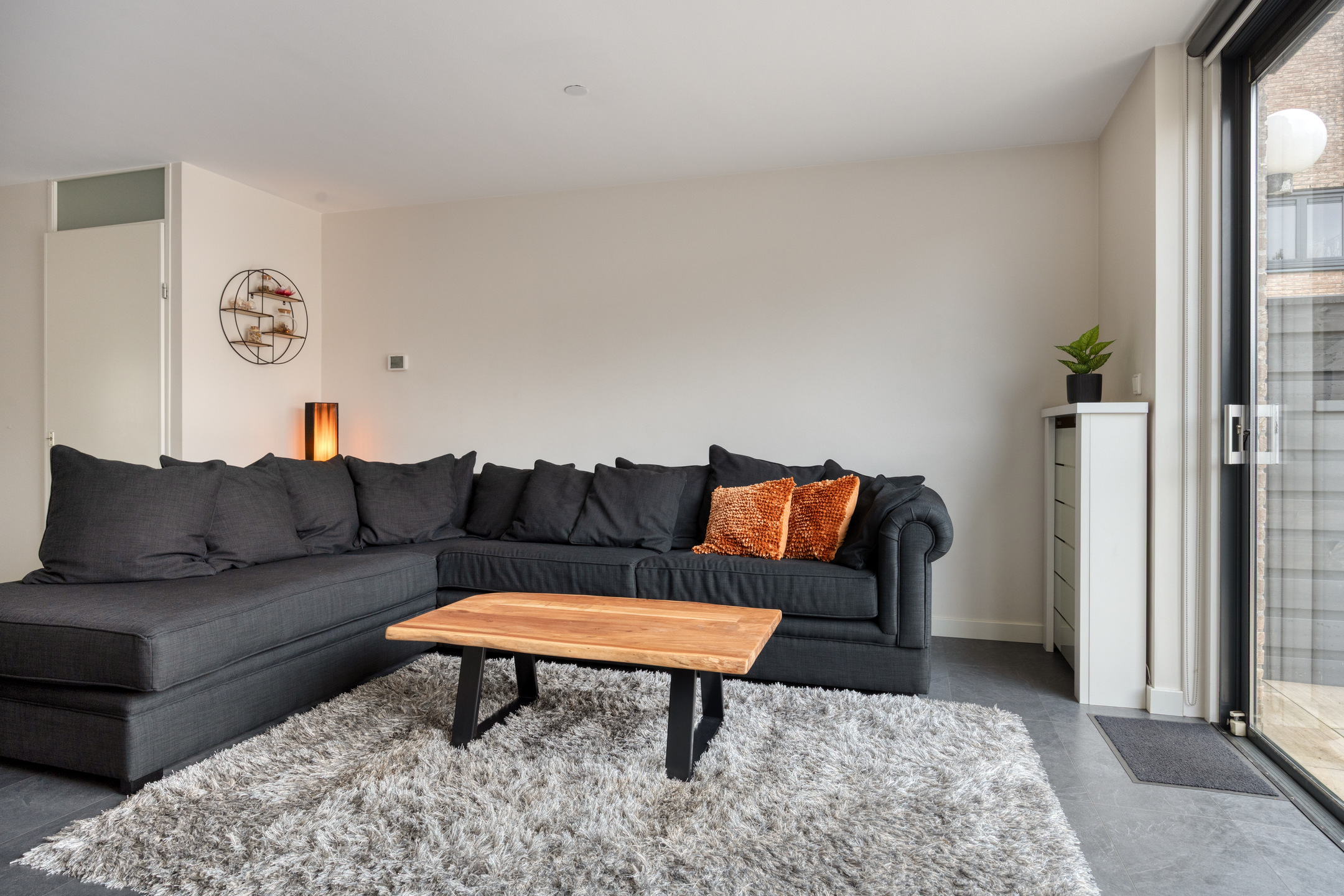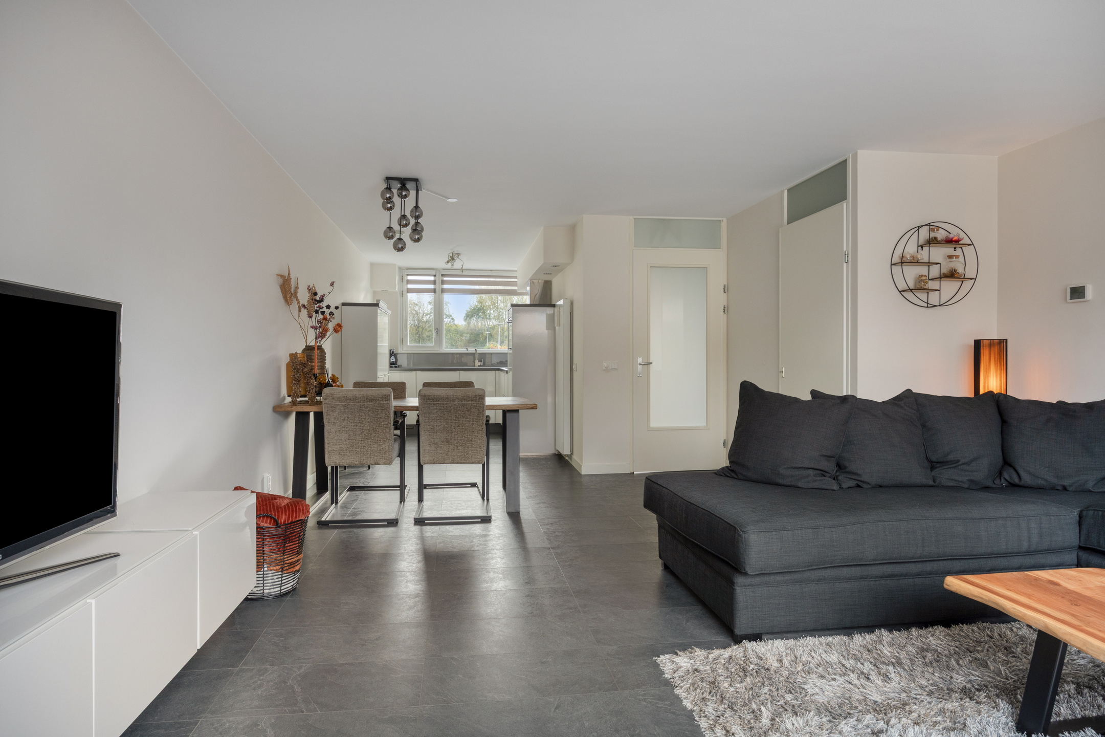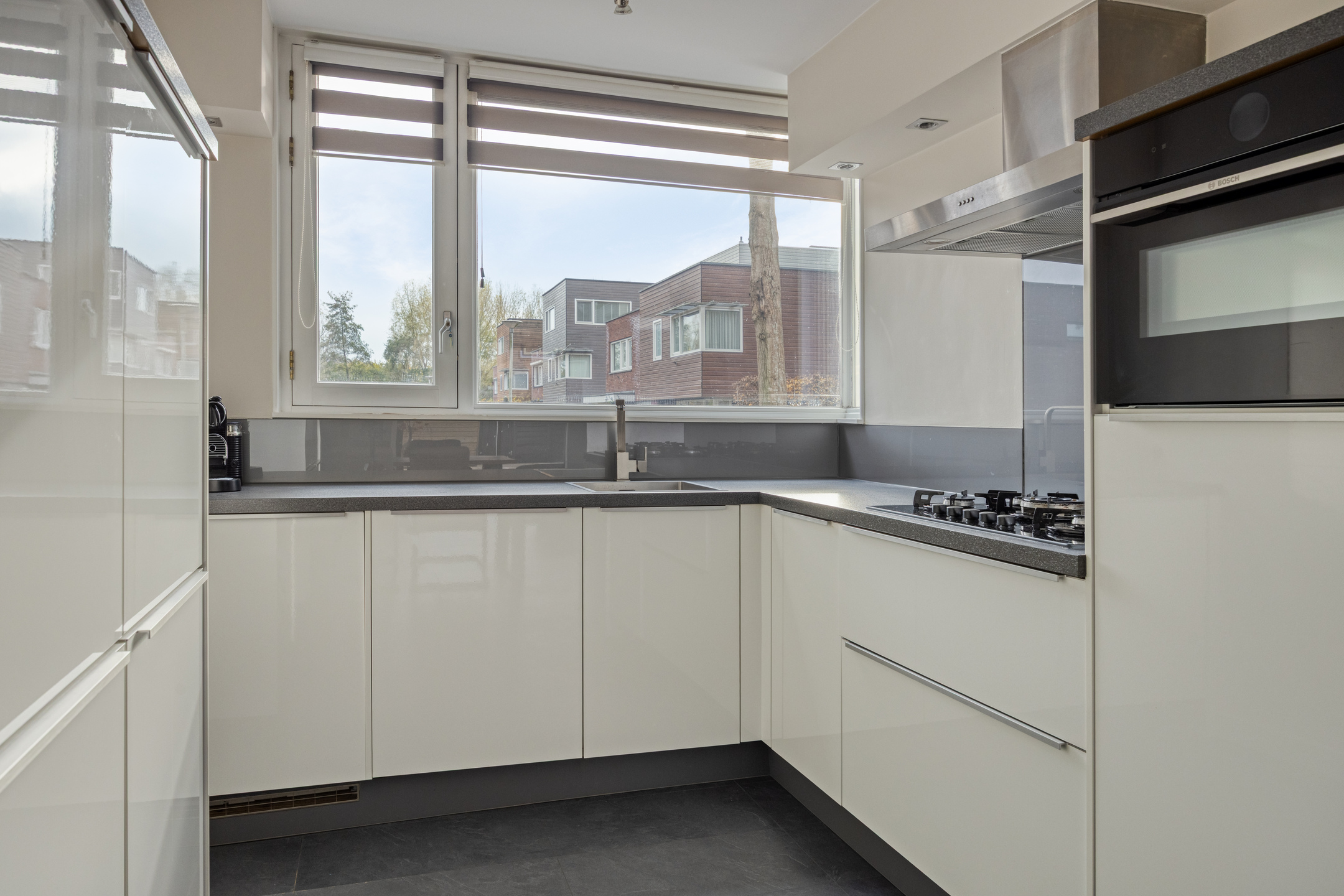 De grote schuifpui aan de achterzijde zorgt voor veel lichtinval en biedt een fraai zicht op de moderne achtertuin. De keuken, gelegen aan de voorzijde, is uitgevoerd in een complete hoekopstelling met diverse inbouwapparatuur en volop kastruimte.