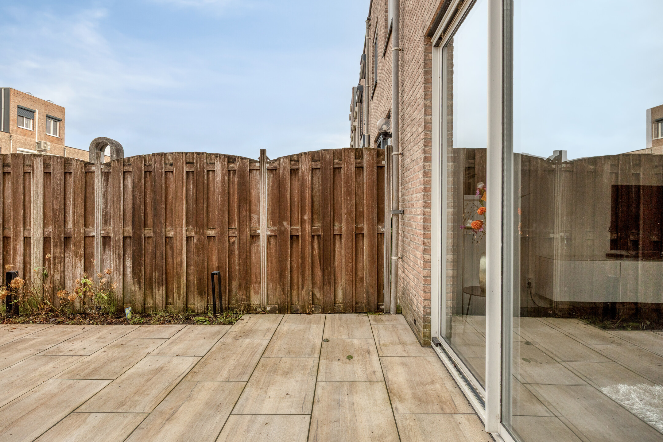 De tuin is volledig betegeld en daardoor onderhoudsarm. De tuin ligt op het noordoosten, daardoor geniet je de gehele dag van de zon. Achterin staat een berging met elektra en uiteraard is er een achterom.