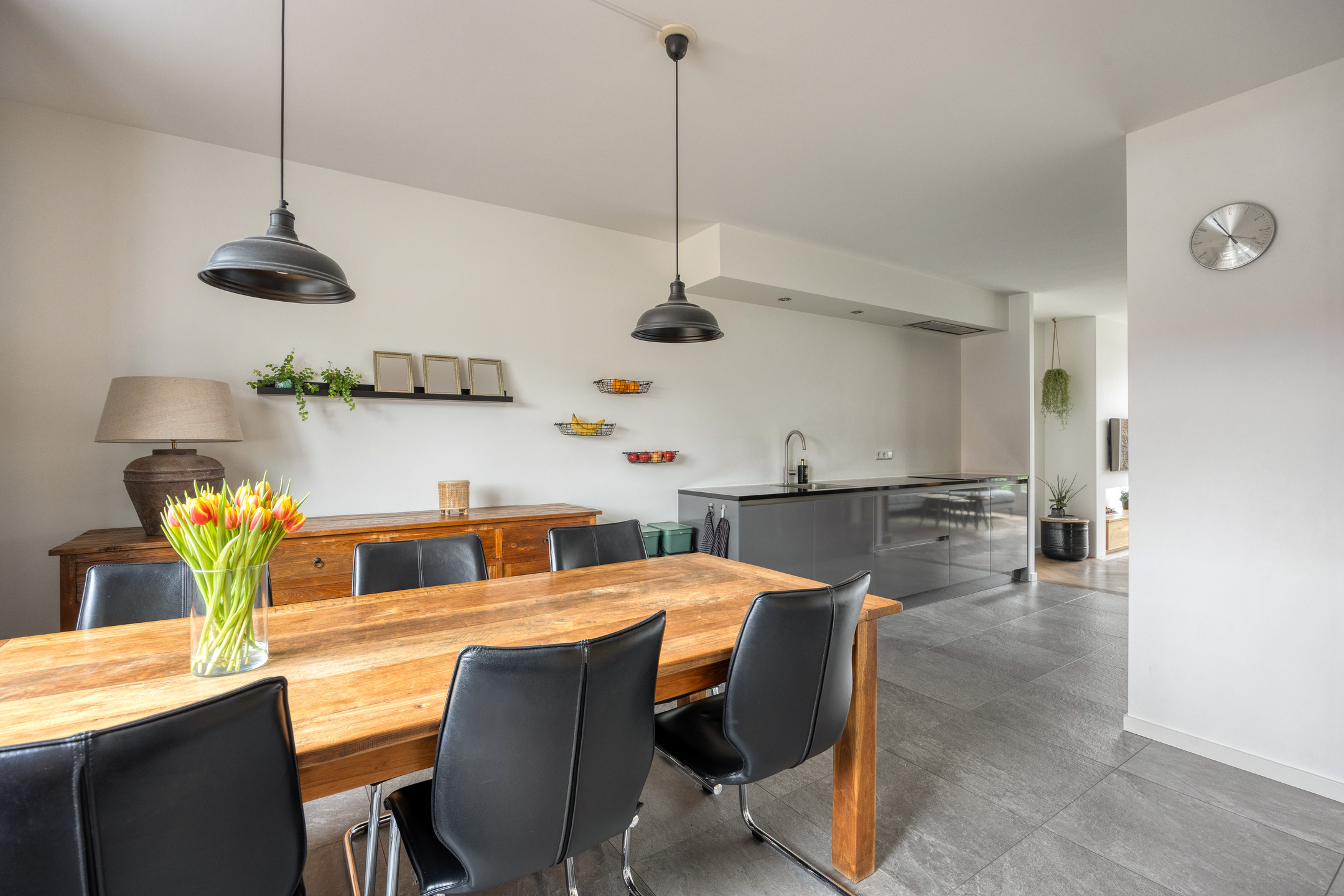 Aan de voorzijde van de woning bevindt zich het eetgedeelte en is er ruimte voor een royale eettafel, een fijne plek voor dagelijkse maaltijden en gezellige diners.