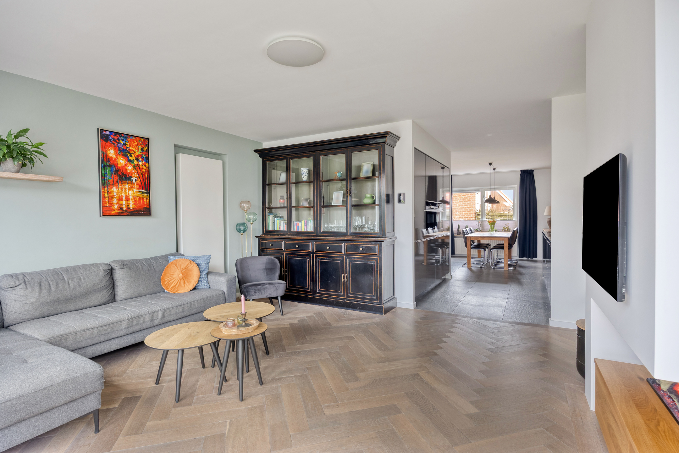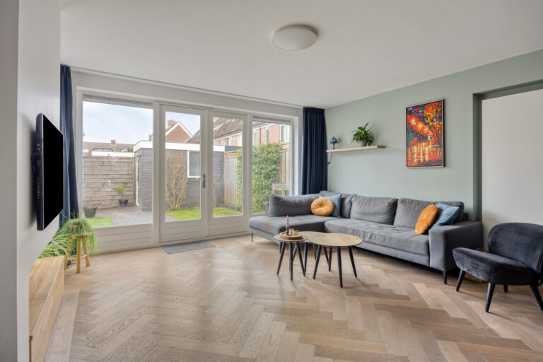 Aan de achterzijde van de woning ligt de uitgebouwde en tuingerichte woonkamer, waar een ruime en lichte leefruimte is gerealiseerd.