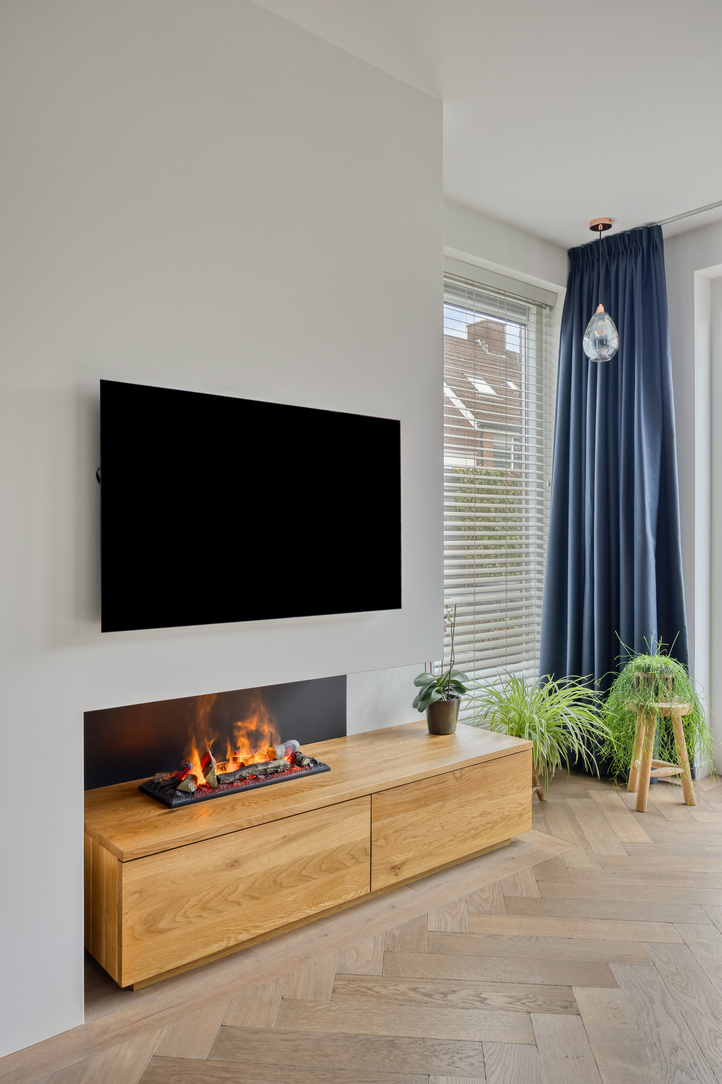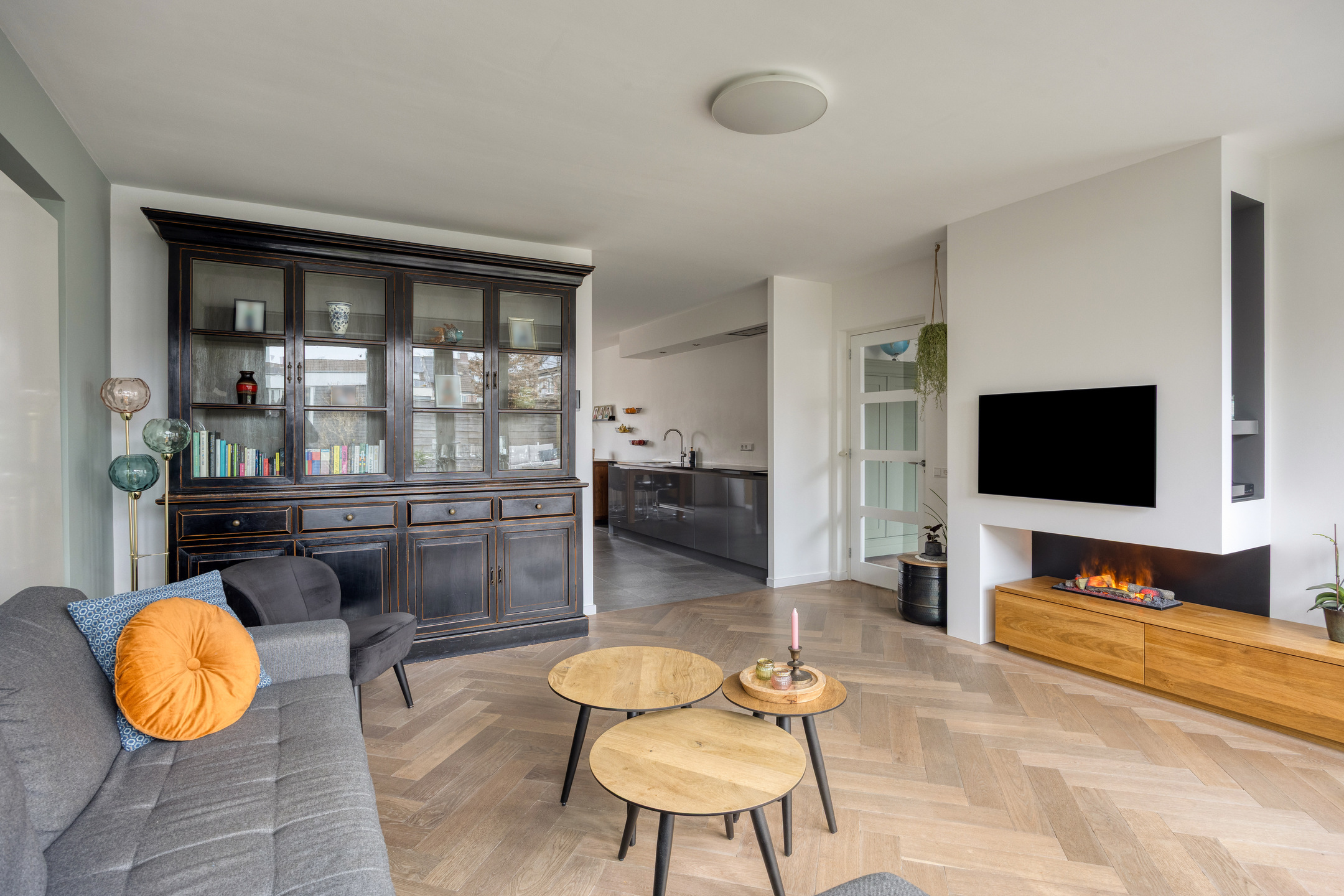De woonkamer is voorzien van een sfeerhaard, wat zorgt voor extra sfeer tijdens de wintermaanden. Dankzij de breedte van de woning is er volop ruimte voor een comfortabele zithoek.