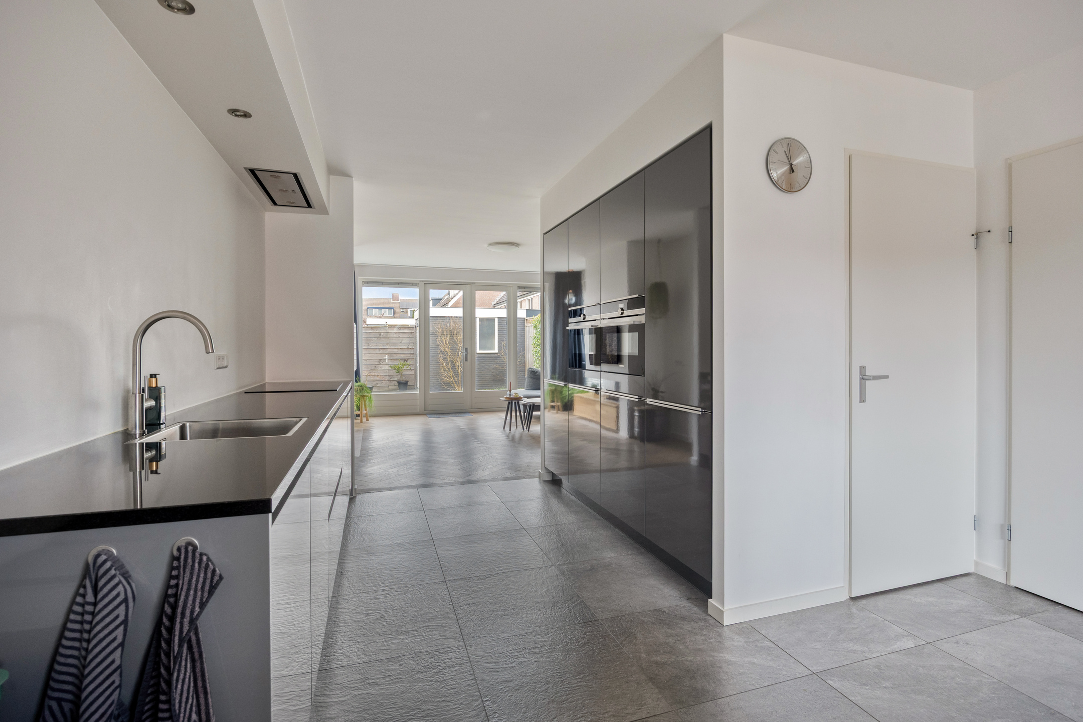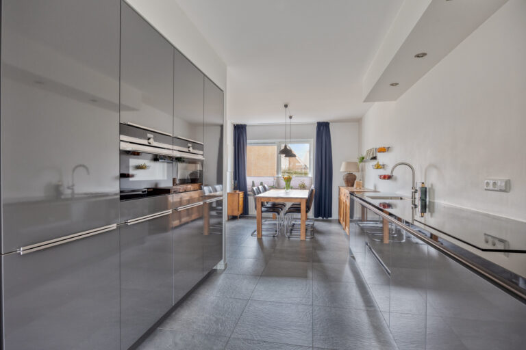 Aansluitend is de luxe inbouwkeuken. Deze mooie keuken is voorzien van diverse inbouwapparatuur, waaronder een inductiekookplaat, afzuigkap, vaatwasser, oven, combi-oven, een vriezer en een hoge koelkast.