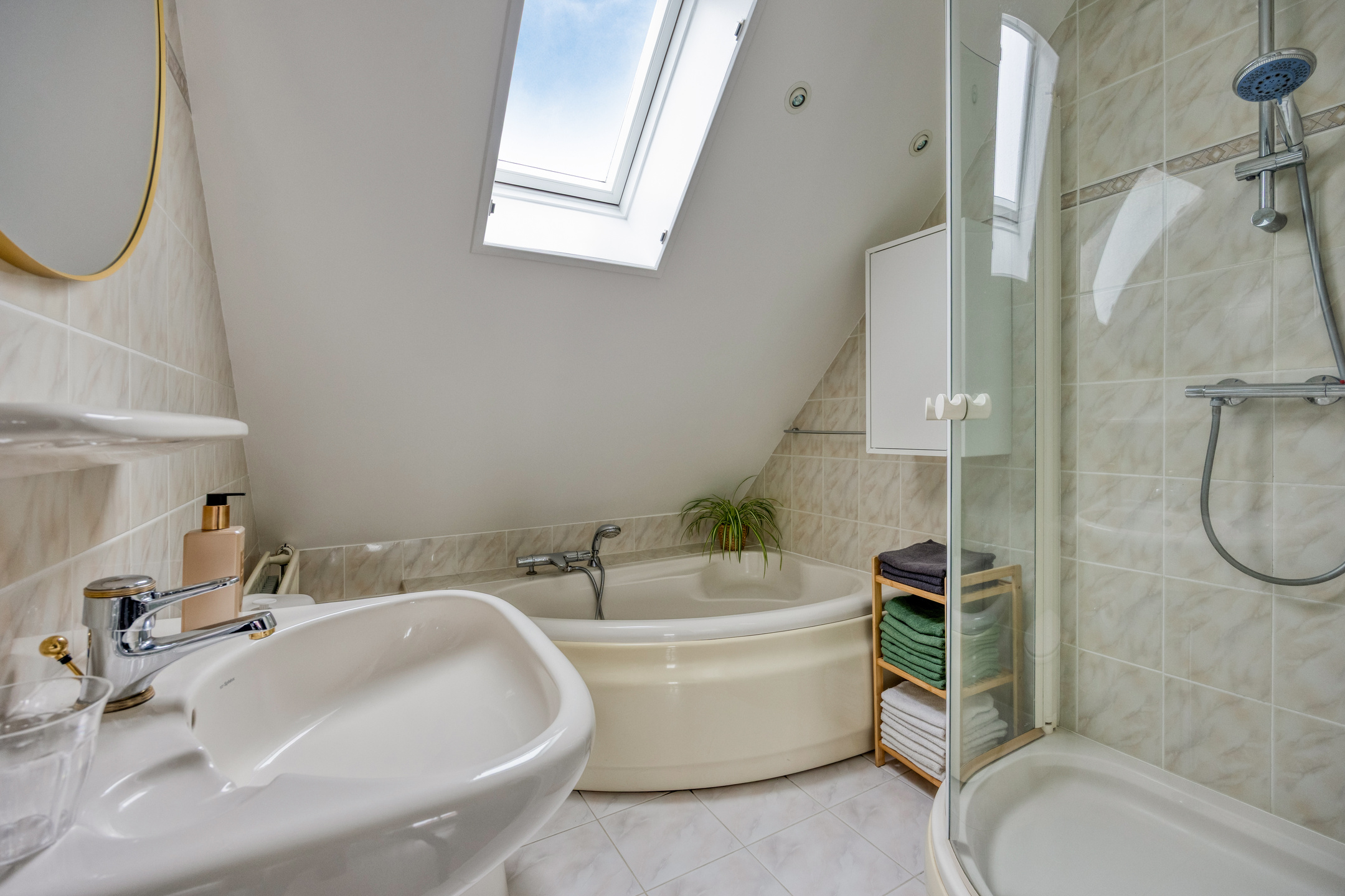 De badkamer is praktisch ingericht en voorzien van een ligbad met douche, een wastafel en een toilet.