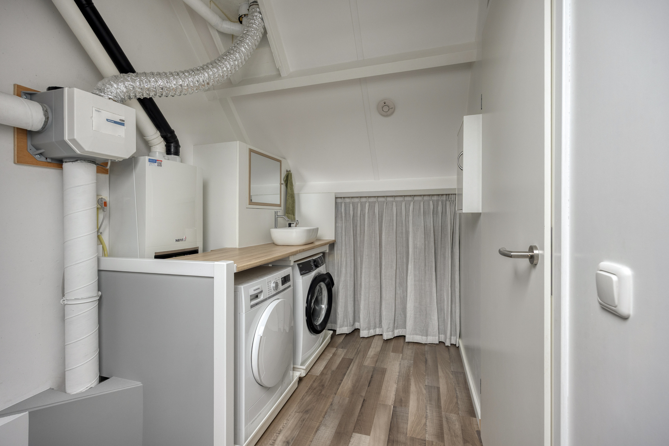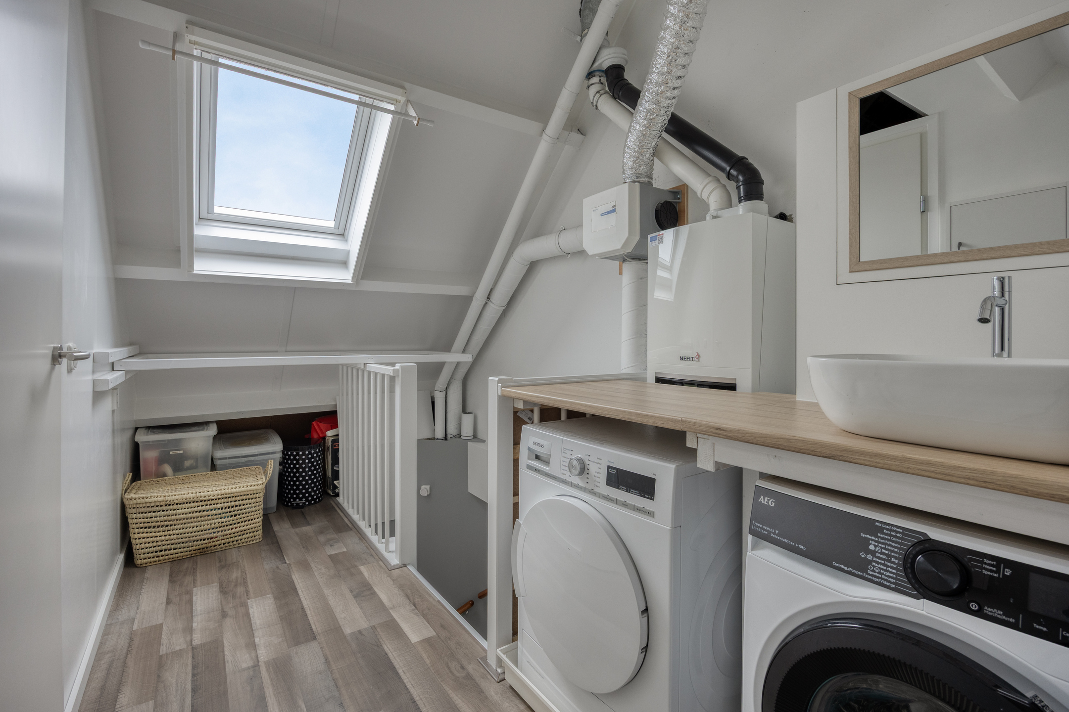 Op de overloop bevinden zich een wastafel, de aansluitingen voor wasmachine en droger en is de stookruimte terug te vinden.
