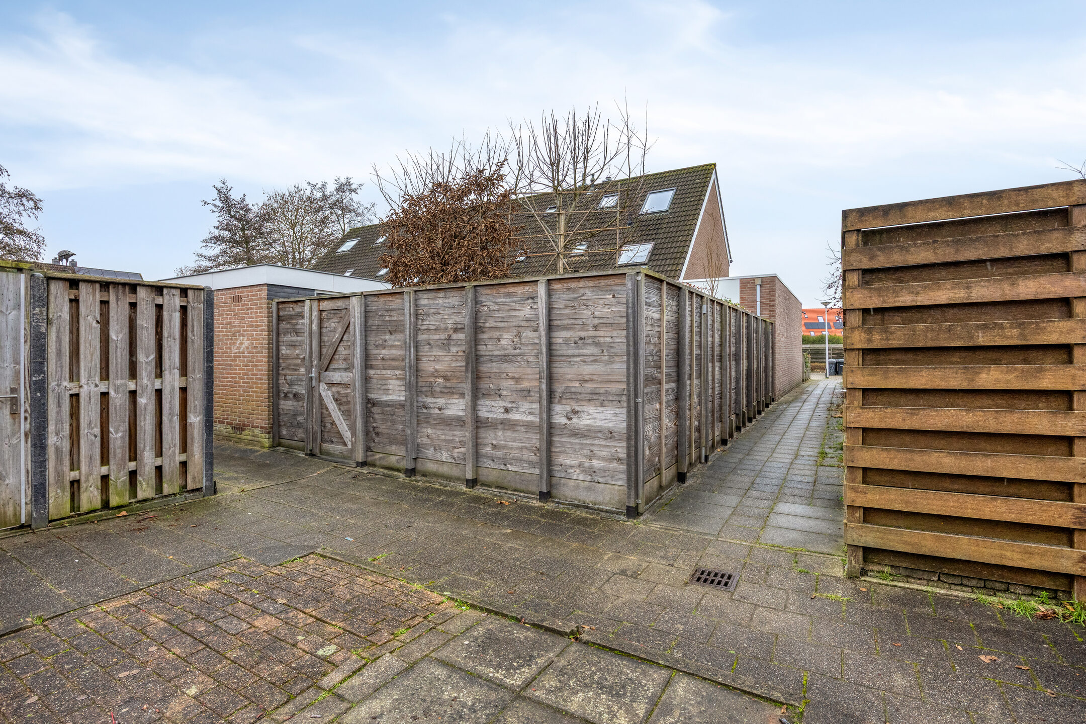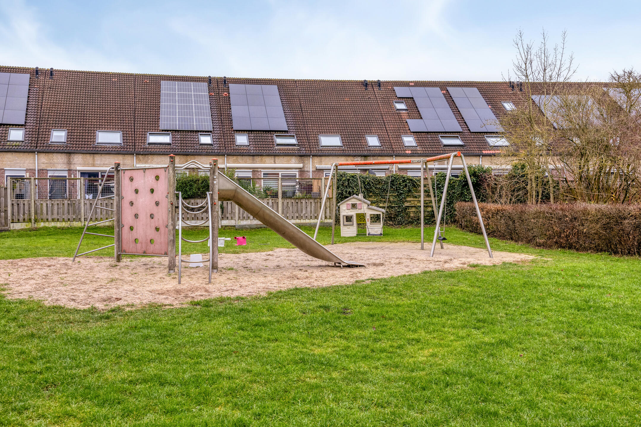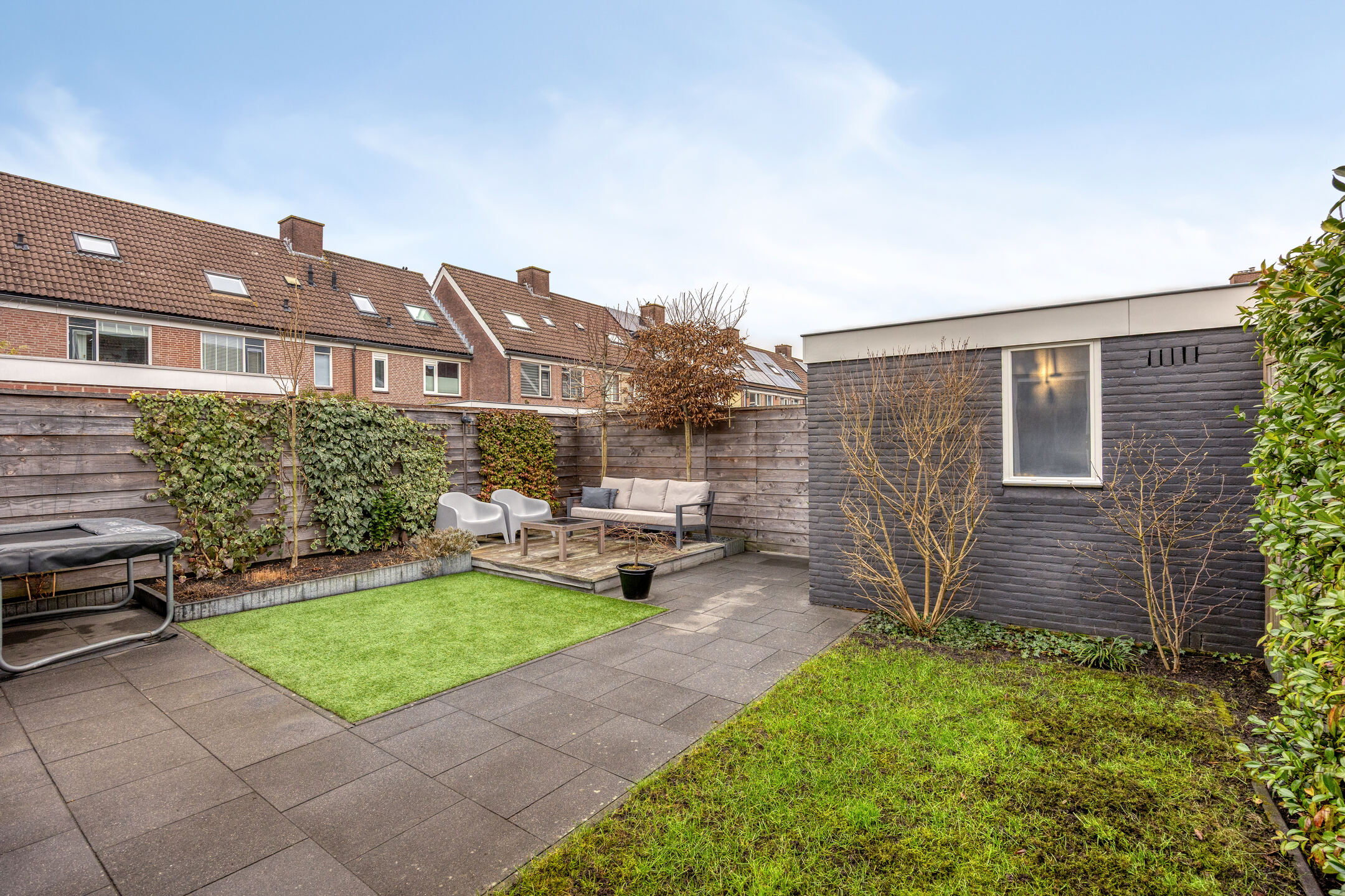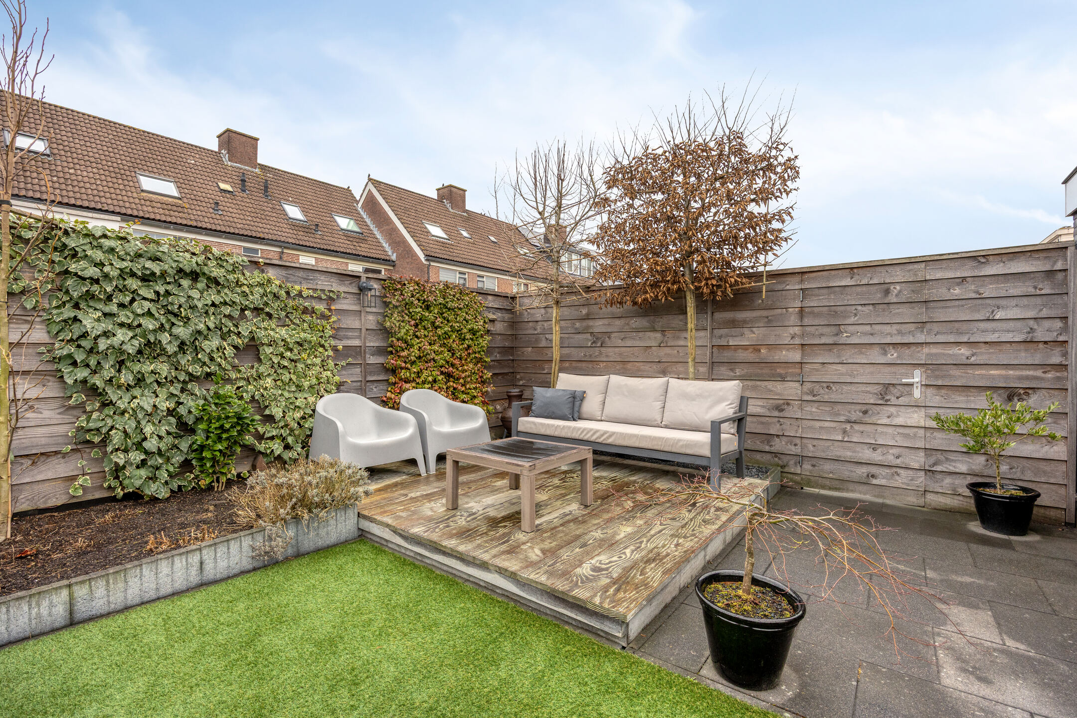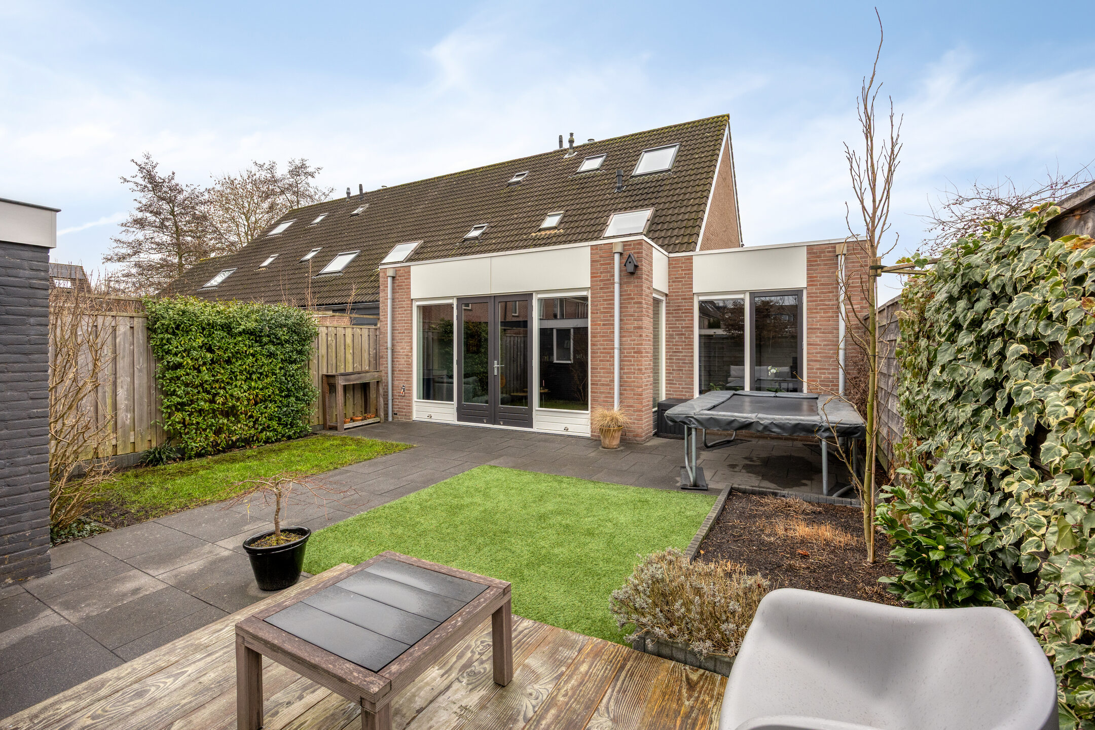 De achtertuin is ruim en zonnig en praktisch ingericht met een combinatie van terras en groen. Er is voldoende ruimte om meerdere zitplekken te creëren en in alle rust van het buitenleven te genieten.