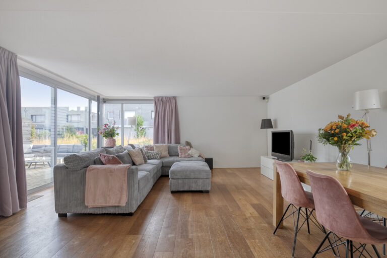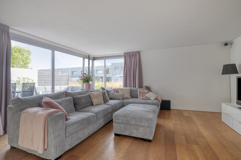 De woonkamer voelt ruim en uitnodigend aan door de grote glas pui en extra raam in de zijgevel. Ook de breedte van de woning is hier goed voelbaar.