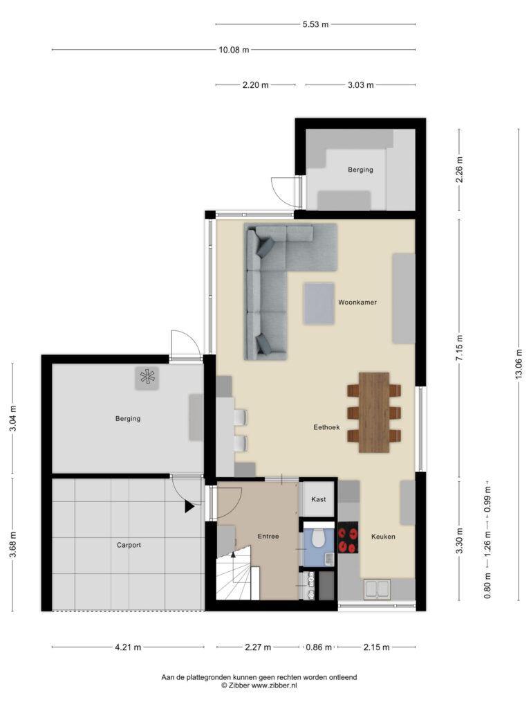 Aan de voorzijde van de woning bevindt zich een carport, zodat je altijd droog kunt parkeren. Vanuit de carport heb je direct toegang tot de ruime inpandige berging van circa 13 m².