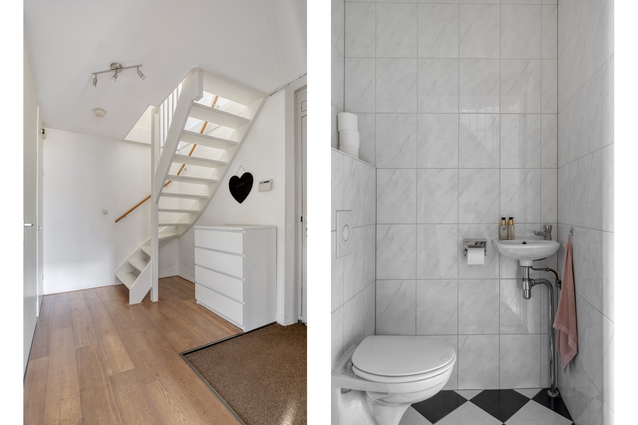 Je komt binnen in de ruime hal met de meterkast, toiletruimte en een open trap naar de verdieping.