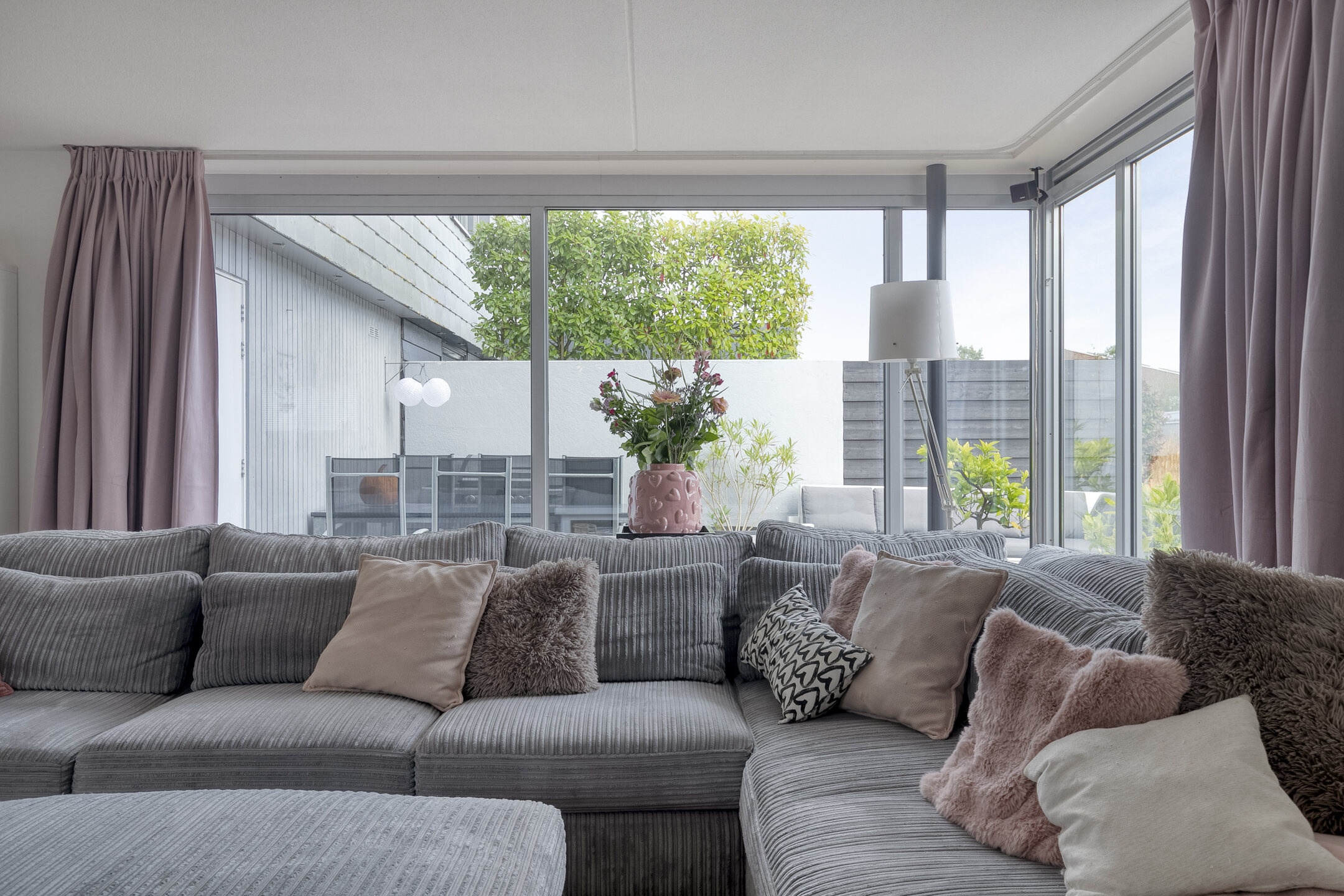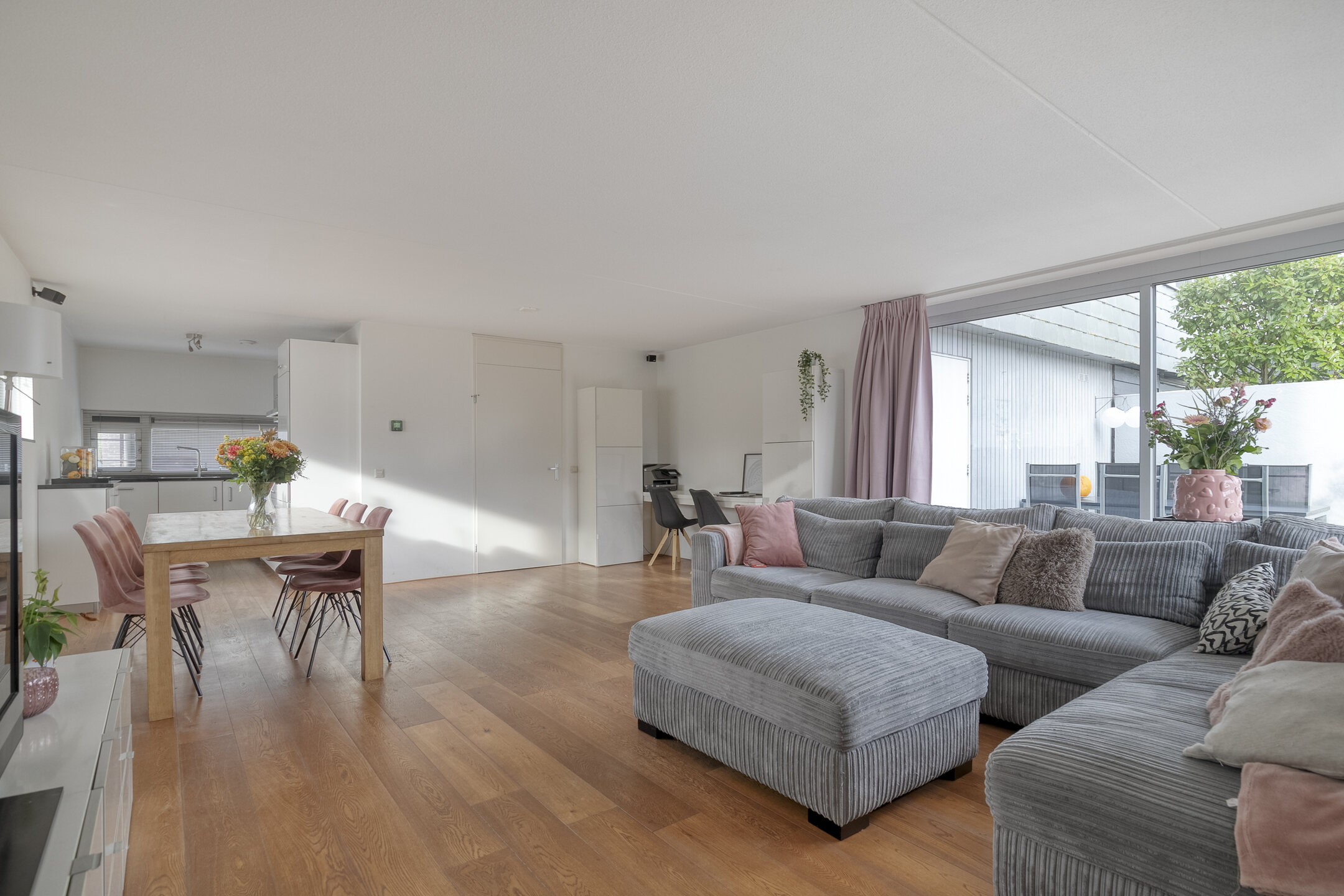 De woonkamer voelt ruim en uitnodigend aan door de grote glas pui en extra raam in de zijgevel. Ook de breedte van de woning is hier goed voelbaar.