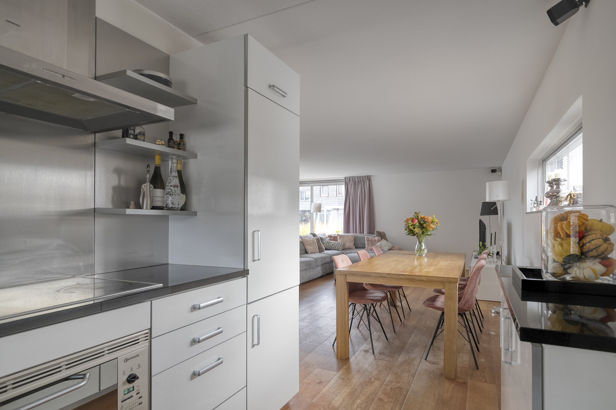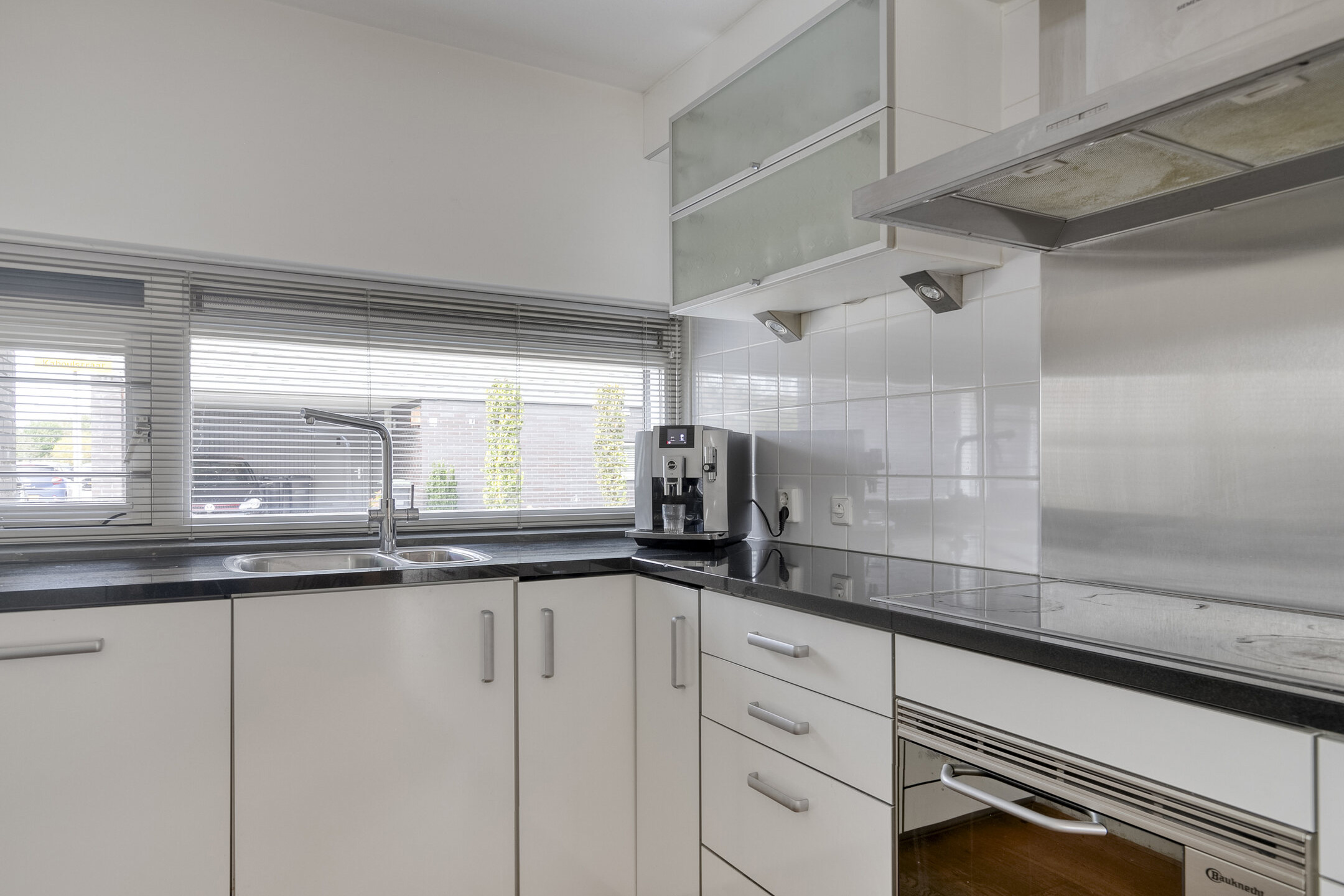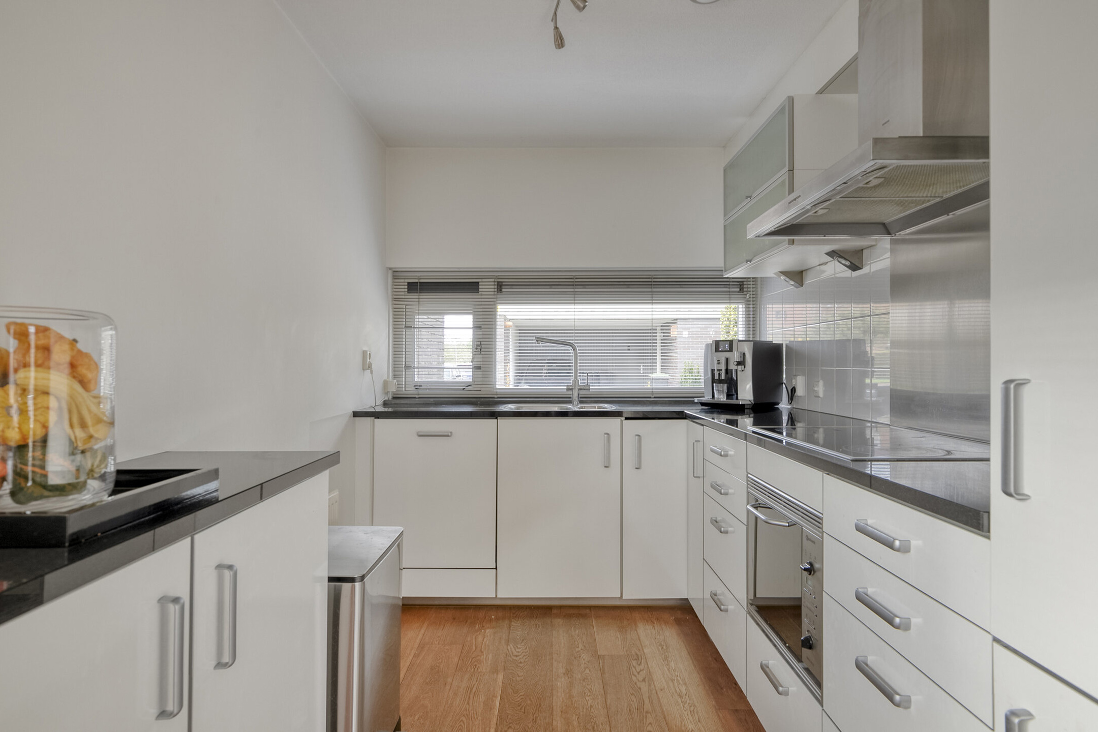 De keuken bevindt zich aan de voorzijde van de woning en kijkt uit over de rustige straat.