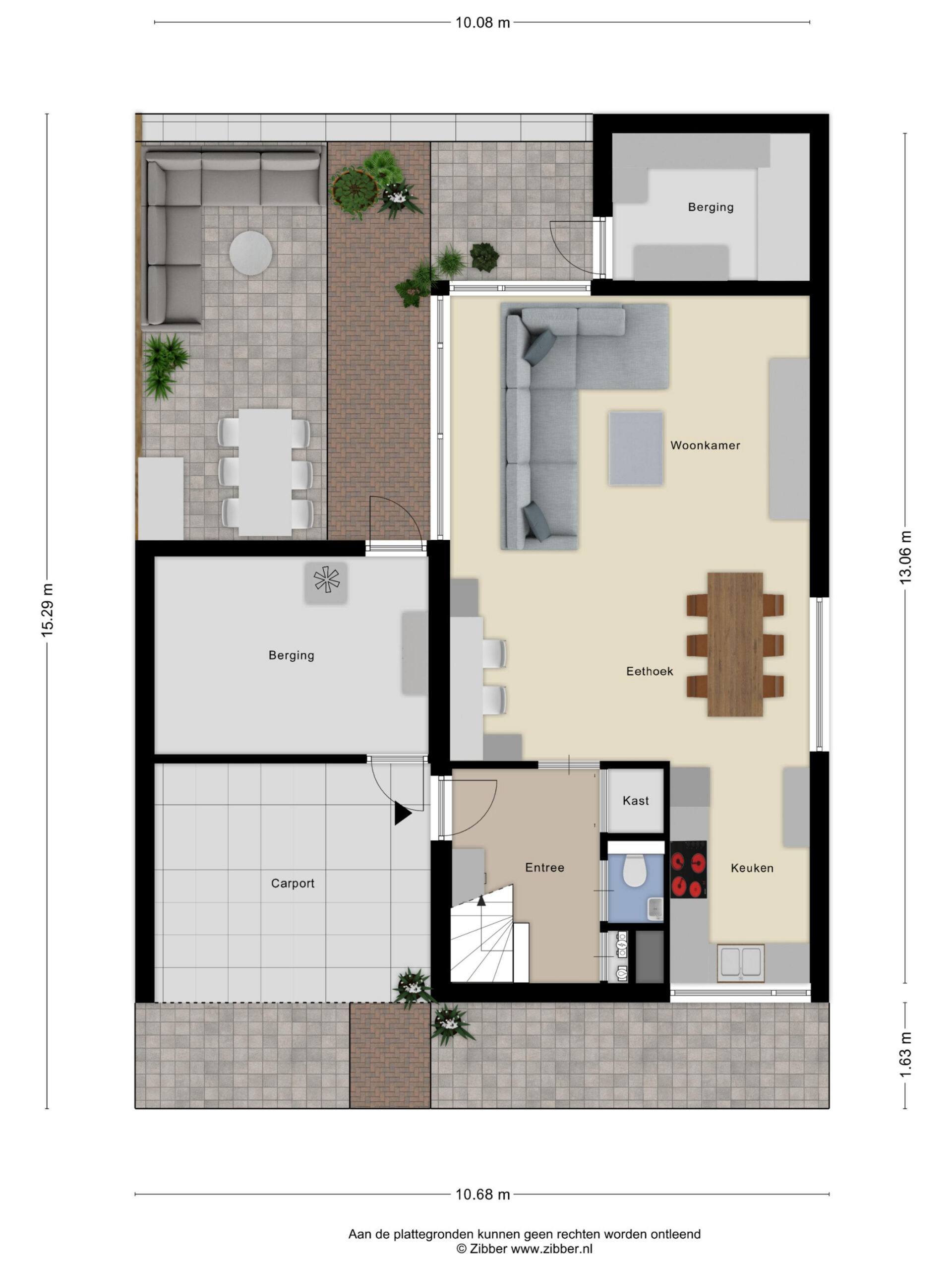 Aan de voorzijde van de woning bevindt zich een carport, zodat je altijd droog kunt parkeren. Vanuit de carport heb je direct toegang tot de ruime inpandige berging van circa 13 m².