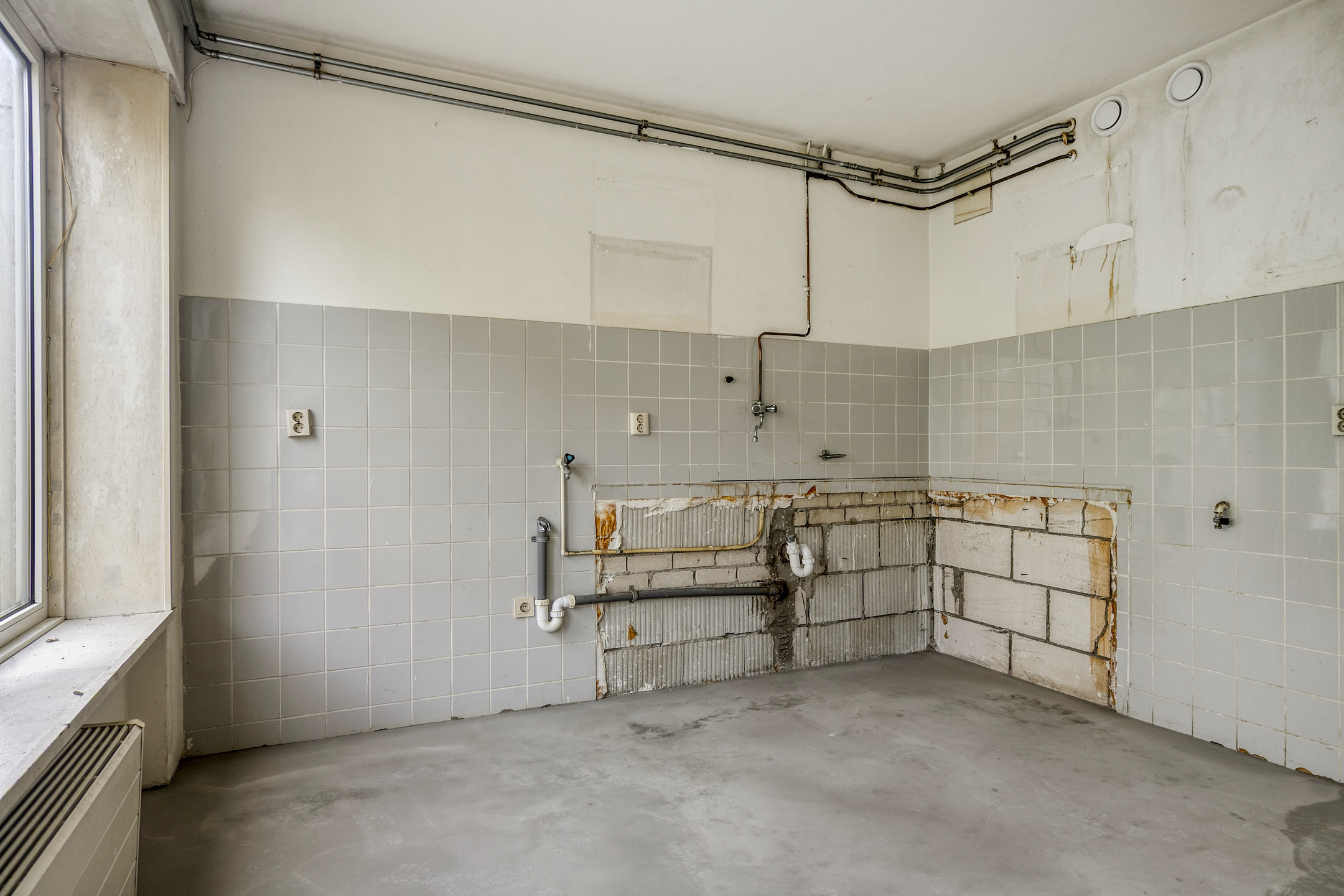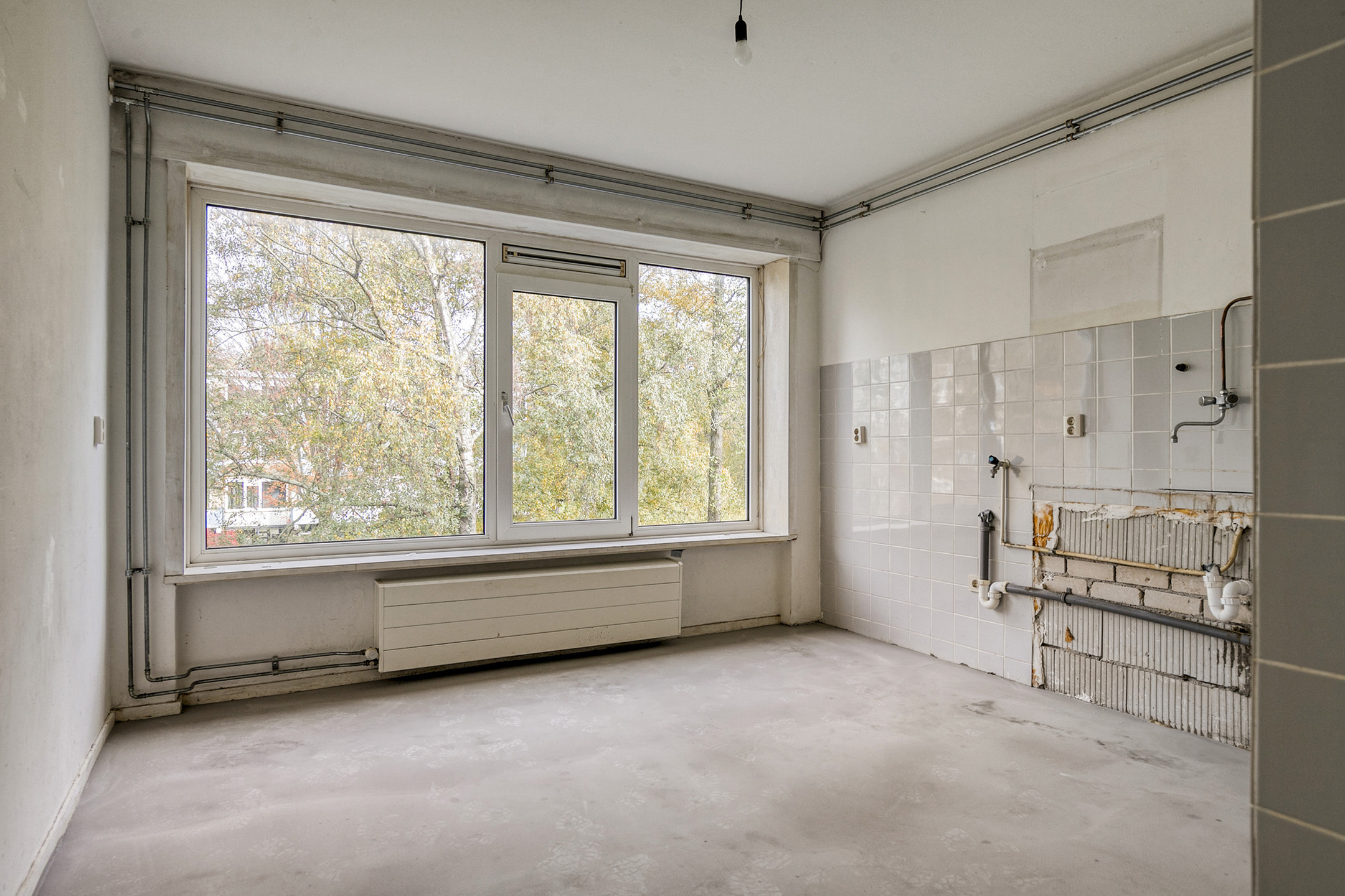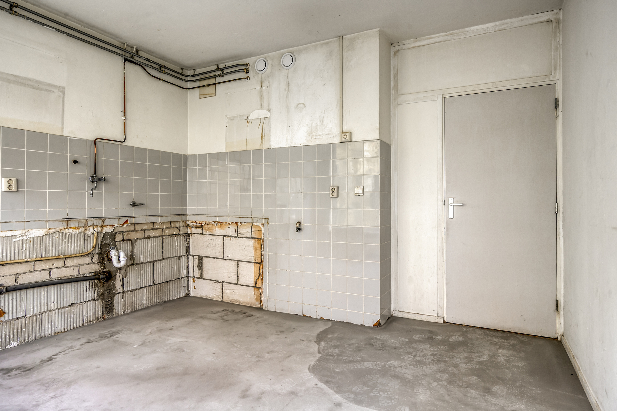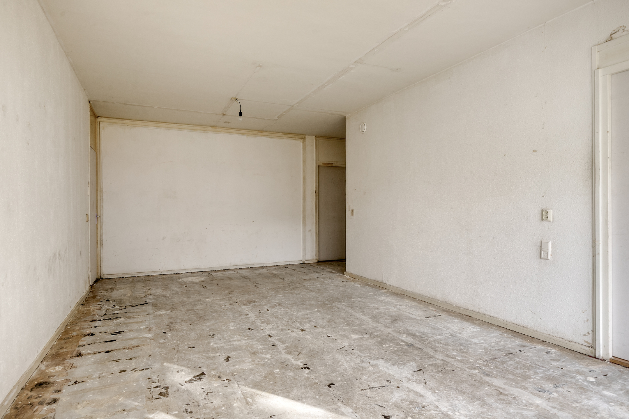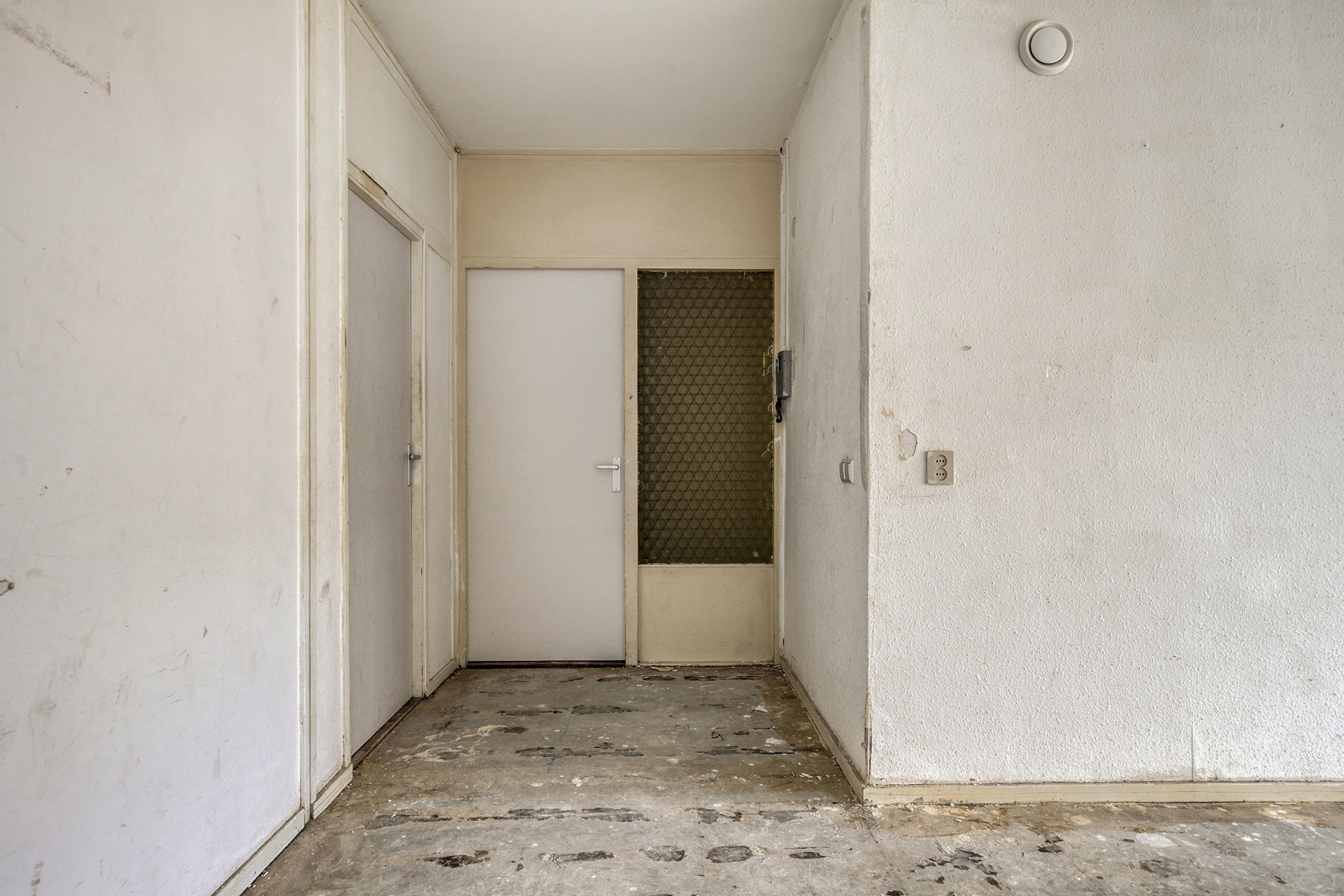 Entree met meterkast en toegang tot de woonkamer. Aan de rechterzijde bevindt zich de woonkeuken van circa 14 m², waar naar eigen smaak een nieuwe keuken kan worden geplaatst.