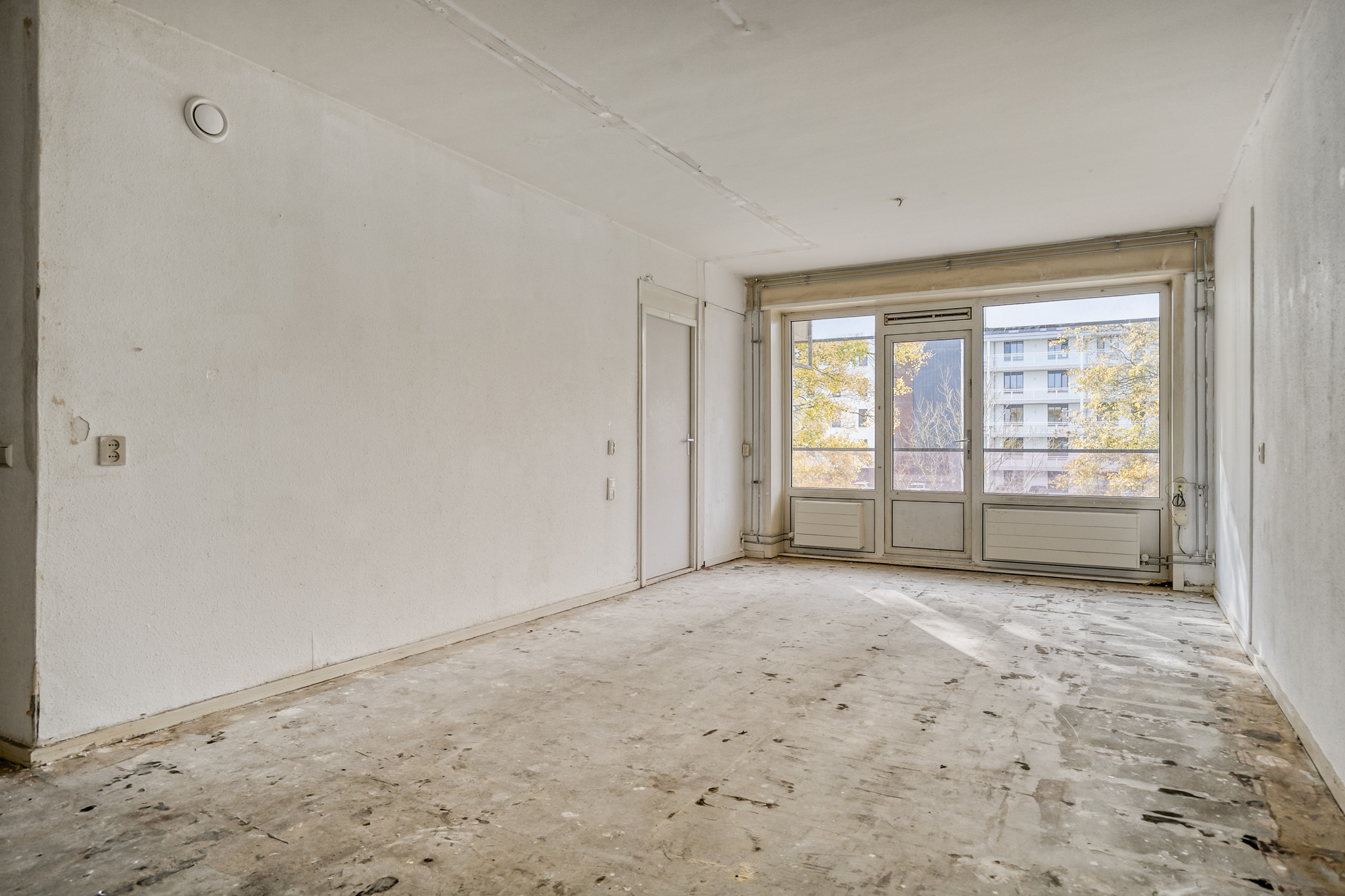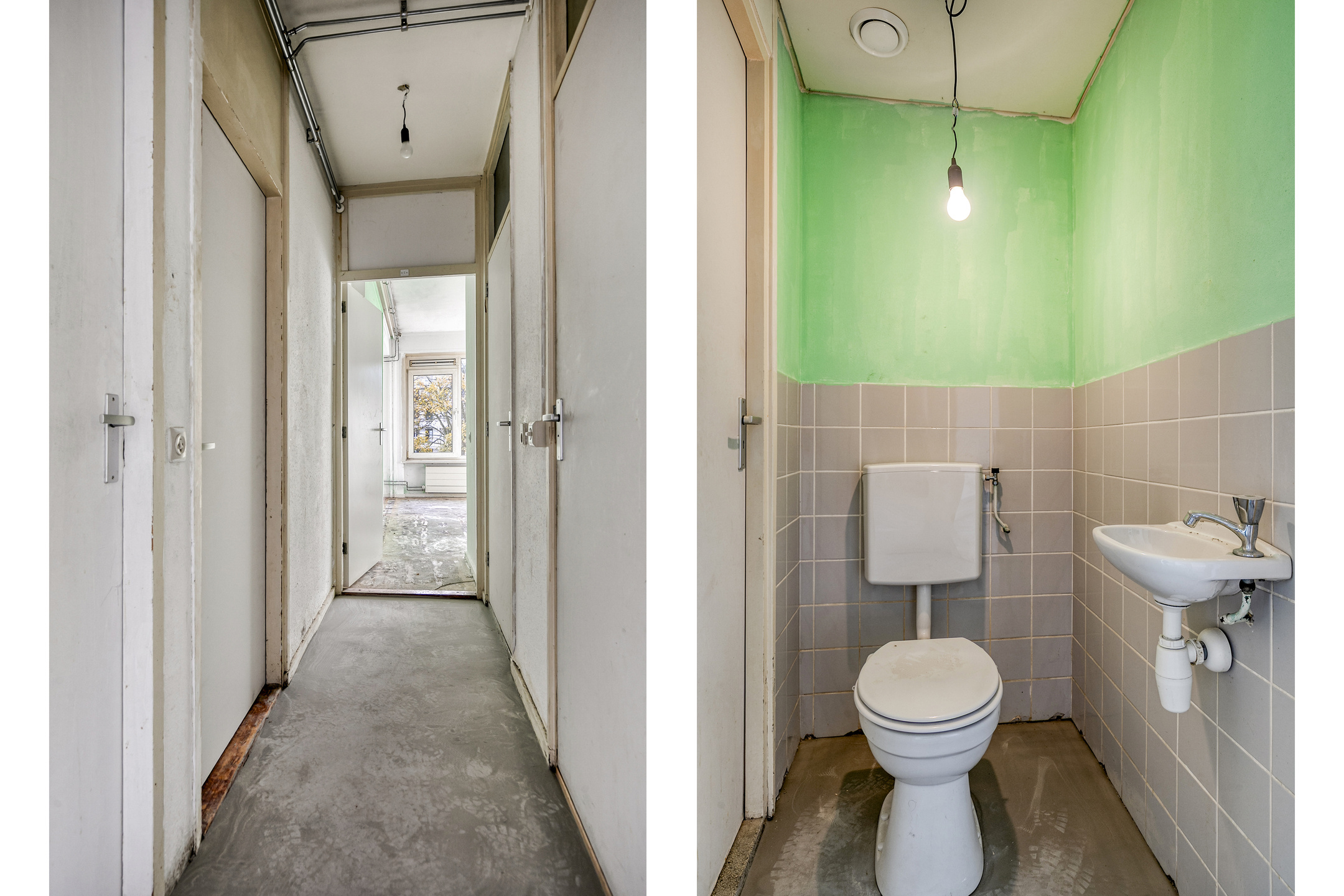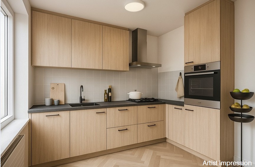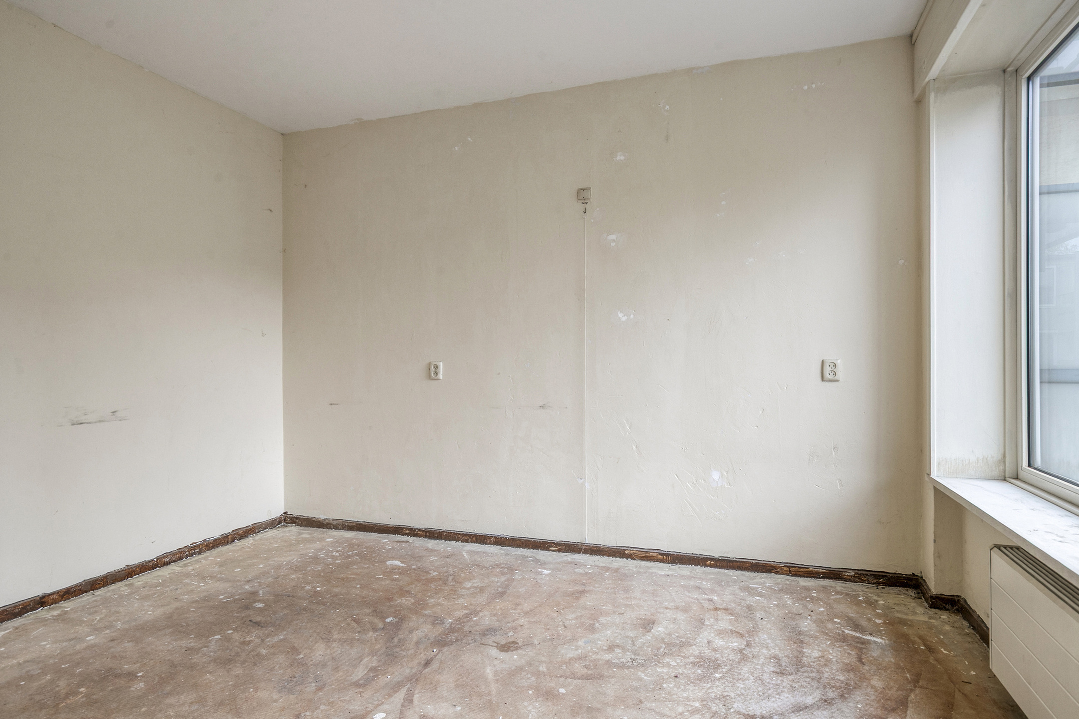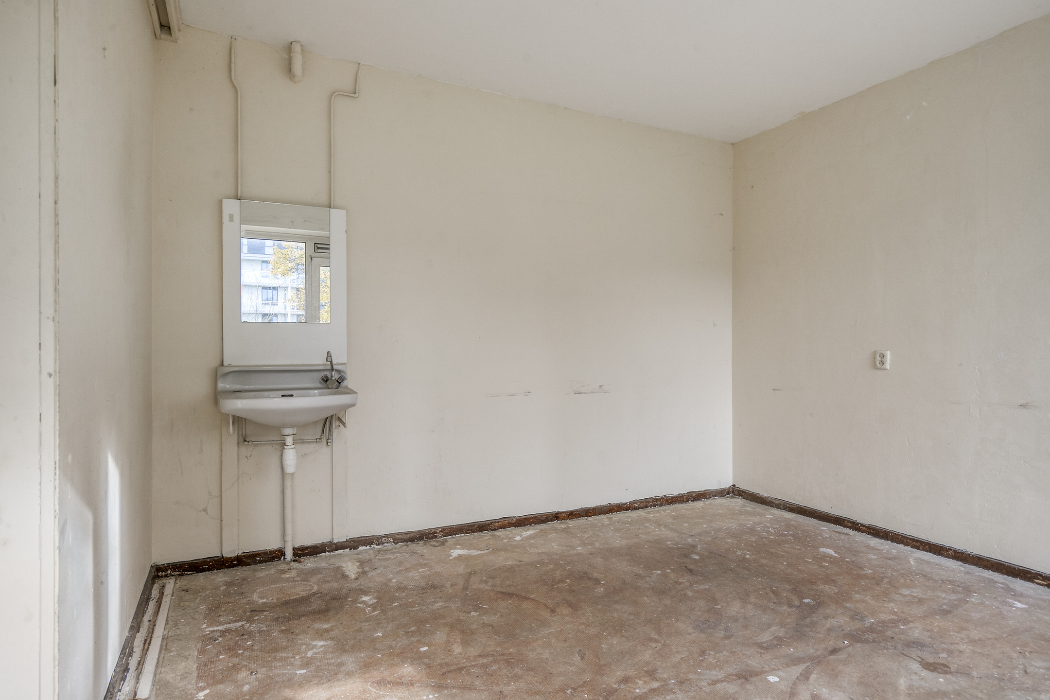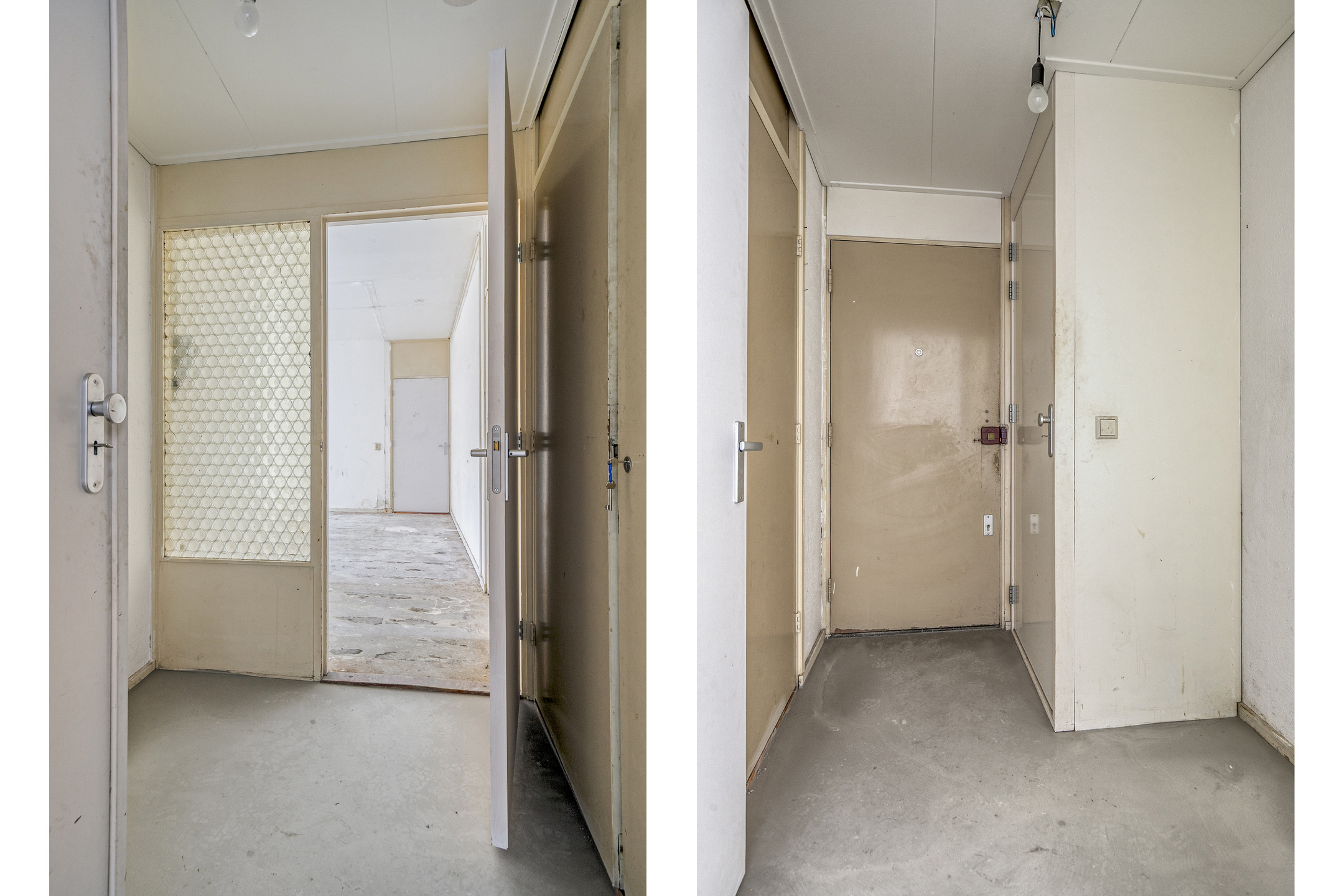 Entree met meterkast en toegang tot de woonkamer. Aan de rechterzijde bevindt zich de woonkeuken van circa 14 m², waar naar eigen smaak een nieuwe keuken kan worden geplaatst.