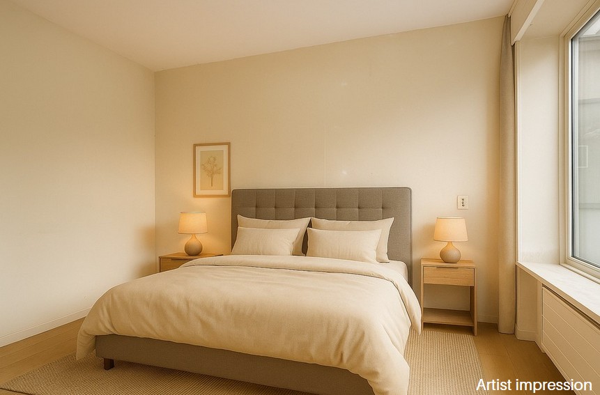 Direct aangrenzend aan de woonkamer ligt slaapkamer 1 (circa 14,4 m²), voorzien van een wastafel.