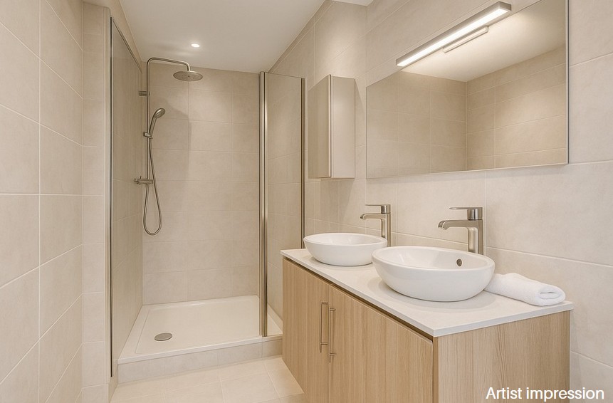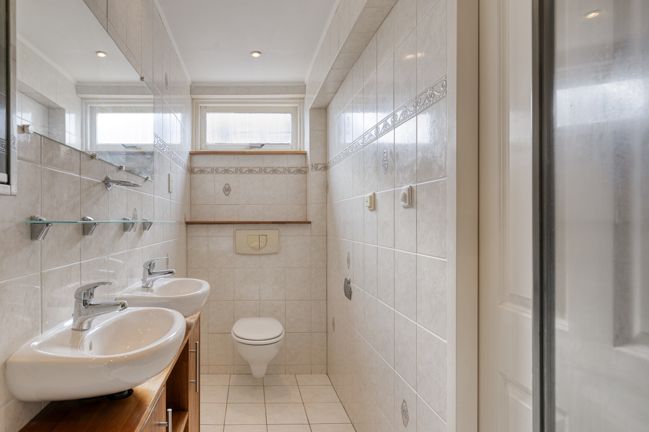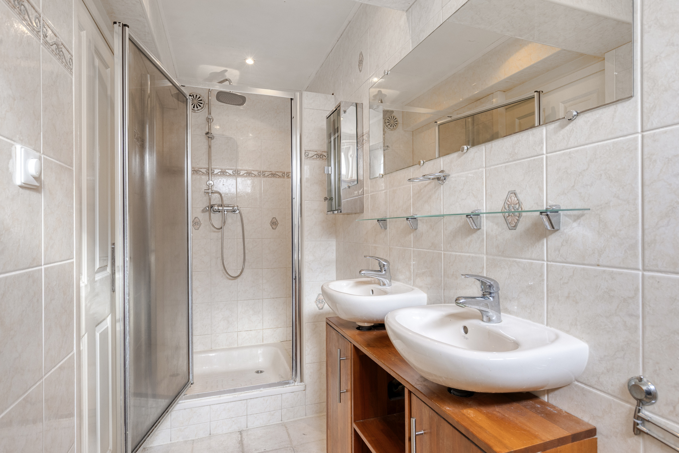 Overloop met toegang tot twee ruime slaapkamers aan de achterzijde van de woning. De badkamer is voorzien van een dubbele wastafel, een inloopdouche en een toilet.