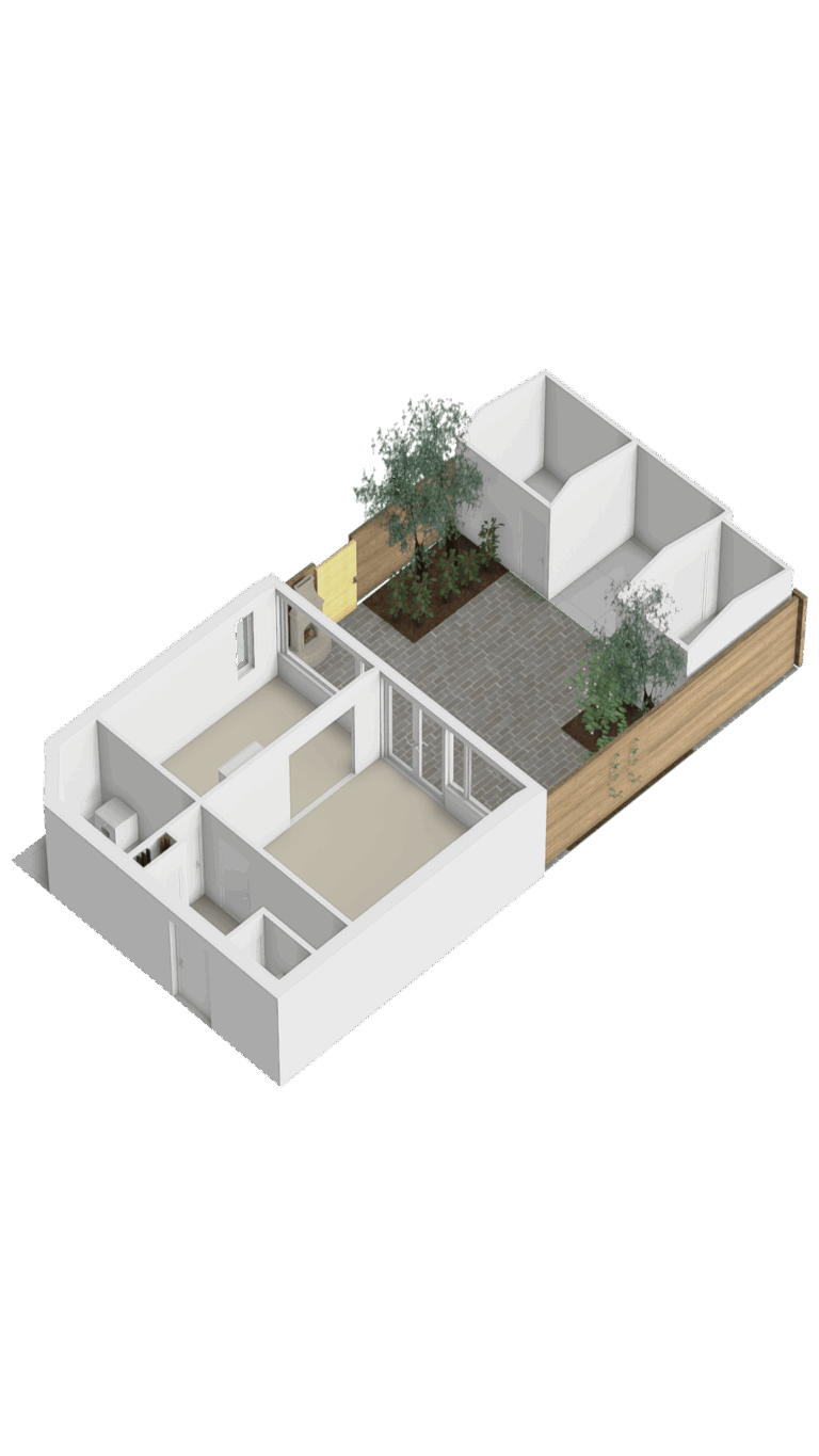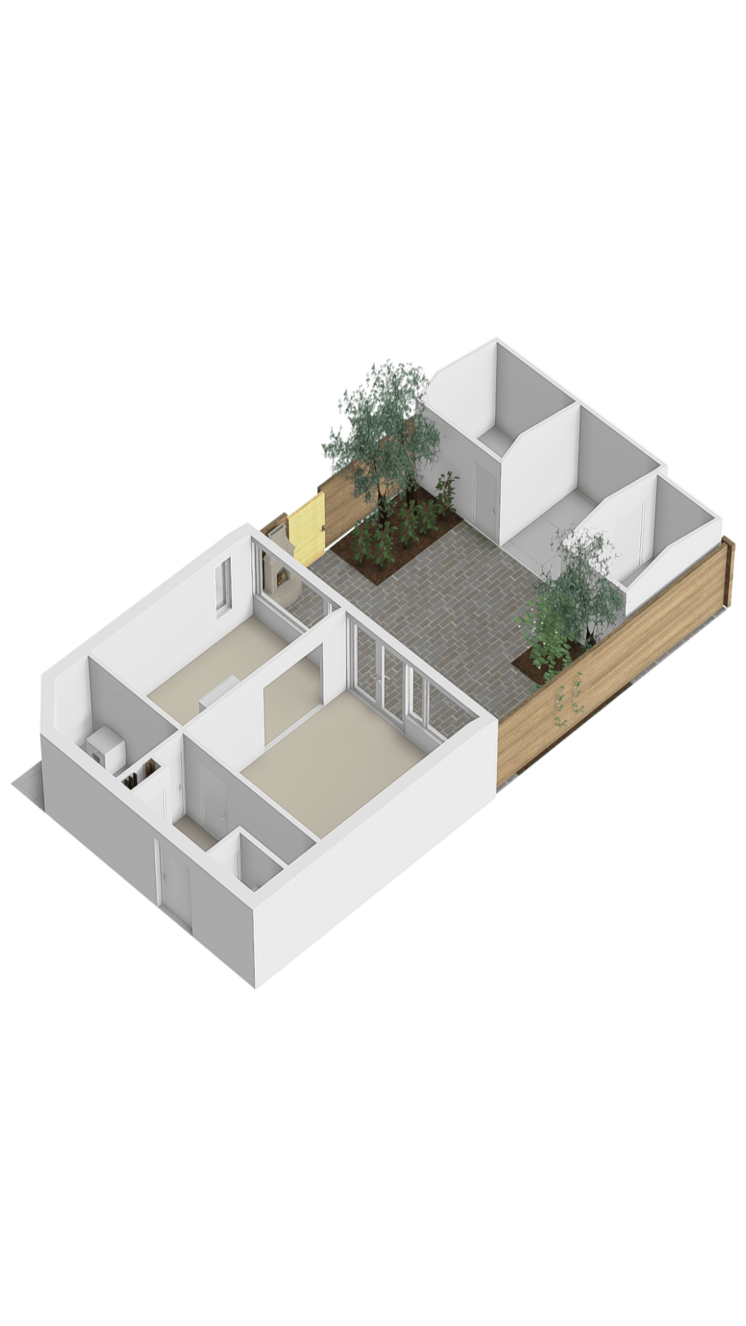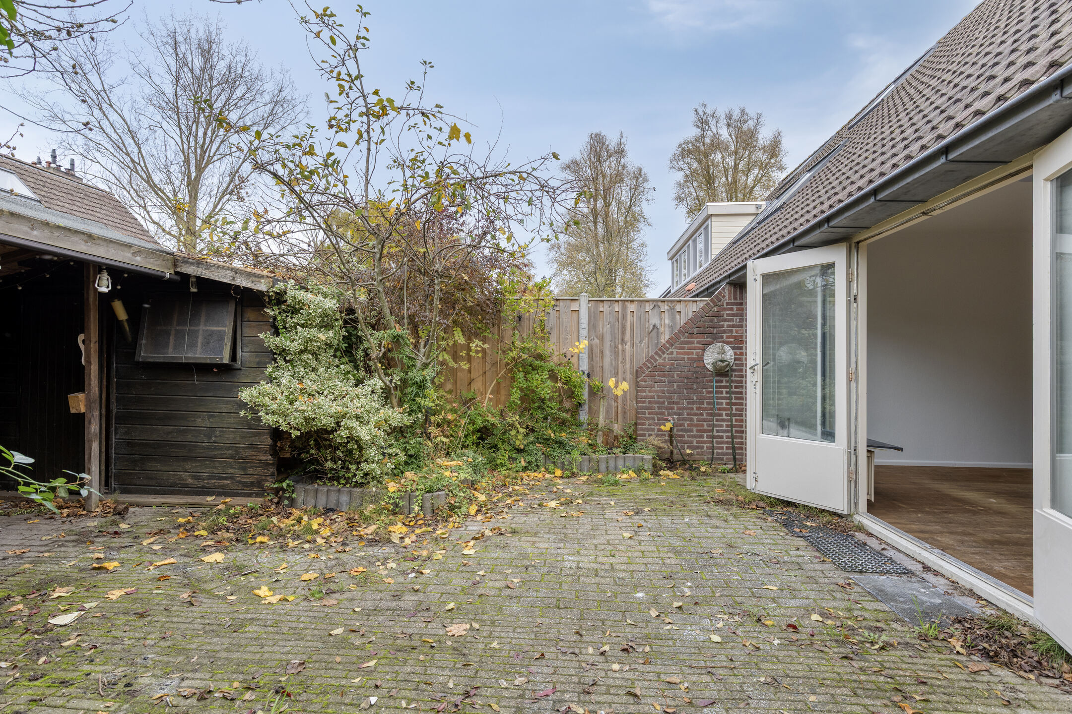 De achtertuin is diep en grotendeels bestraat, waardoor je voldoende ruimte hebt voor een comfortabele loungeset of een speelgedeelte.