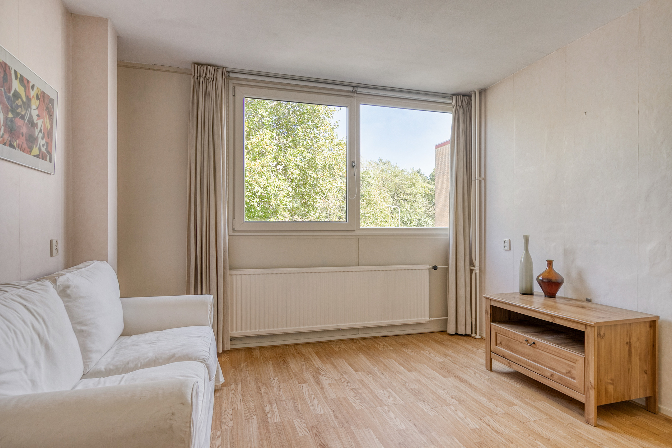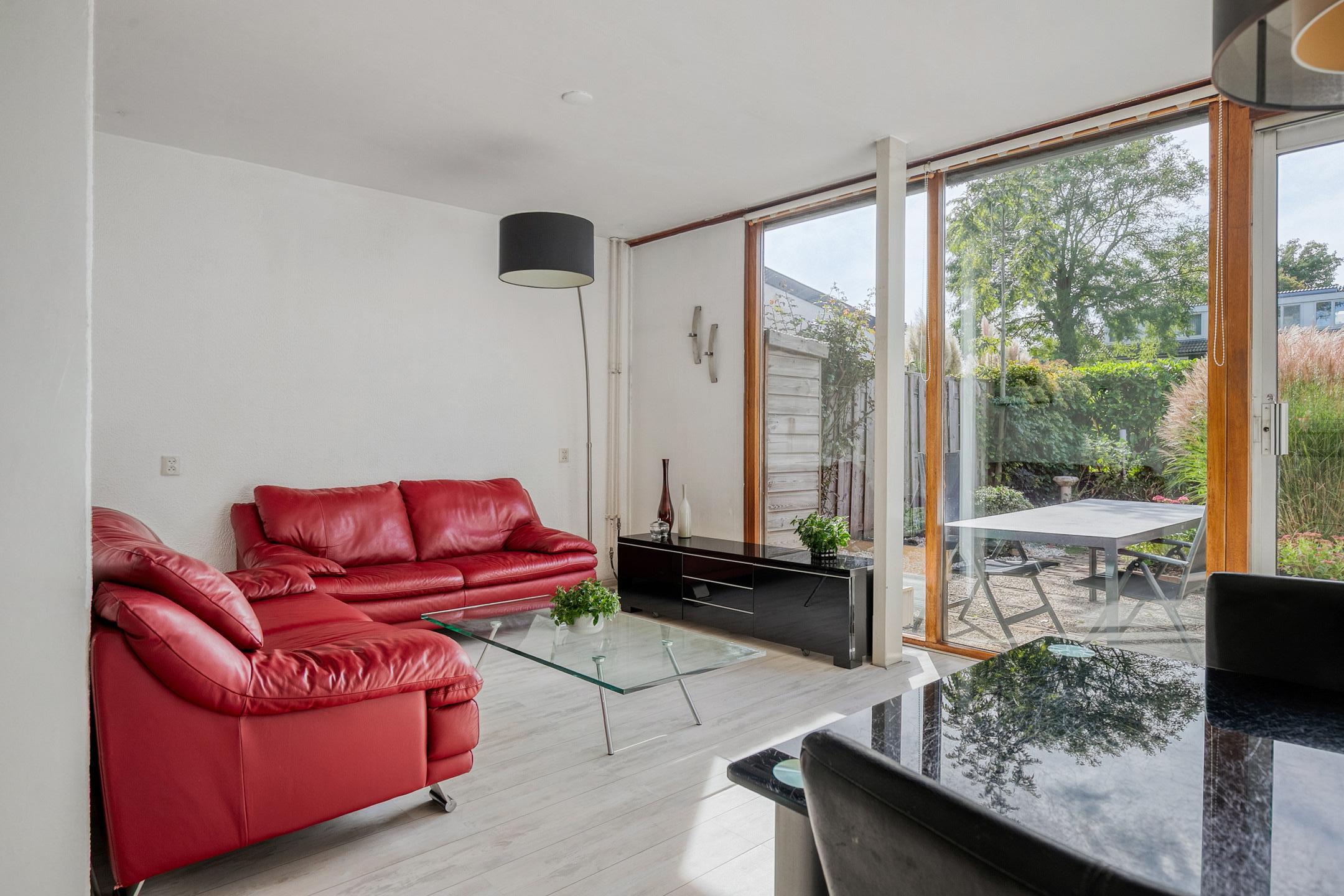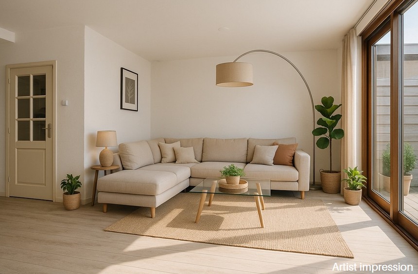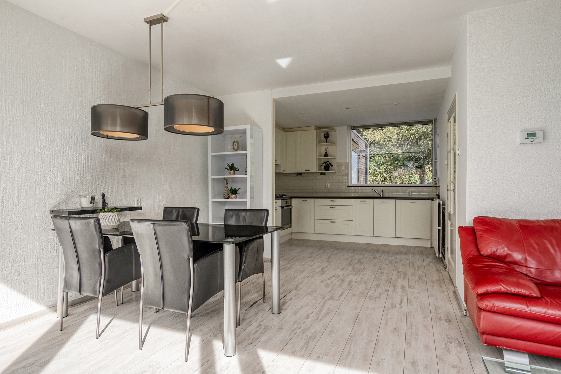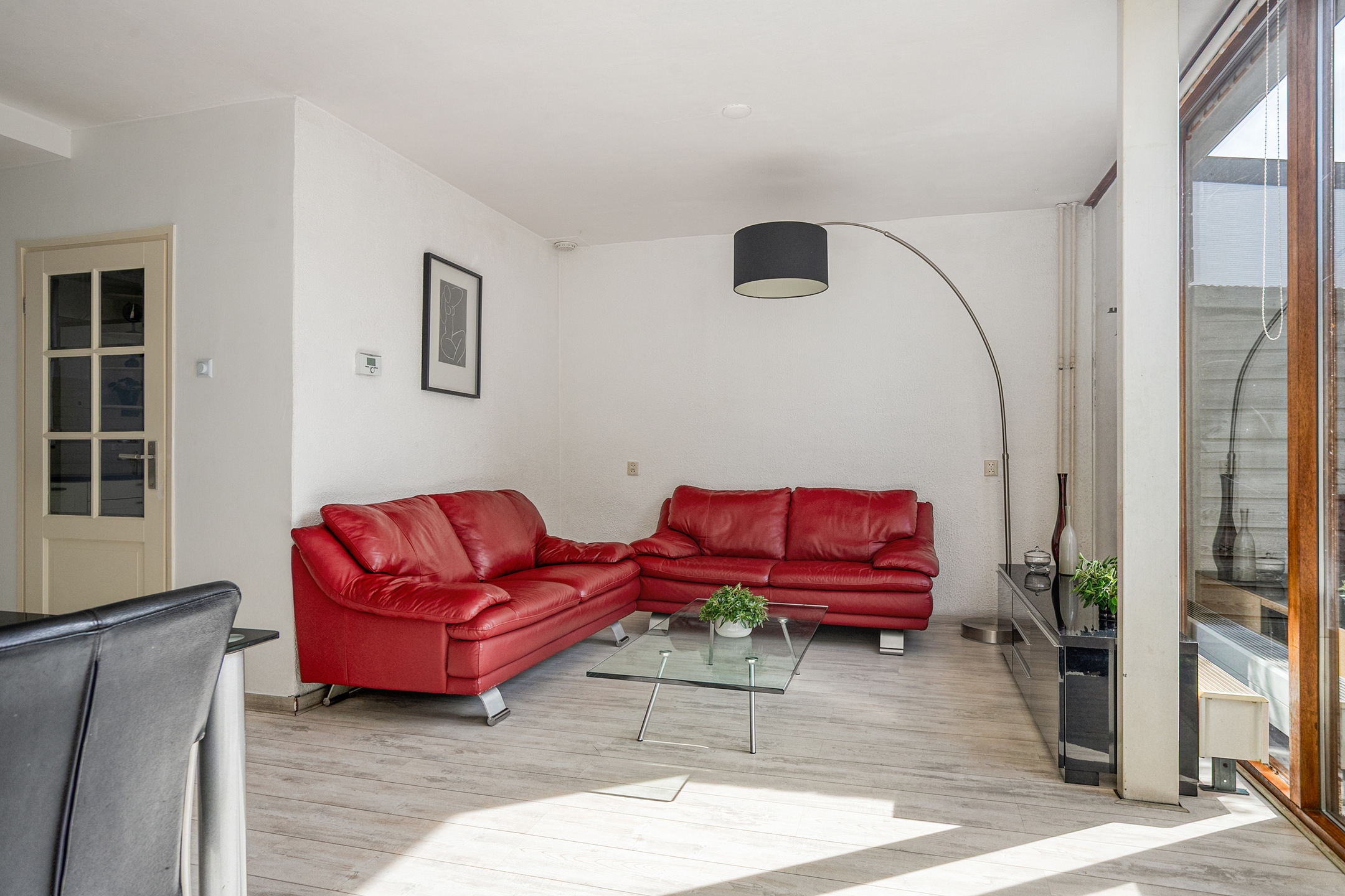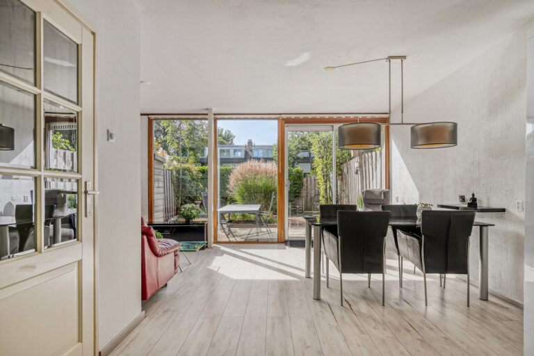 De woonkamer voelt licht en prettig aan. Hier is volop ruimte voor een gezellige zithoek. Via de schuifpui staat de woonkamer is er een directe verbinding met de achtertuin, waardoor binnen en buiten mooi in elkaar overlopen.