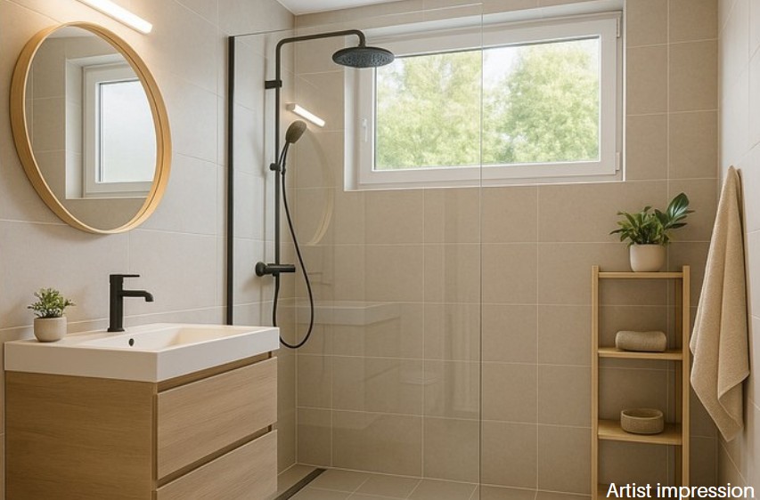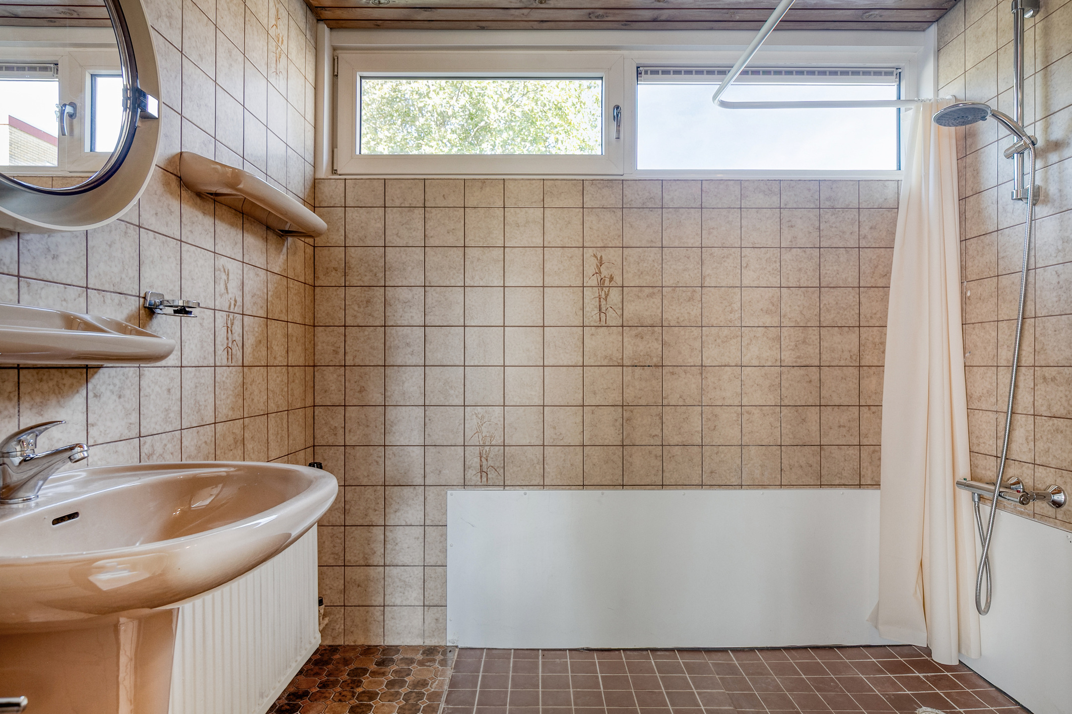 De badkamer is eenvoudig van opzet en voorzien van een wastafel, douche en tweede toilet. Een mooie ruimte die je naar eigen wens kunt moderniseren.