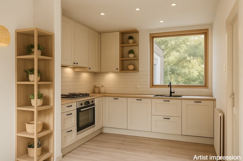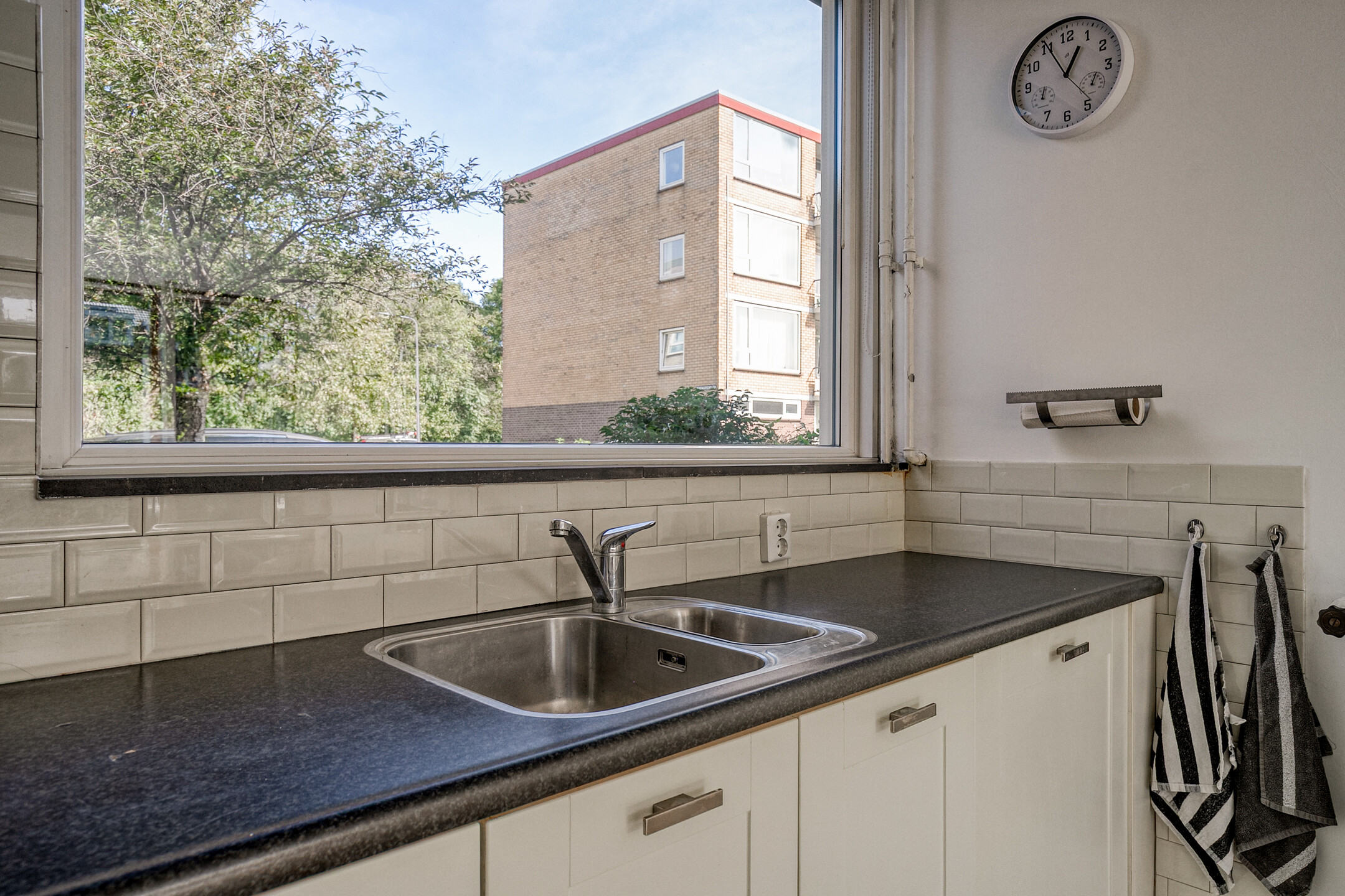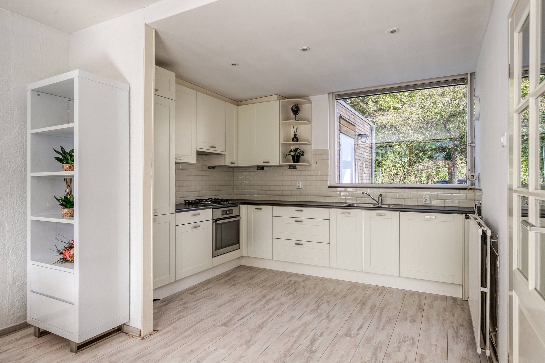 De keuken bevindt zich aan de voorzijde van de woning en kijkt uit over de straat. De keuken is netjes onderhouden en uitgerust met diverse inbouwapparatuur, waaronder een combimagnetron, fornuis, aansluiting voor een vaatwasser en een koelkast.