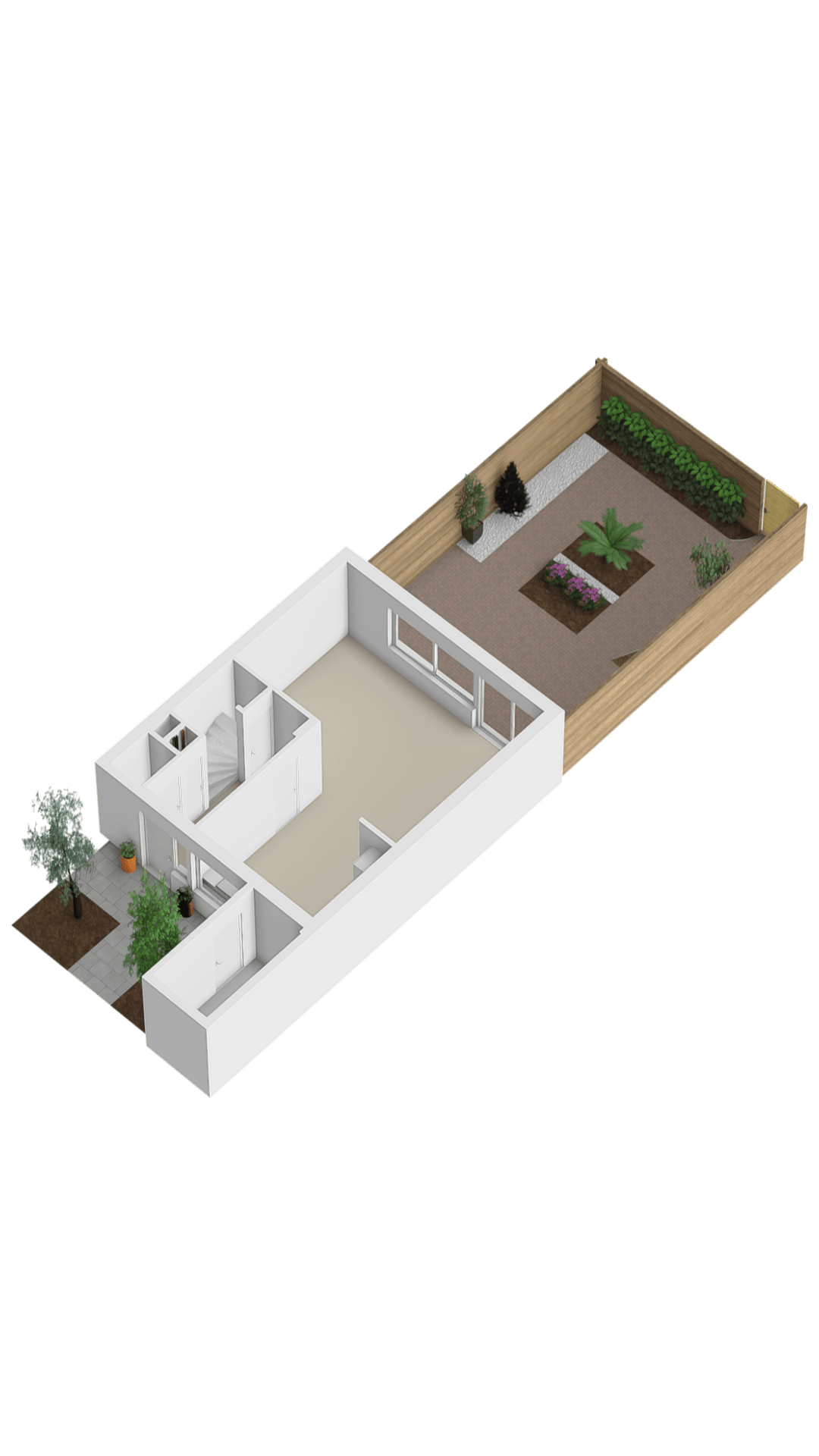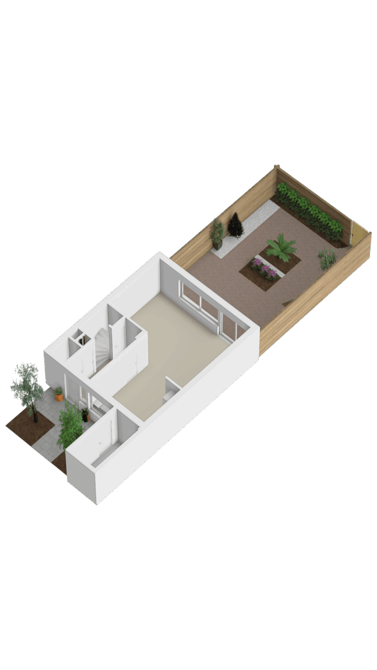 Aan de voorzijde van de woning ligt een verzorgde voortuin die toegang biedt tot de externe berging. Ideaal voor het opbergen van spullen of het stallen van fietsen.