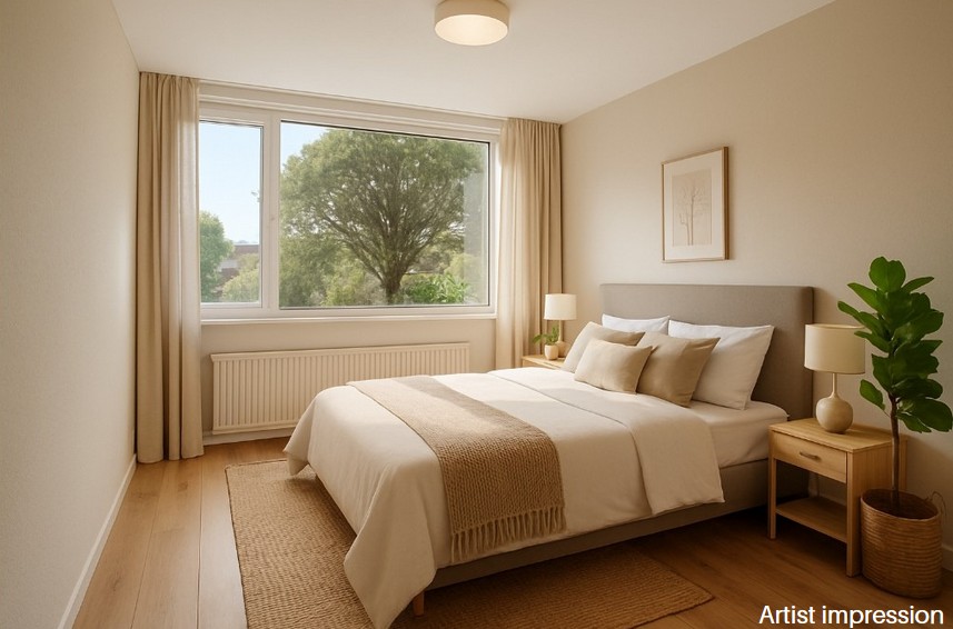De overloop biedt toegang tot drie slaapkamers, die stuk voor stuk licht en ruim aanvoelen. De kamers zijn praktisch ingedeeld en daardoor flexibel te gebruiken als slaapkamer, thuiskantoor of hobbyruimte.
