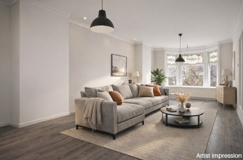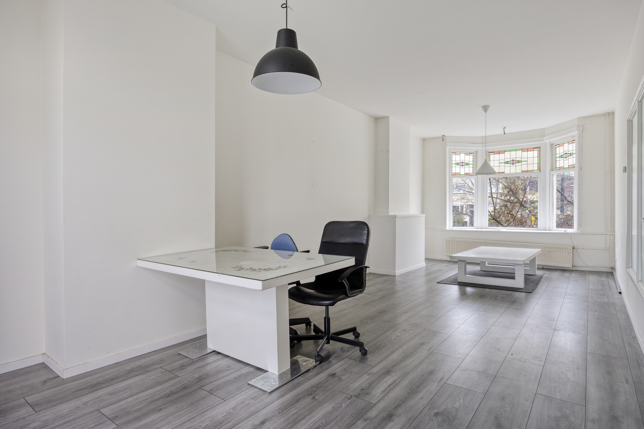 Overloop met toegang tot de verschillende vertrekken. De ruime woonkamer is gelegen aan de voorzijde van de woning en biedt volop ruimte voor een comfortabele zithoek en een royale eethoek. Grote raampartijen zorgen voor veel daglicht en een prettige sfeer.