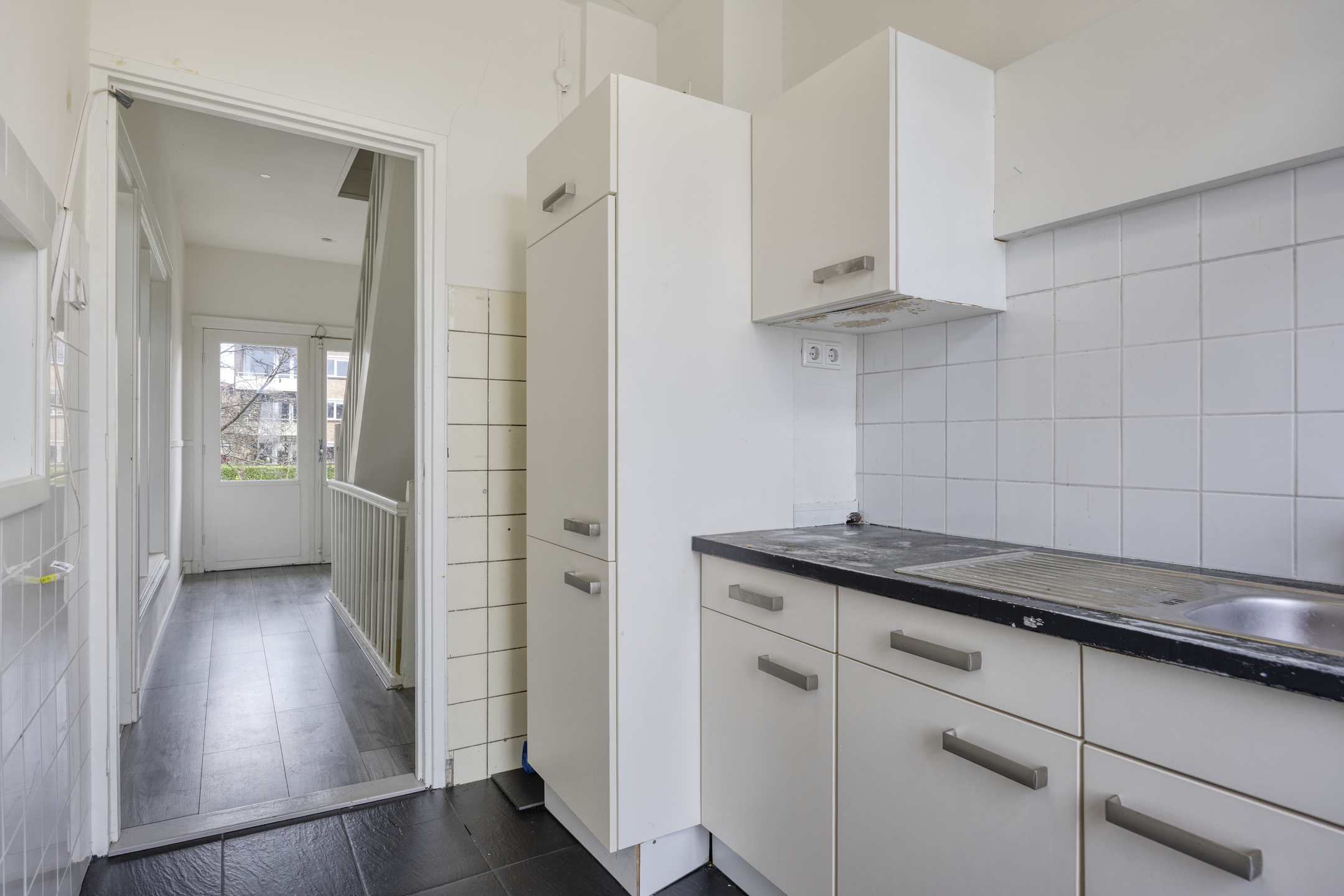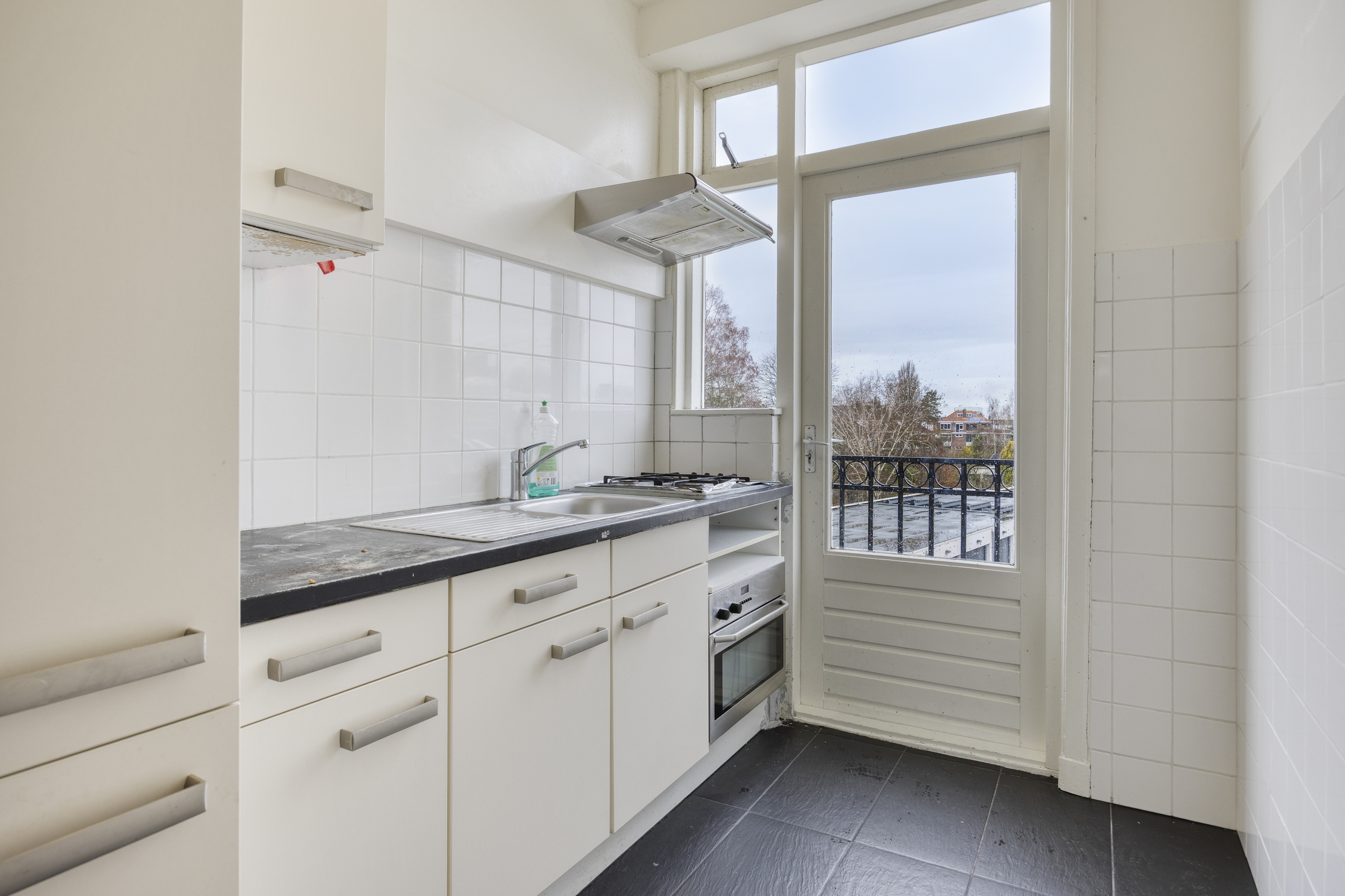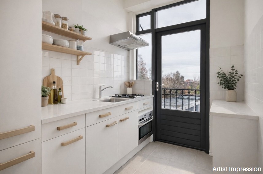De keuken bevindt zich aan de achterzijde en is praktisch ingericht. Vanuit de keuken is er directe toegang tot het balkon aan de achterzijde, een fijne plek om buiten te zitten.