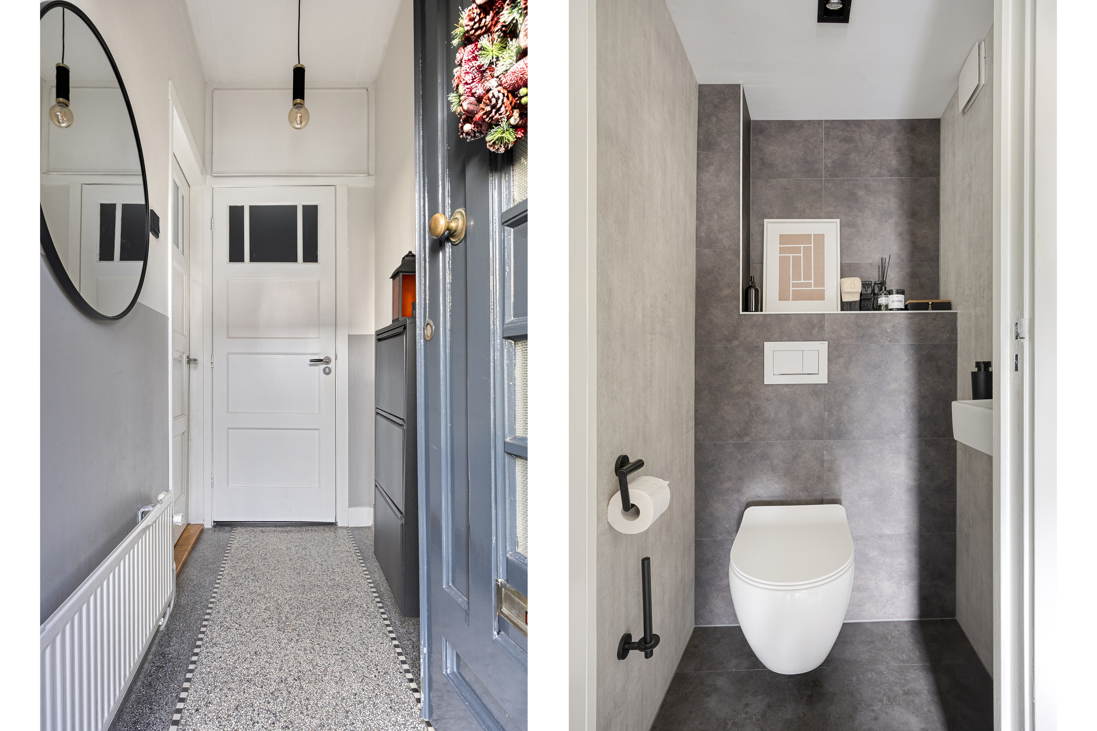 Via de entree kom je in de hal met een mooie terrazzovloer en moderne toiletruimte.