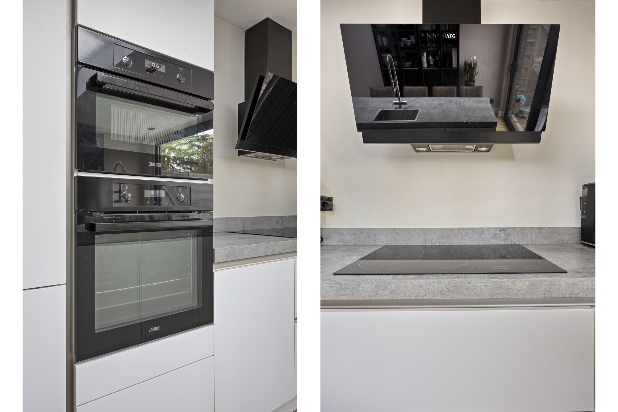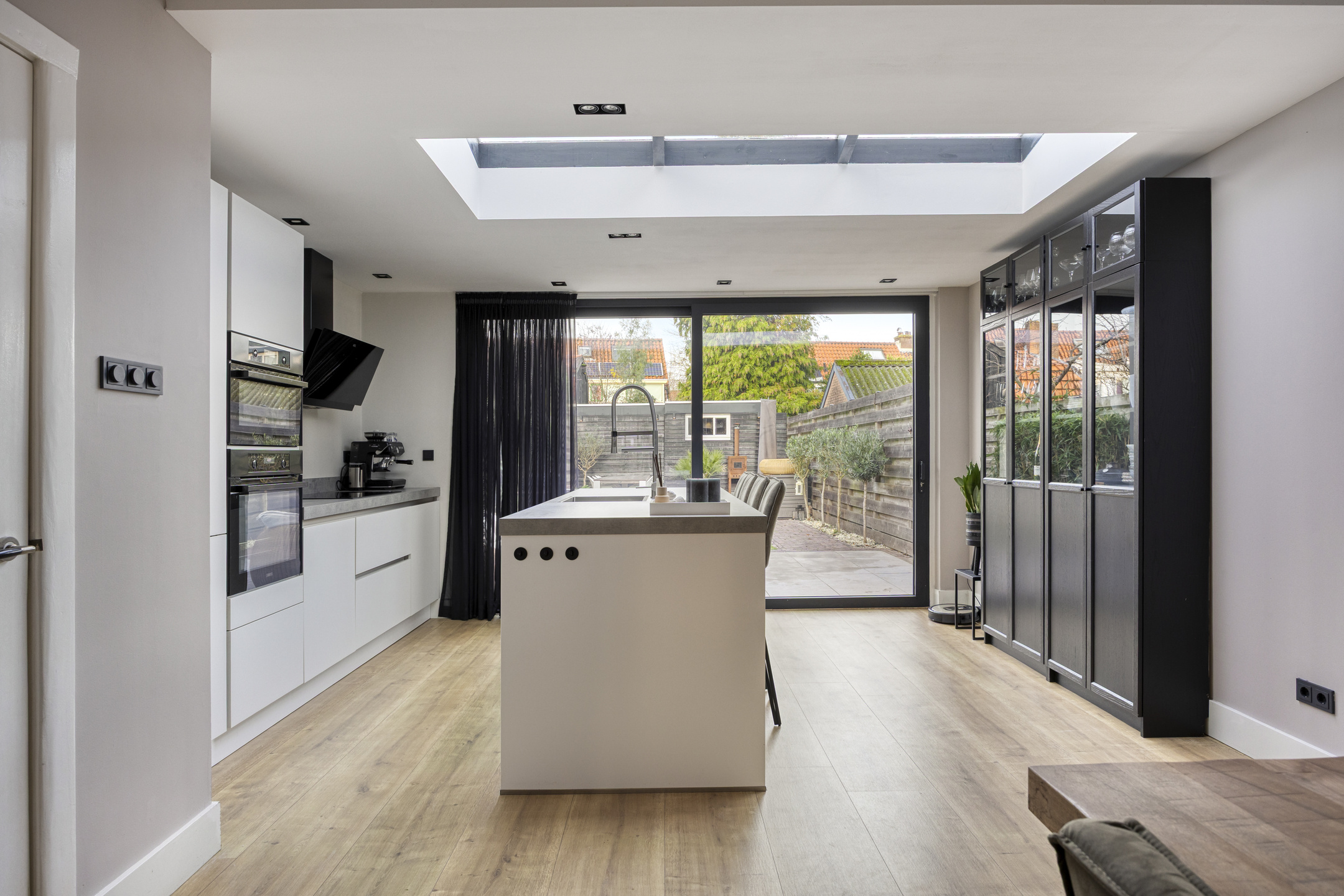 De keuken is uitgerust met o.a. inductie, afzuigkap, koelkast, aparte vrieskast, oven en combi-oven. Het moderne keukeneiland met bar is voorzien van een kokendwaterkraan, vaatwasser en zelfs een wijnklimaatkast, wat deze ruimte tot een echte blikvanger maakt.