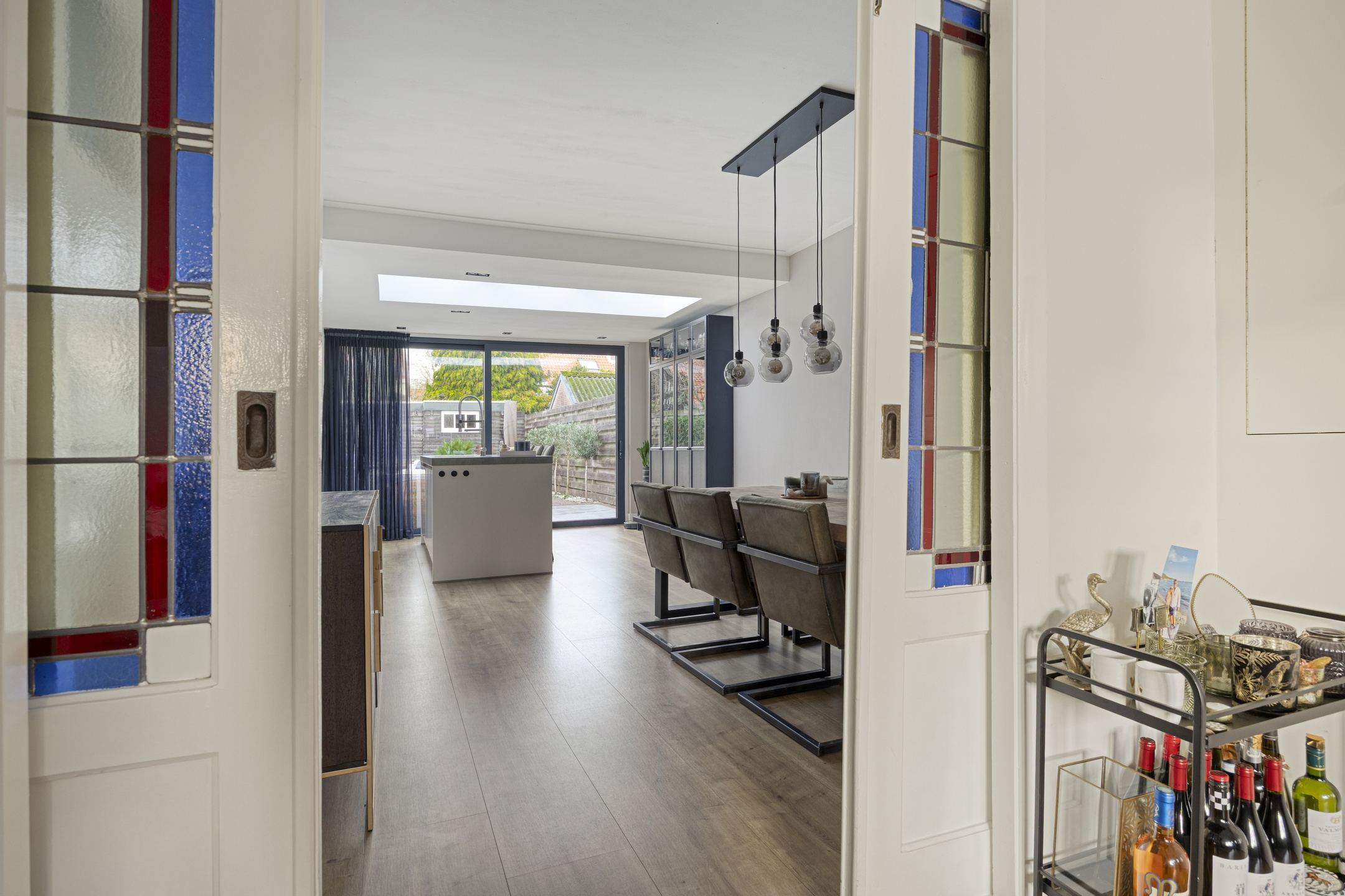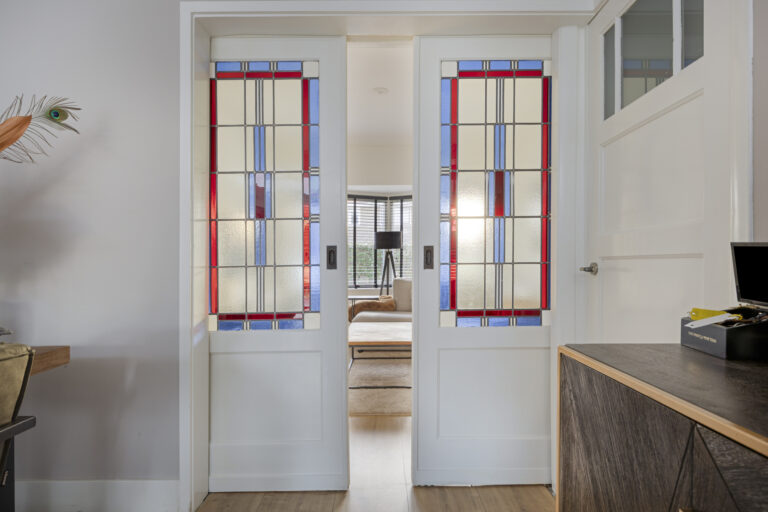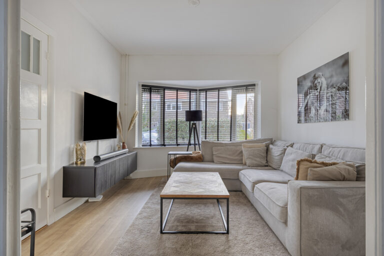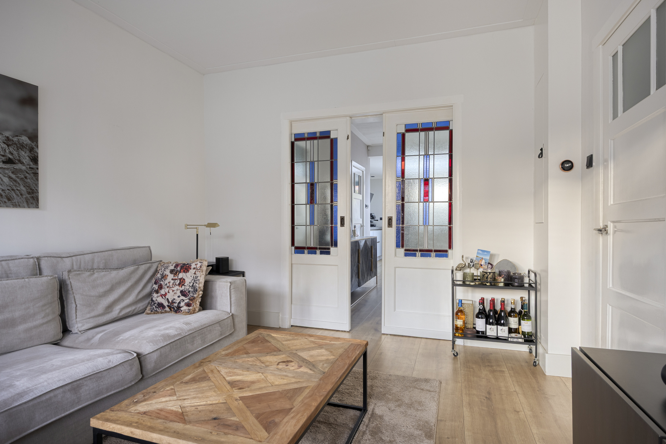 Vanuit hier betreed je de sfeervolle woonkamer, waar in 2020 een fraaie modernisering heeft plaatsgevonden met behoud van de geliefde jaren ’30 details, zoals de erker aan de voorzijde en de karakteristieke en suite deuren met glas-in-lood.