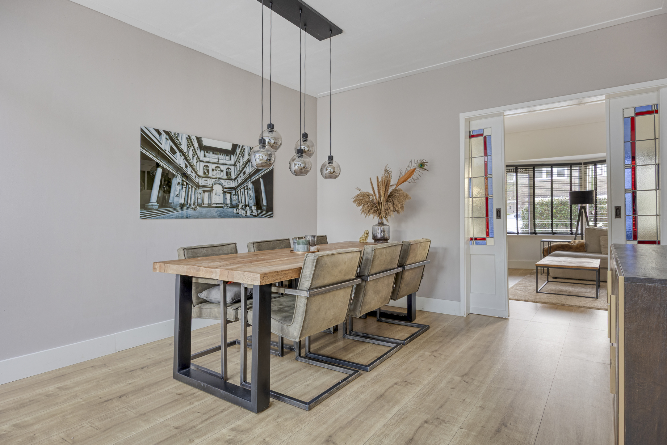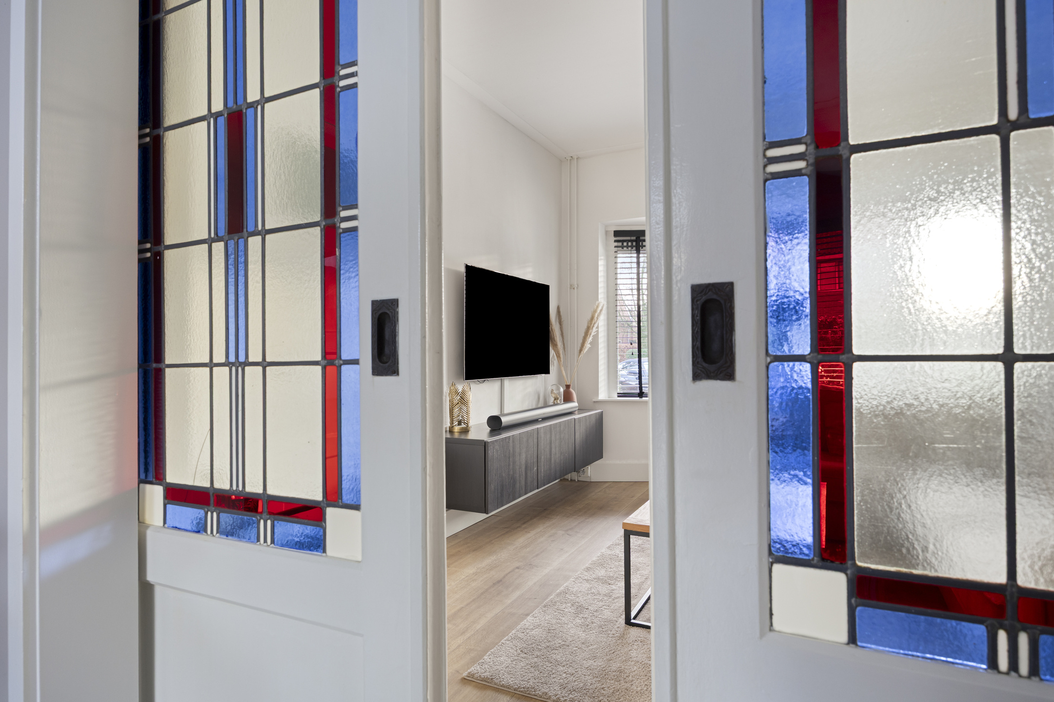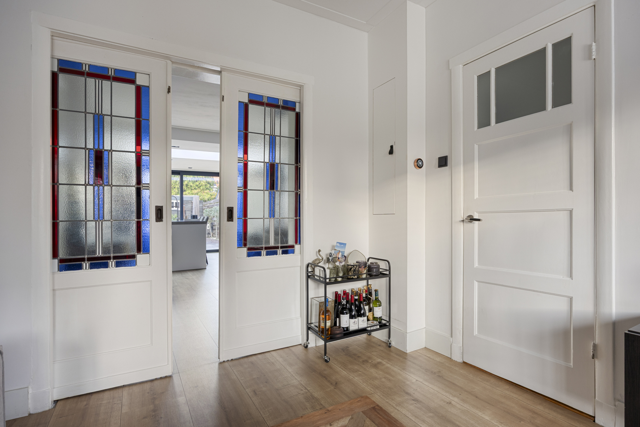 Vanuit hier betreed je de sfeervolle woonkamer, waar in 2020 een fraaie modernisering heeft plaatsgevonden met behoud van de geliefde jaren ’30 details, zoals de erker aan de voorzijde en de karakteristieke en suite deuren met glas-in-lood.