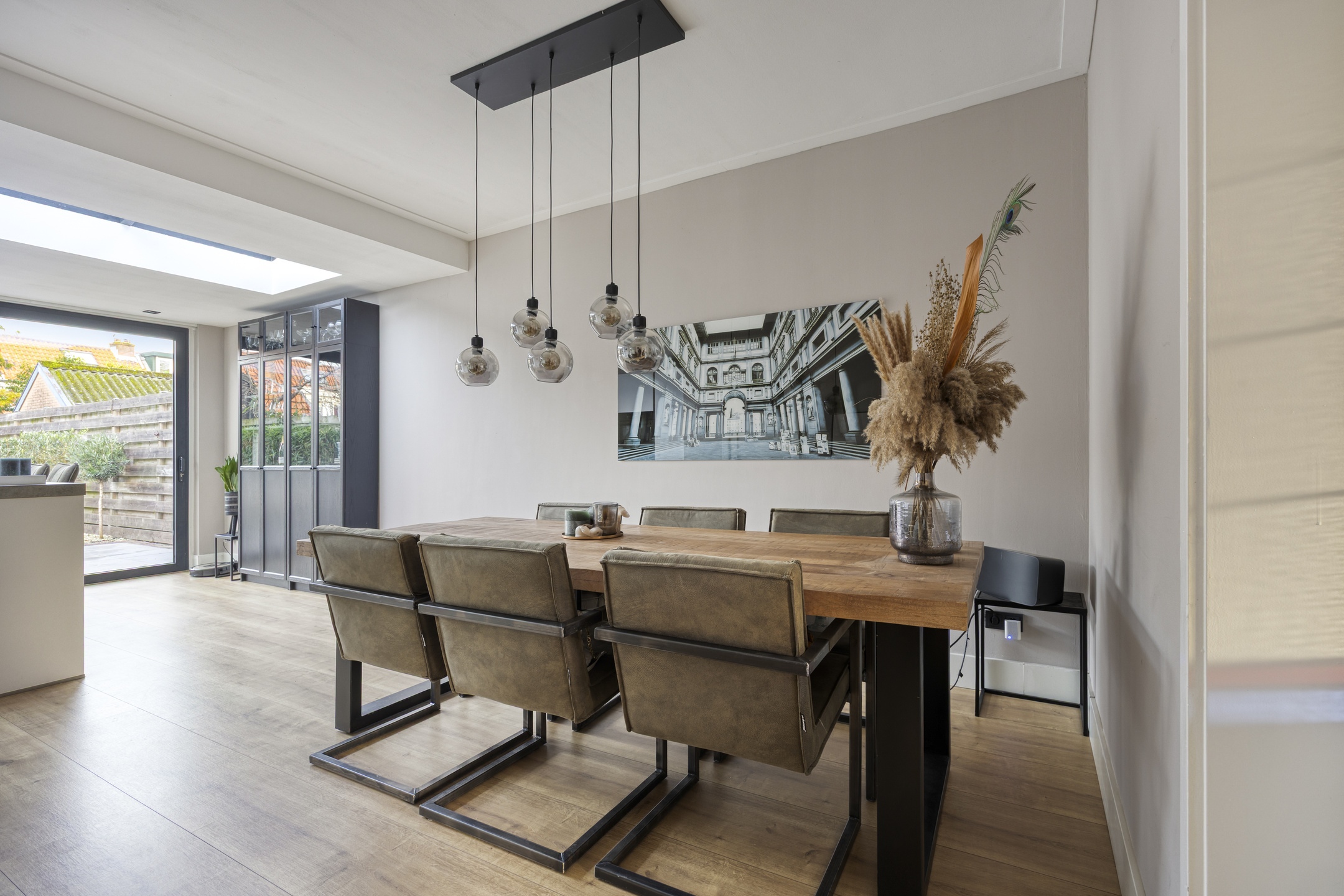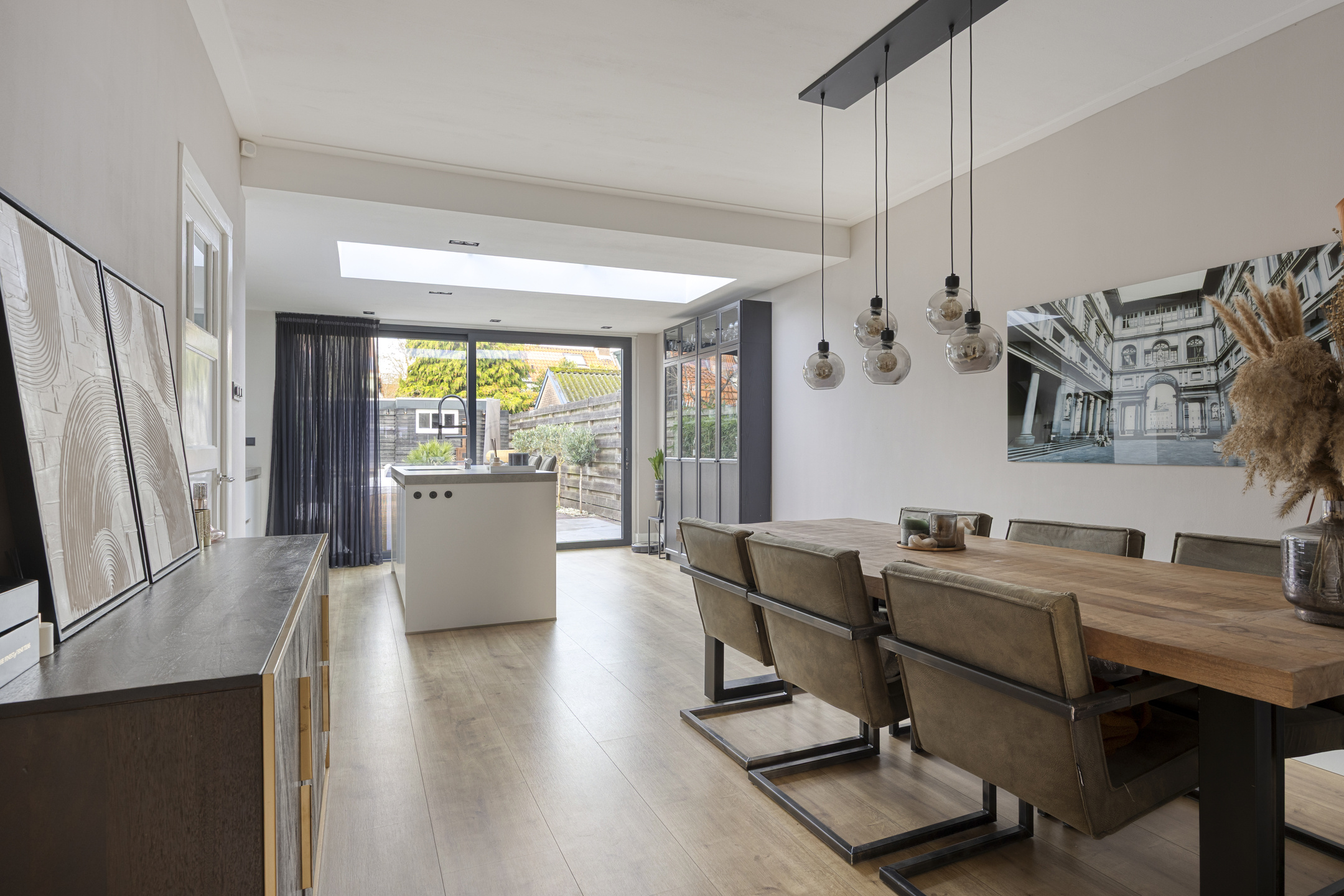 De woonkamer is verdeeld in een gezellige voorkamer met erker en een royale eetkamer, die dankzij de uitbouw met lichtkoepel uit 2020 heerlijk licht en ruim aanvoelt.