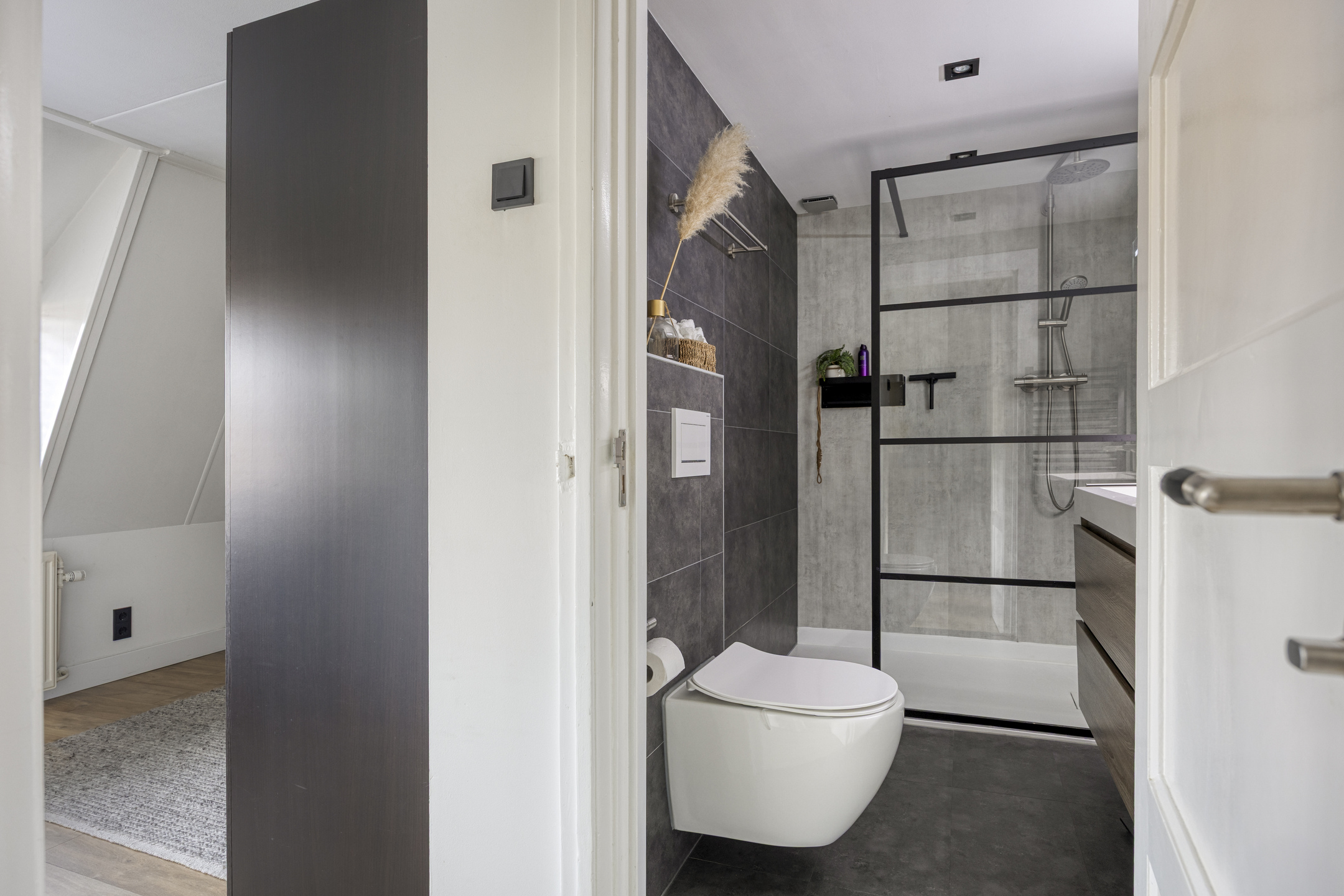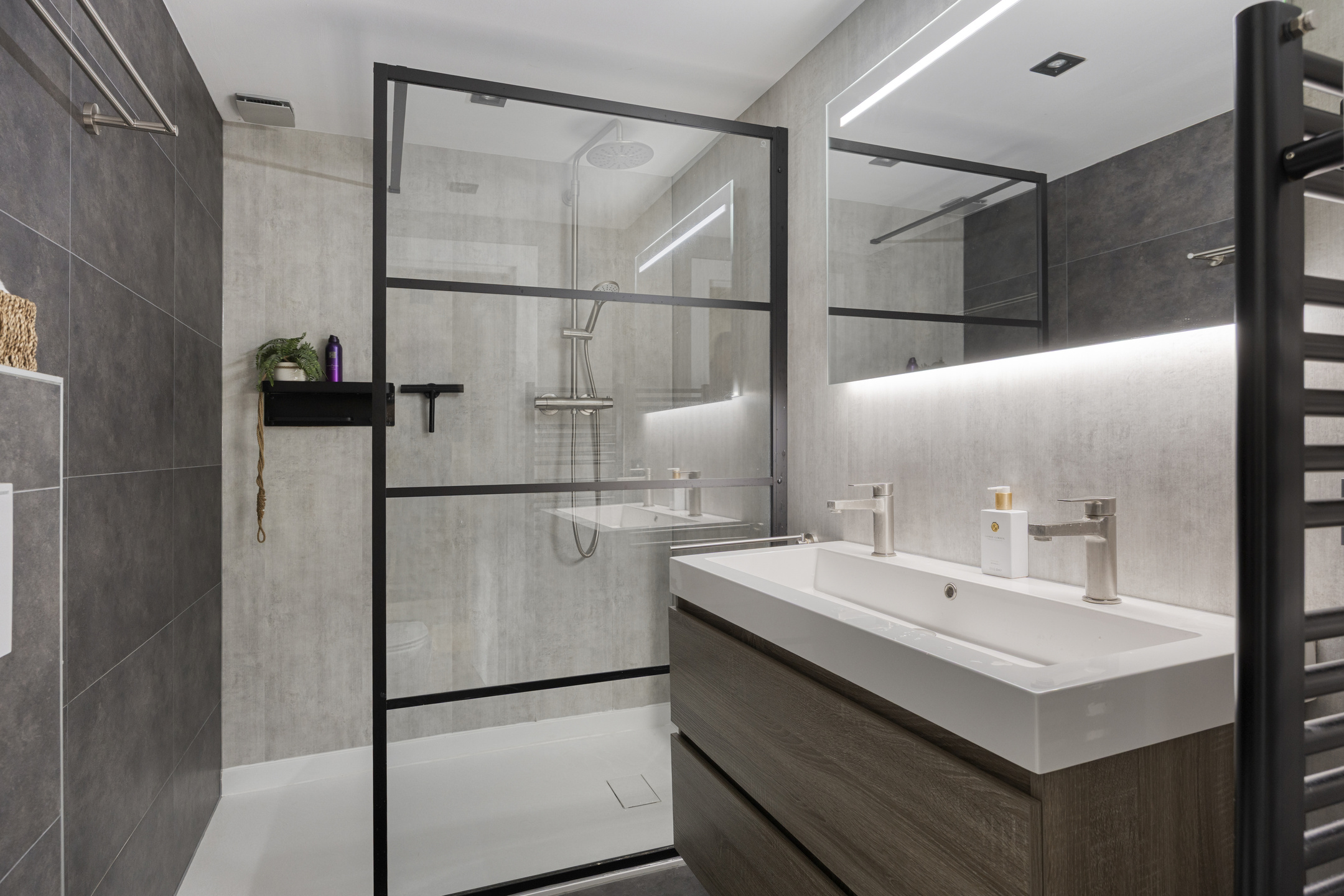 Tussen de slaapkamers ligt de moderne badkamer, uitgerust met een inloopdouche, toilet en wastafelmeubel. Tevens is de badkamer voorzien van vloerverwarming, spiegel met verwarming en een designradiator.