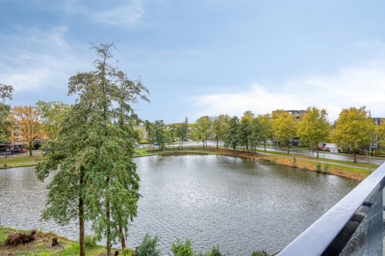Vanuit de woonkamer en vanaf het balkon is er een fraai uitzicht over de vijver. Een ideale plek voor wie comfortabel wil wonen met alle voorzieningen dichtbij.