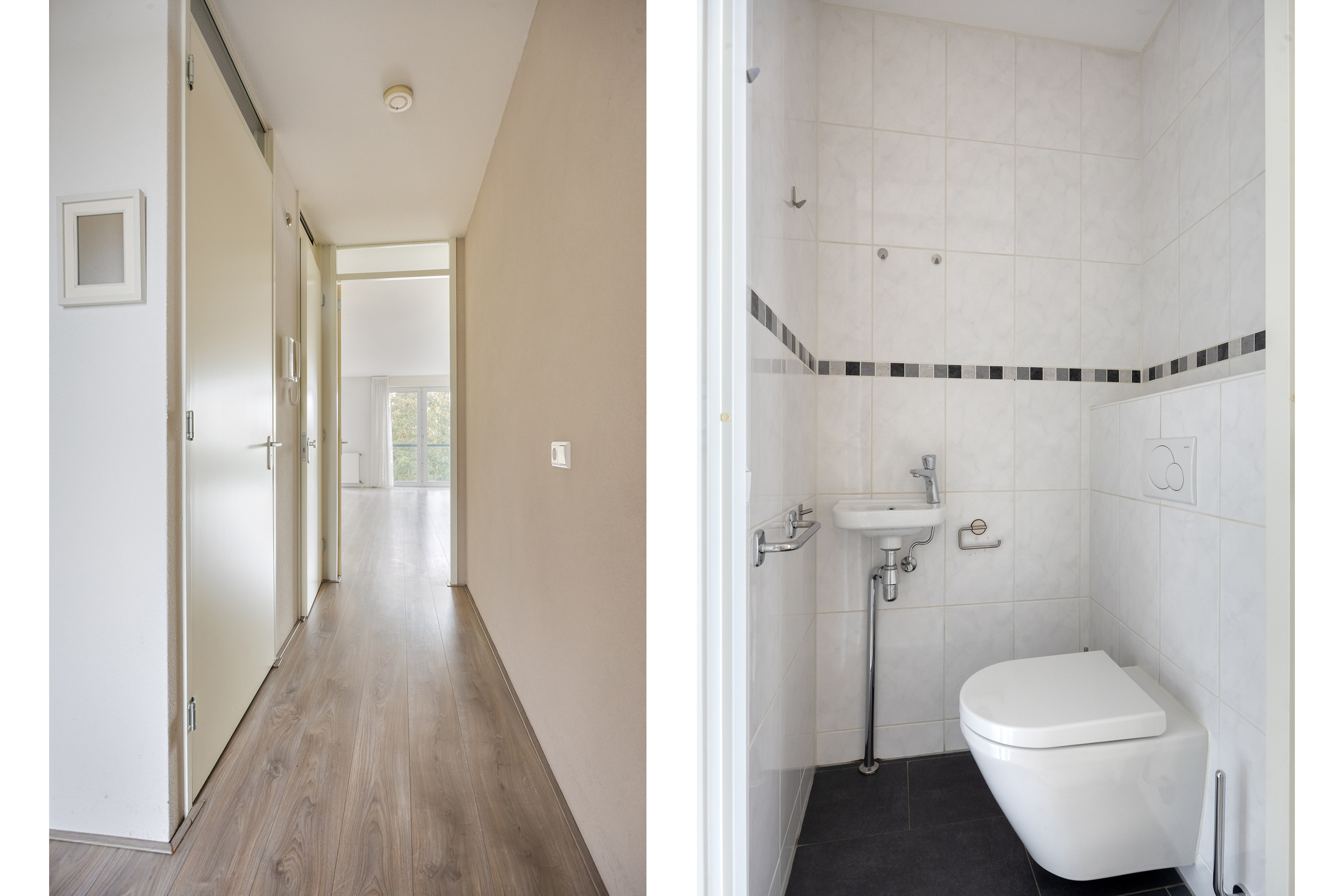 Bij binnenkomst kom je in de hal, met een garderobekast, intercom, meterkast en een toiletruimte met hangend toilet. Vanuit de hal loop je door naar de lichte en royale woonkamer.