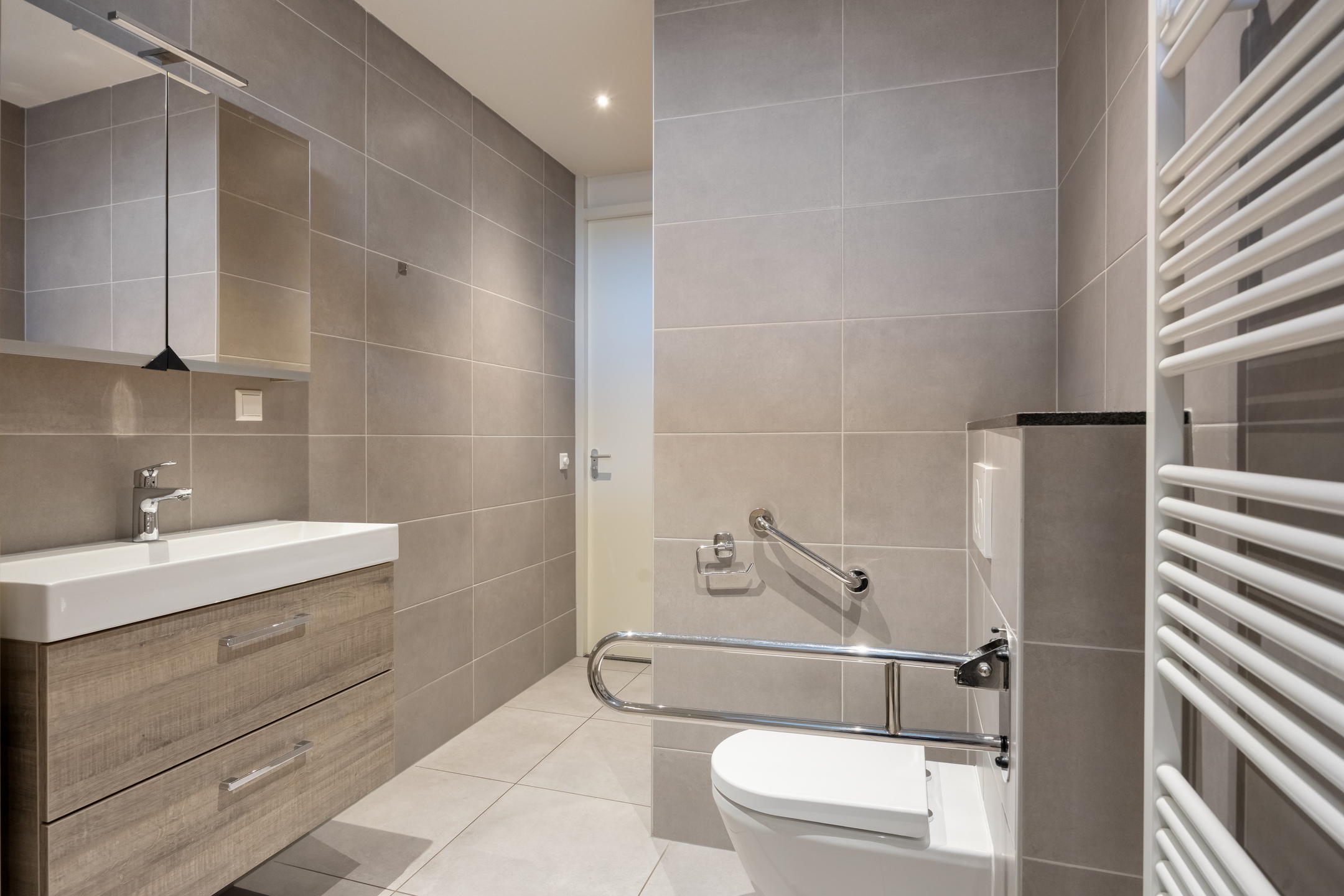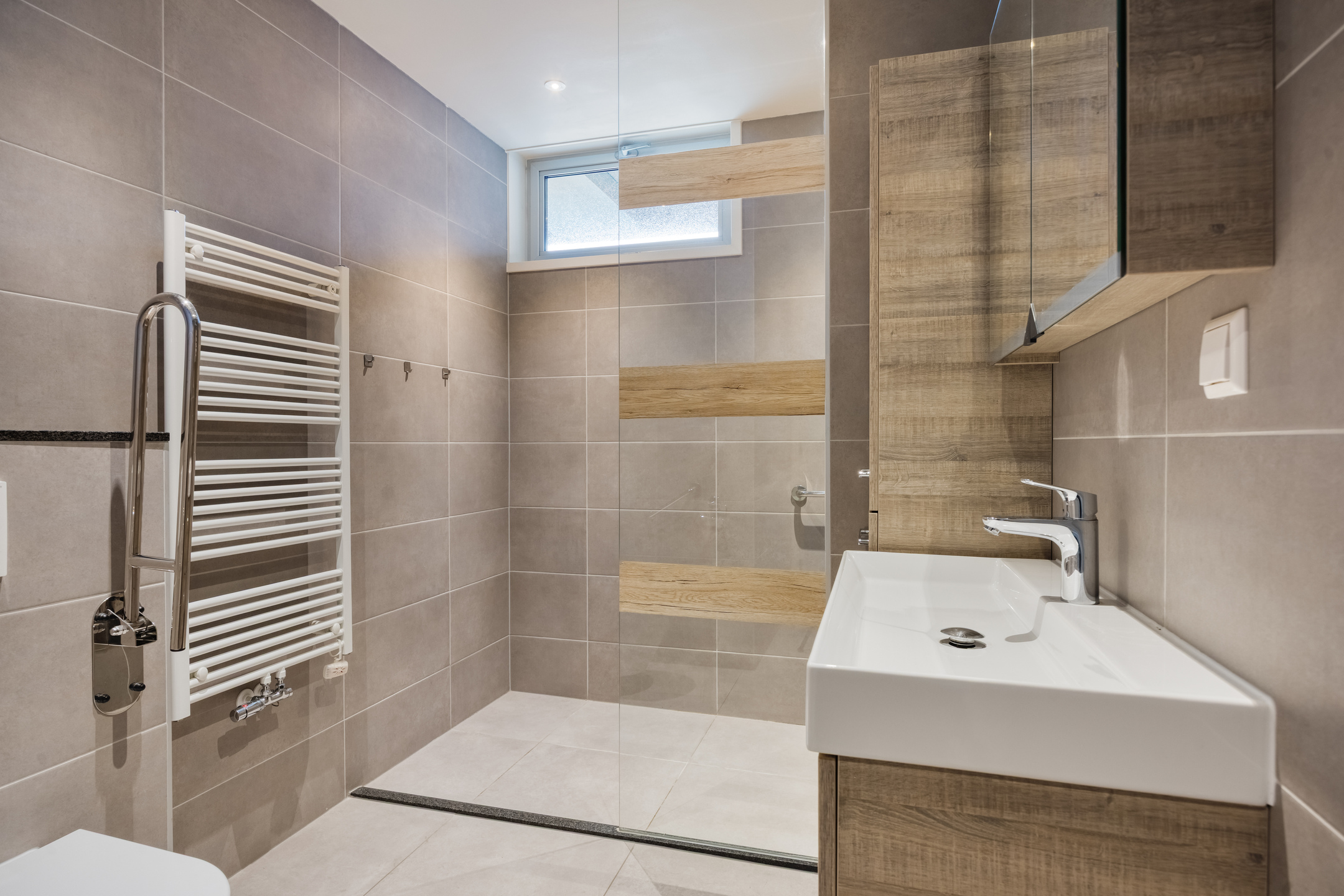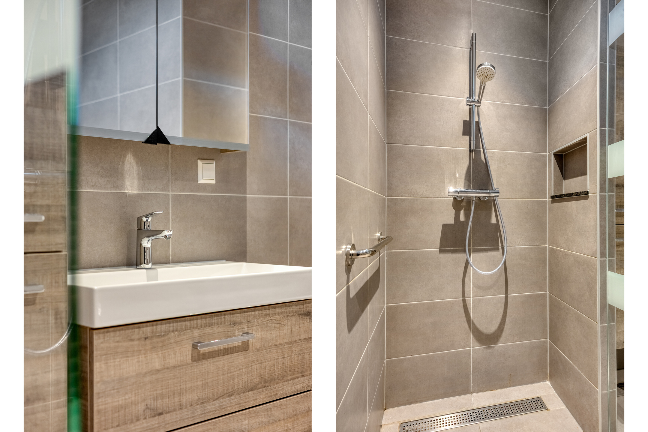De badkamer (2019) is modern afgewerkt en uitgerust met een ruime inloopdouche, wastafelmeubel, tweede hangend toilet, design radiator en een raampartij — een comfortabele en verzorgde ruimte om de dag rustig te beginnen én ontspannen af te sluiten.