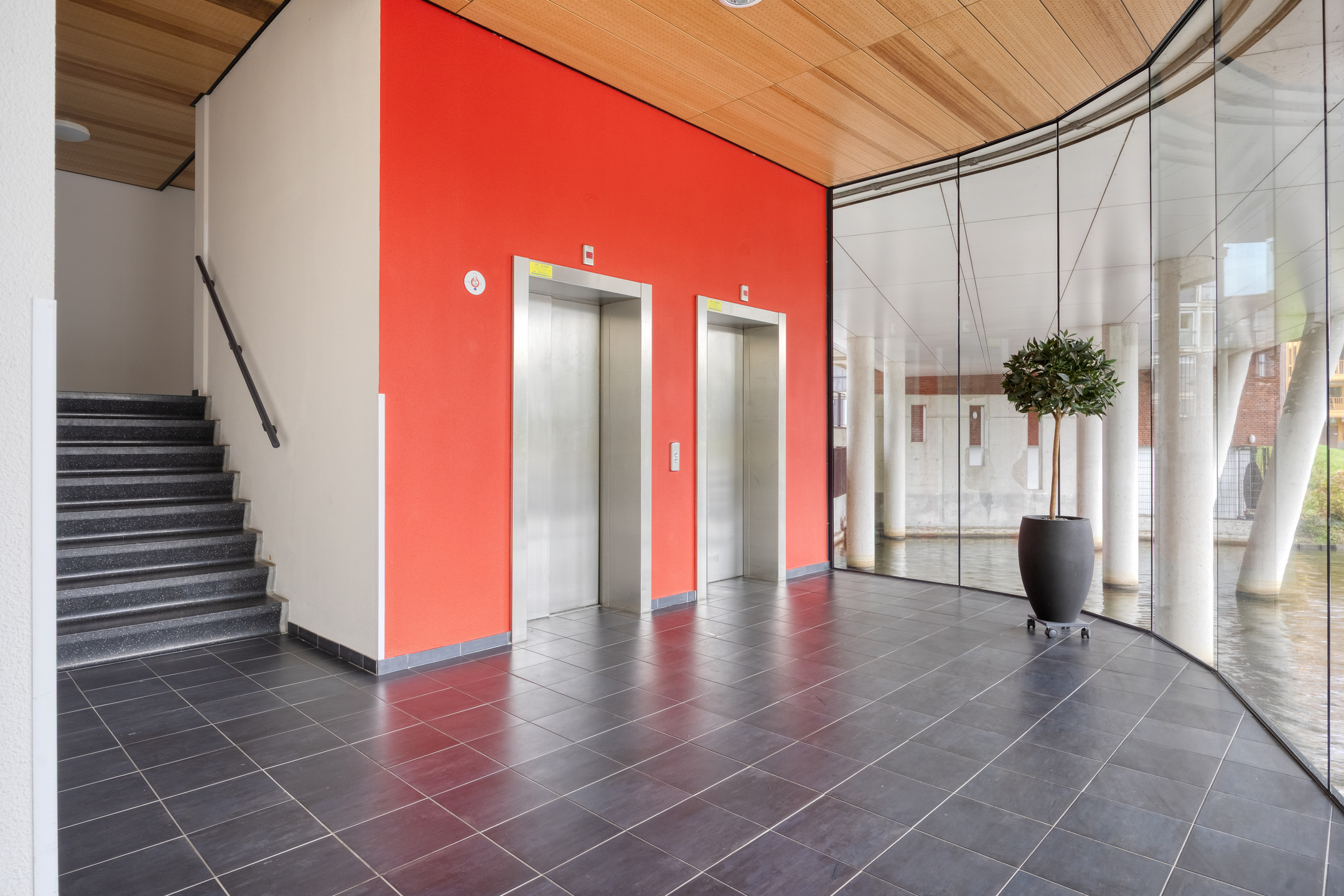 De centrale entree van het complex is netjes en verzorgd. Hier bevinden zich de brievenbussen, het bellentableau met intercom en toegang tot zowel het trappenhuis als de twee liften.