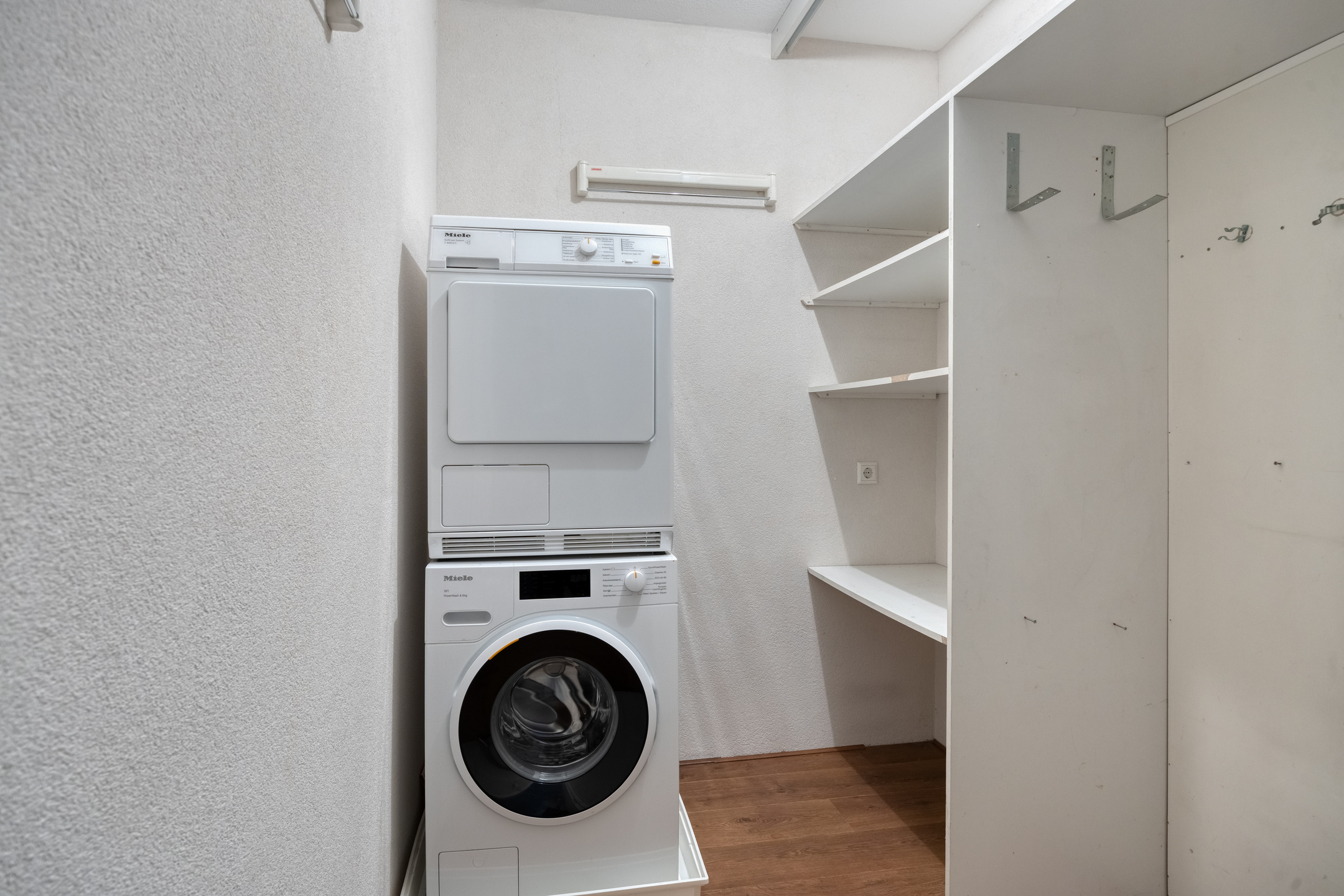 De ruime inpandige berging biedt plek voor de wasmachine- en drogeraansluiting. Handig voor extra opslag en huishoudelijke voorzieningen uit het zicht.