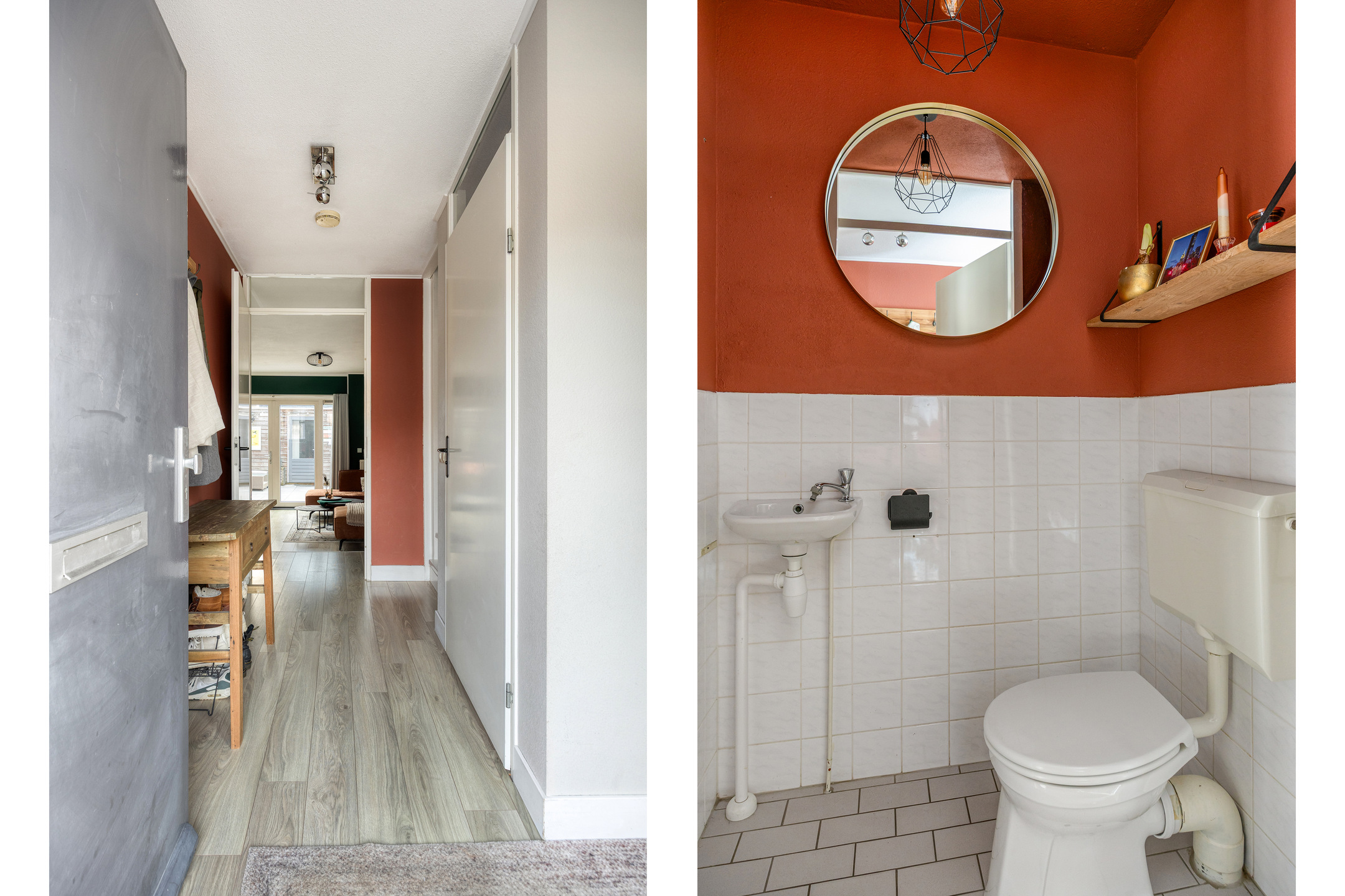 Ruime entree met meterkast en toiletruimte. Vanuit de hal leidt de trap naar de eerste verdieping en krijg je toegang tot de living.