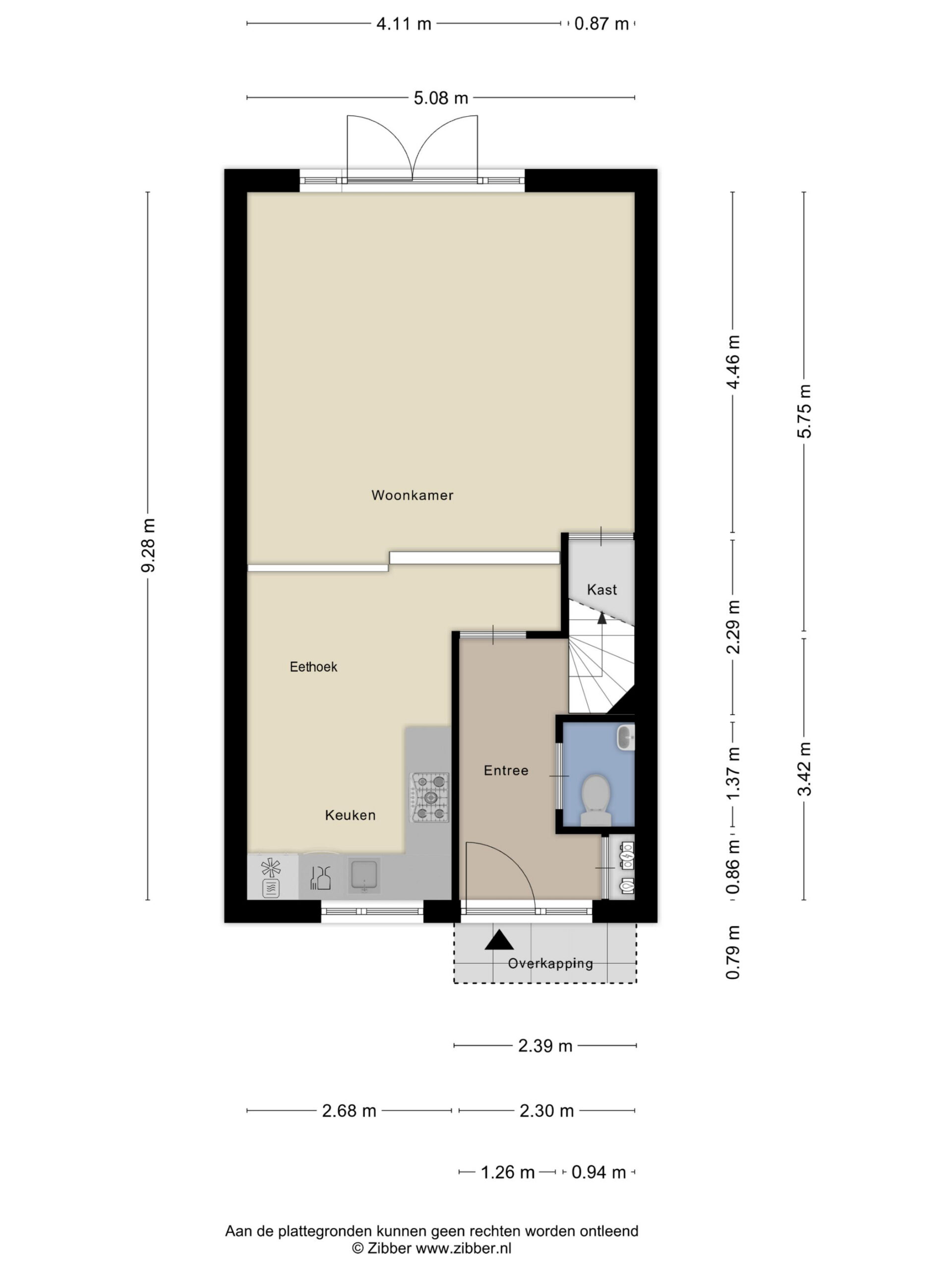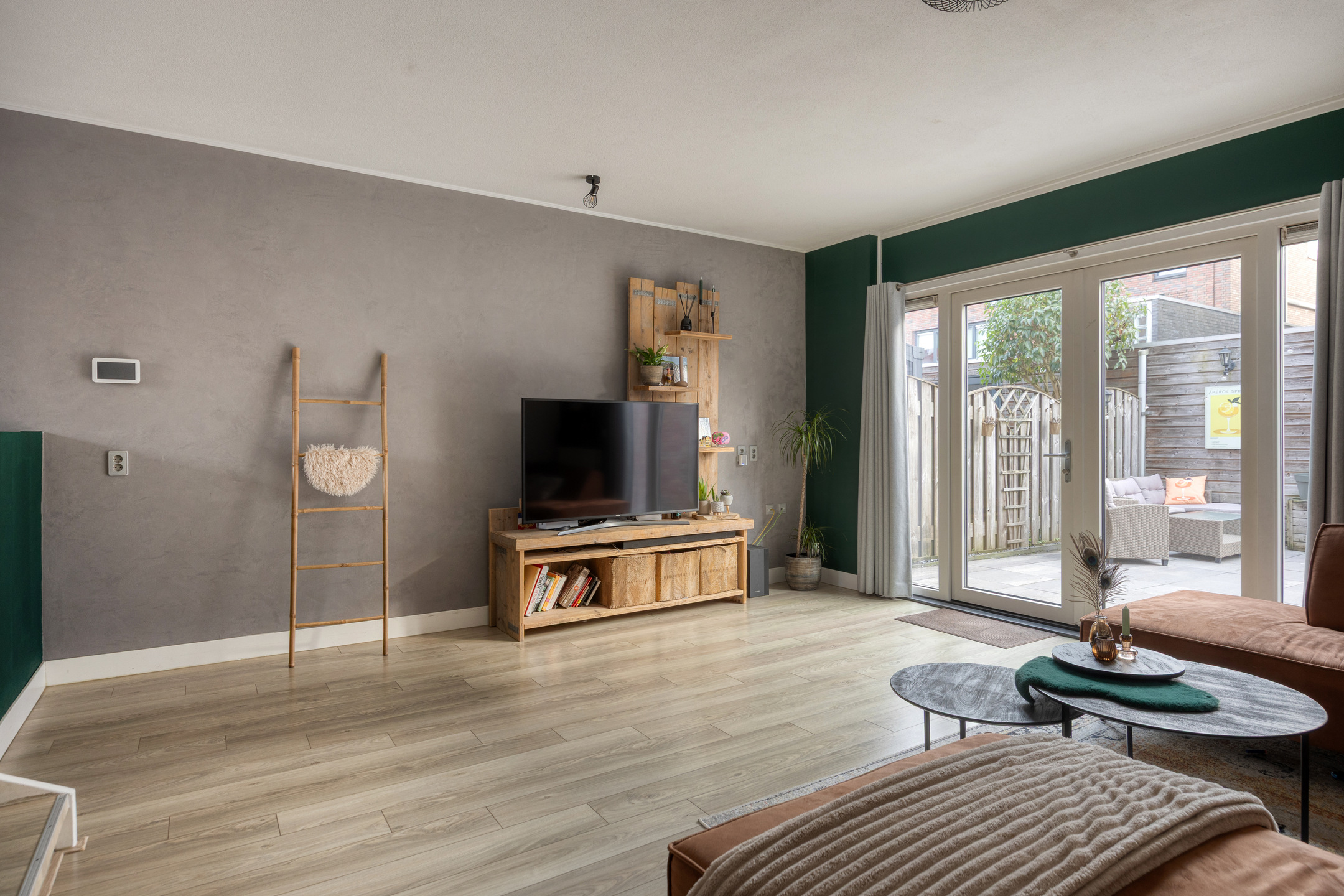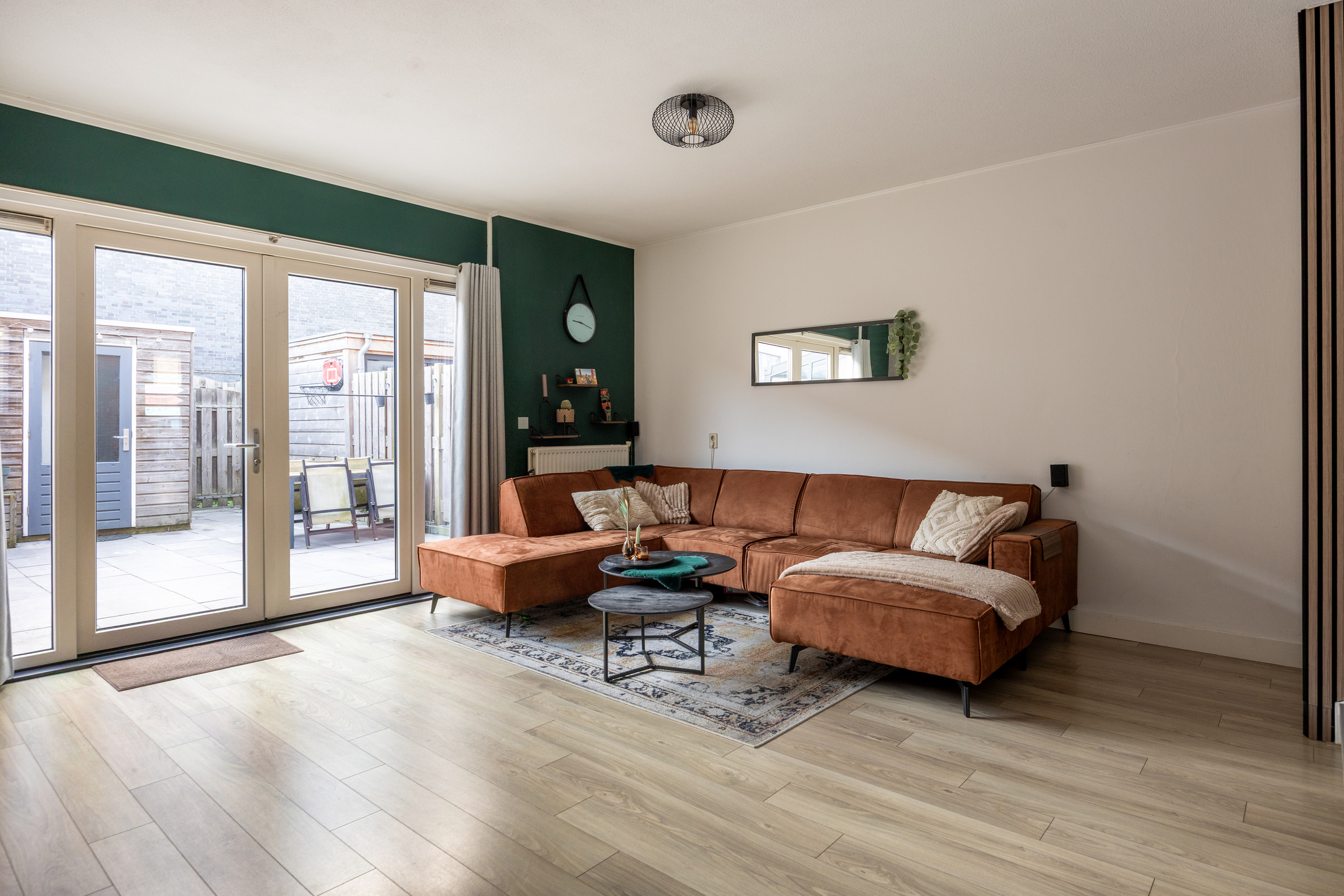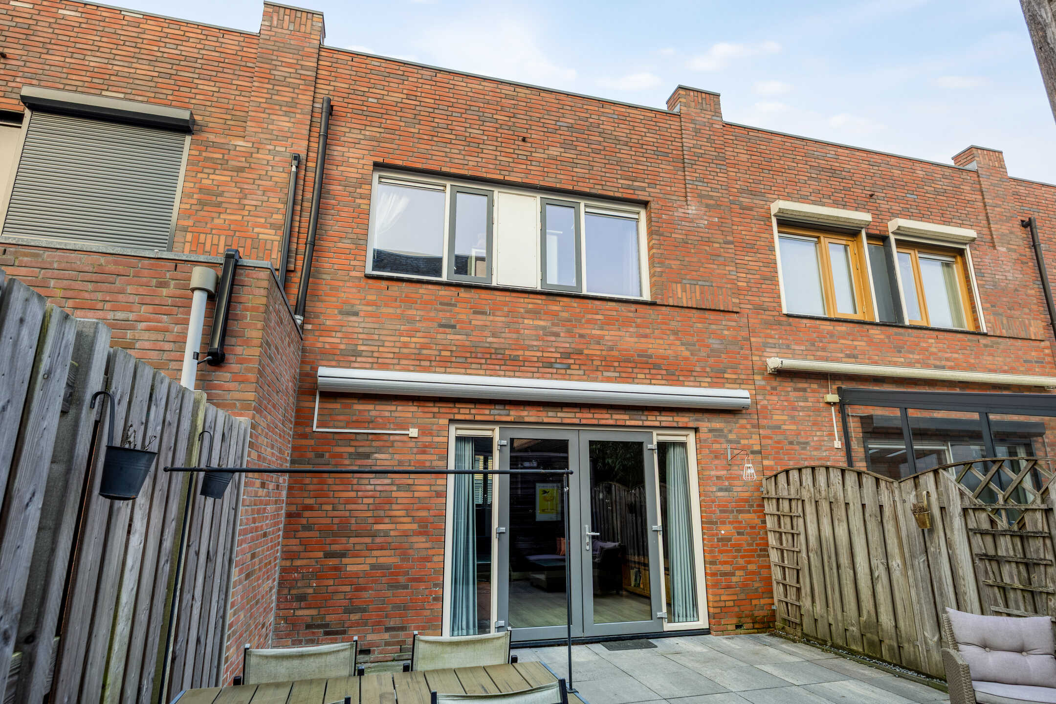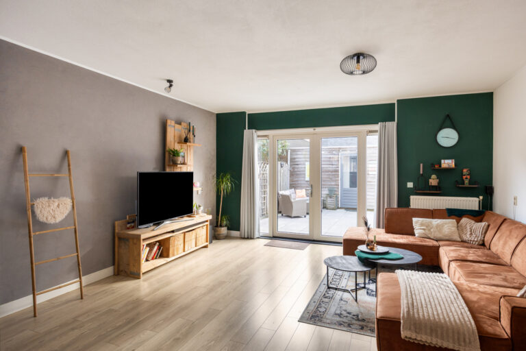 Via de openslaande deuren (uitgevoerd in kunststof) is er directe toegang tot de achtertuin. Onder de trap bevindt zich een praktische vaste kast die op een creatieve manier onttrokken is uit het zicht.