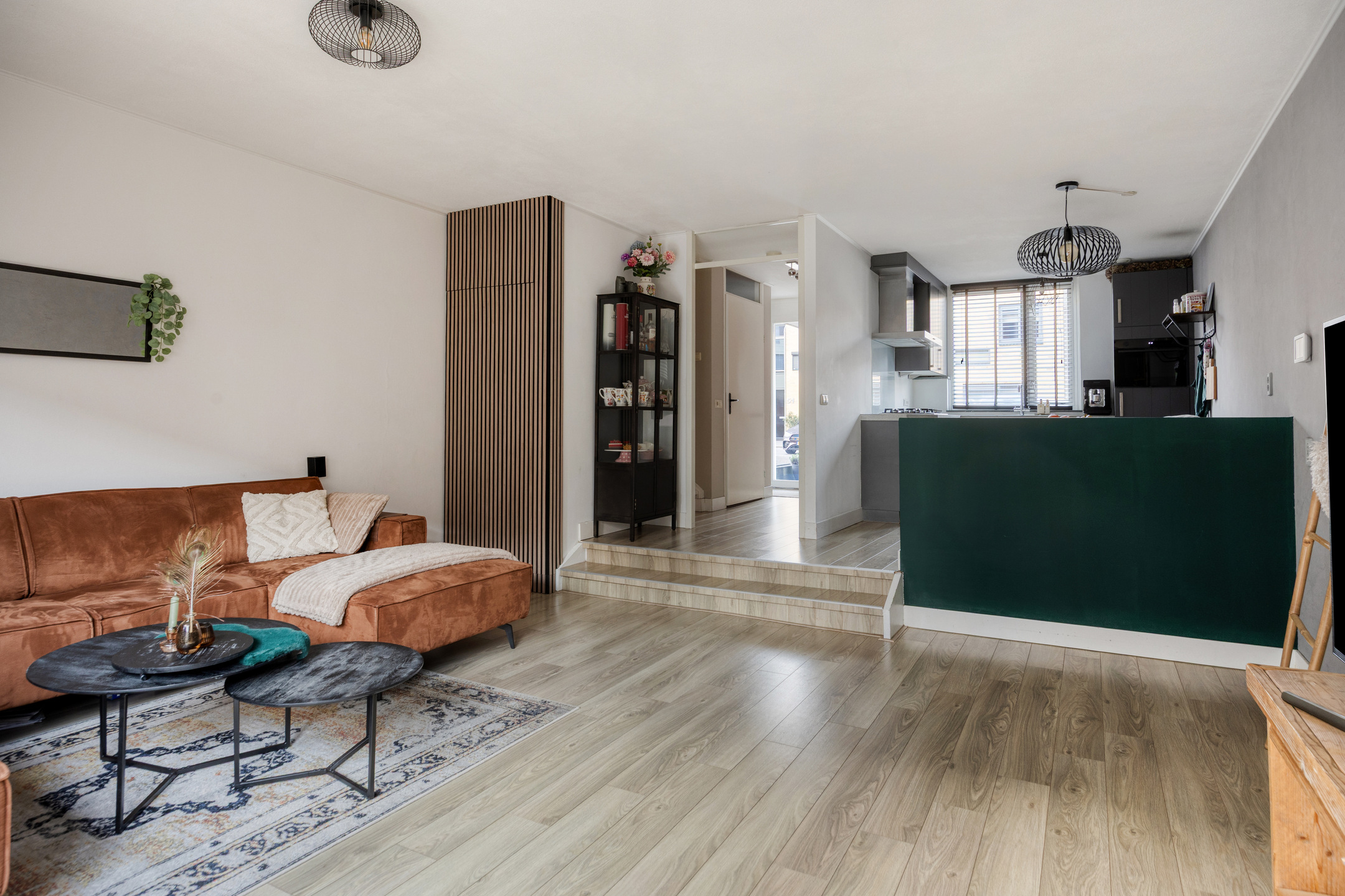 De woonkamer is gelegen aan de achterzijde van de woning en kenmerkt zich door het speelse niveauverschil. Het lager gelegen zitgedeelte zorgt voor een ruimtelijke beleving en een prettige scheiding tussen eten en wonen.