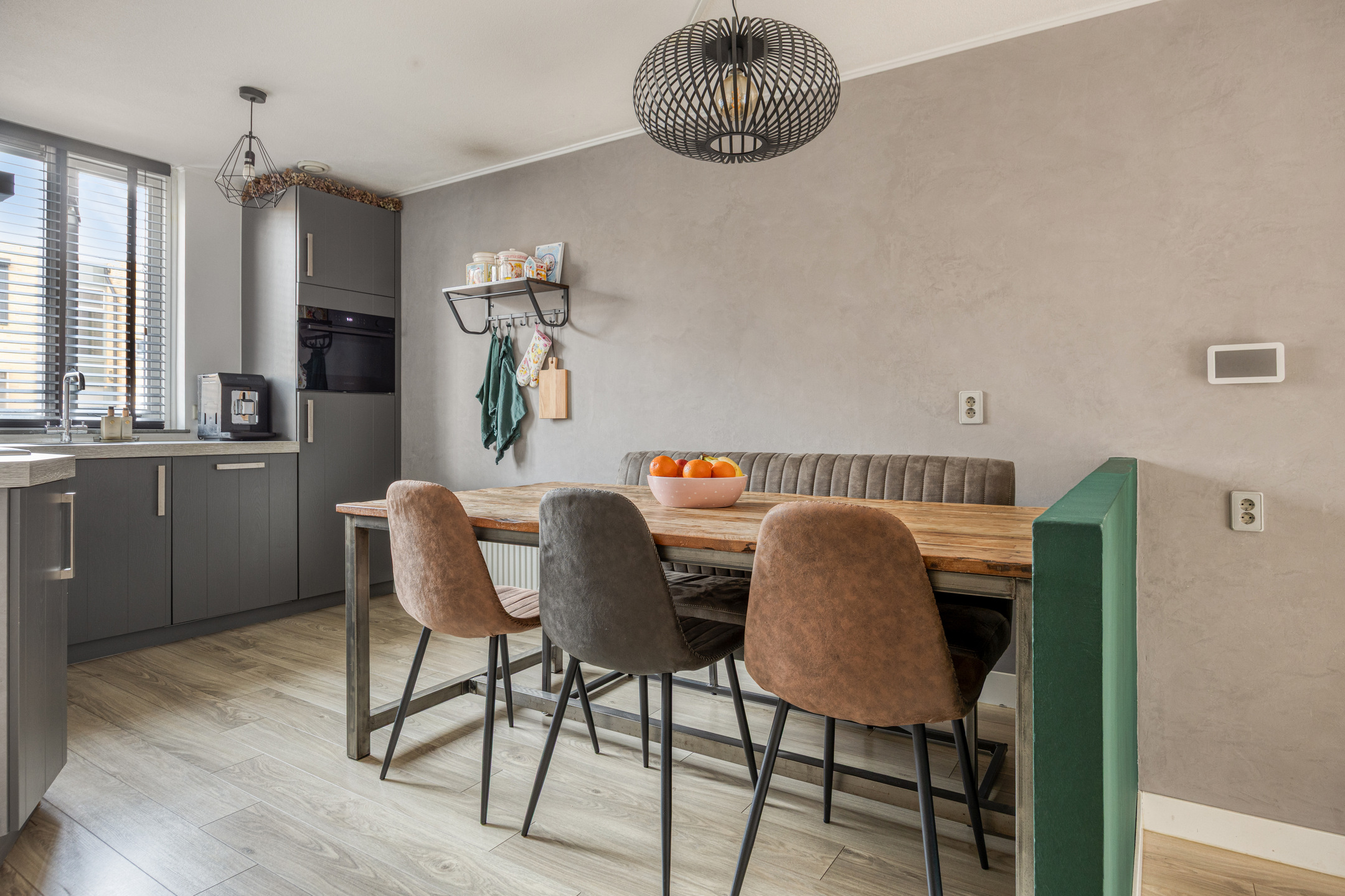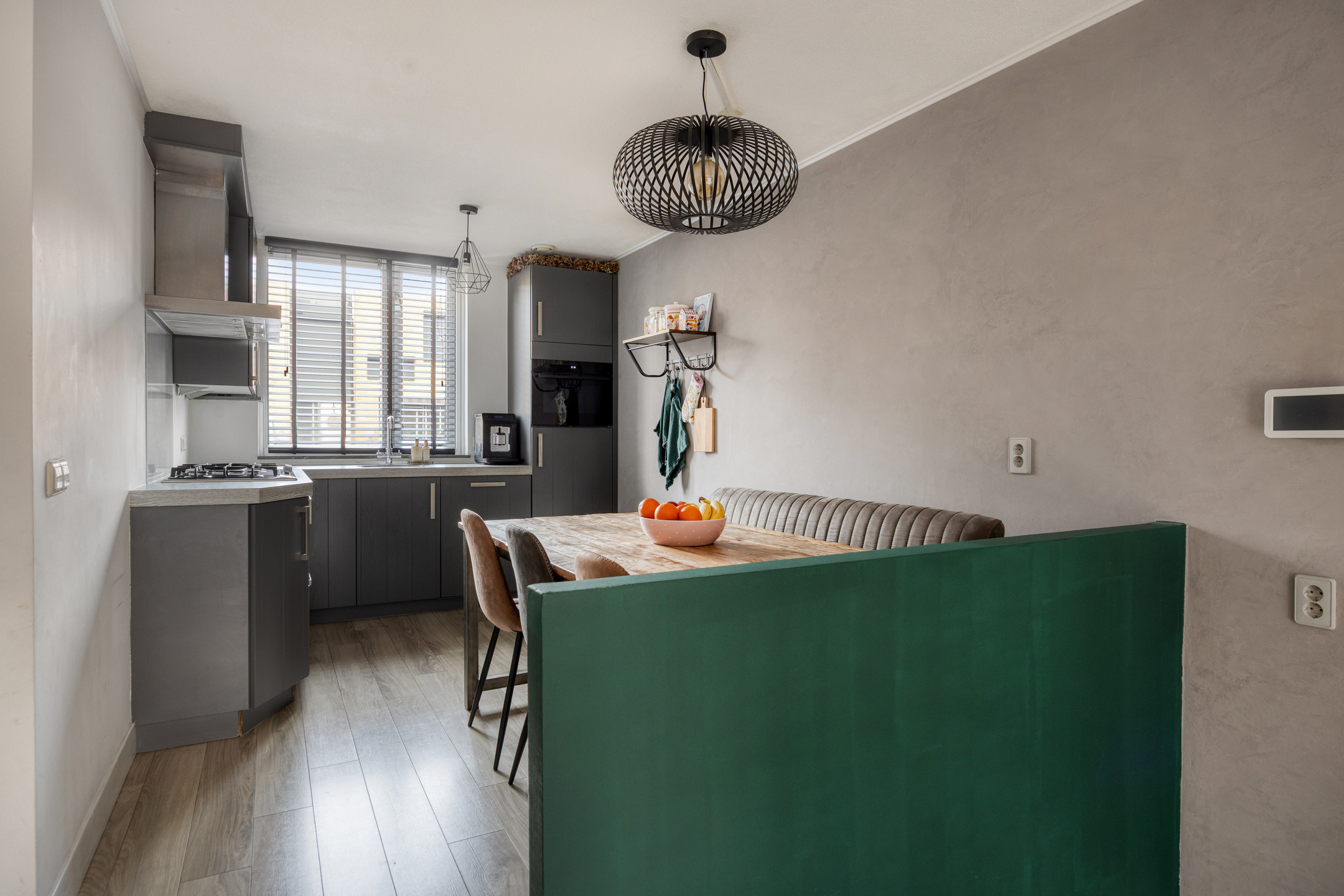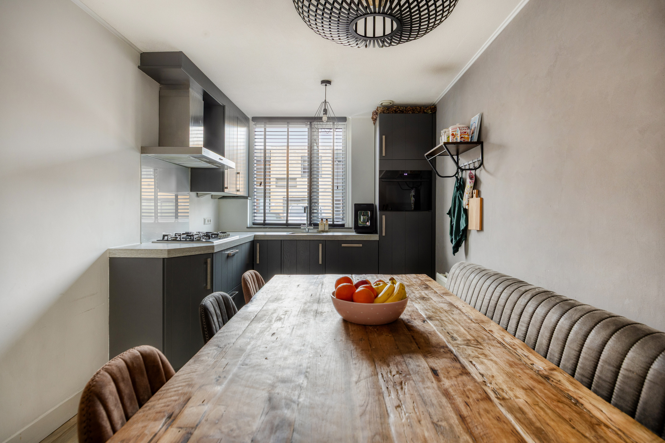 De keuken biedt voldoende werk- en bergruimte en vormt een fijne plek voor dagelijks gebruik, met aansluitend ruimte voor een gezellige eethoek waar een eettafel voor 6 personen prima ruimte heeft.