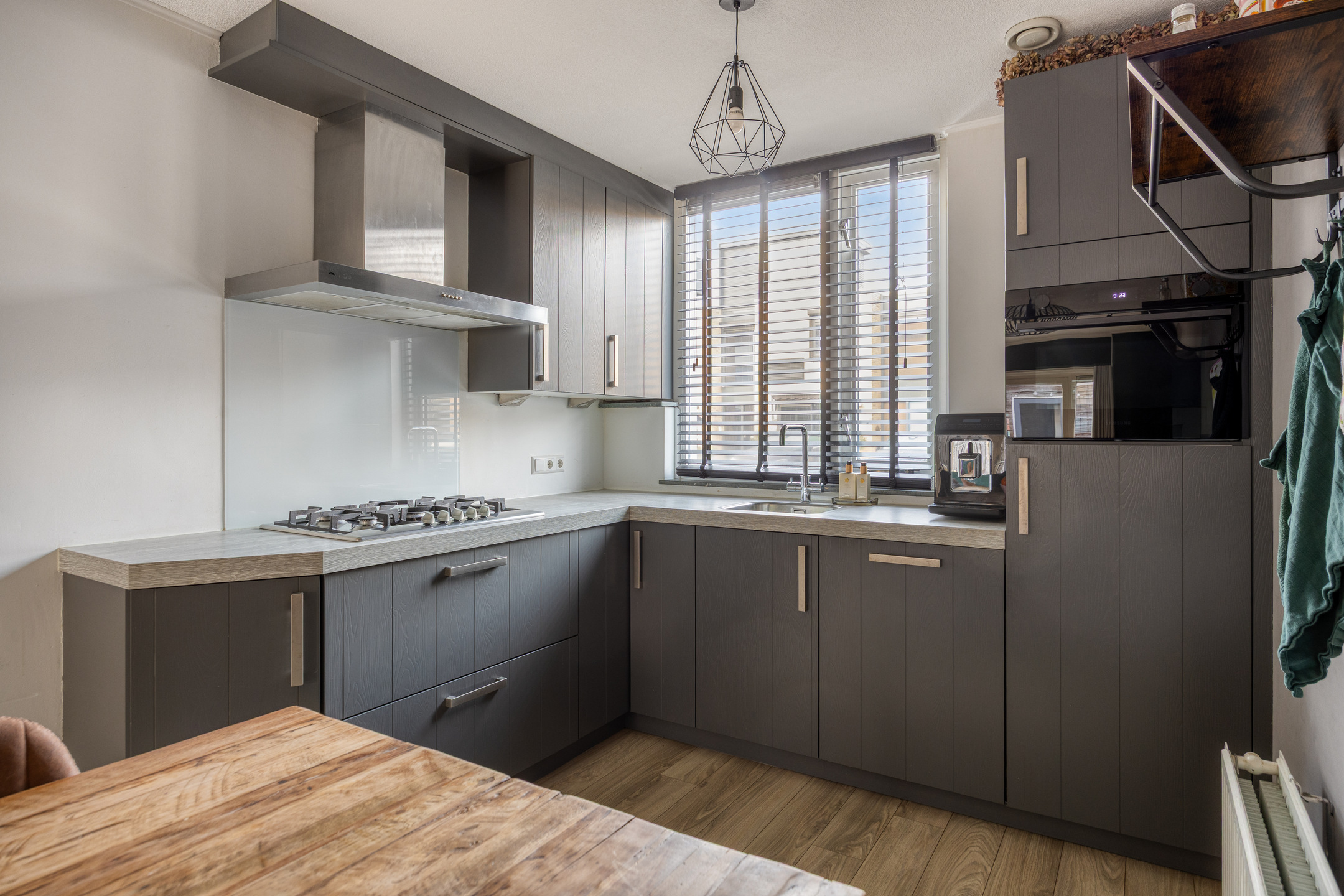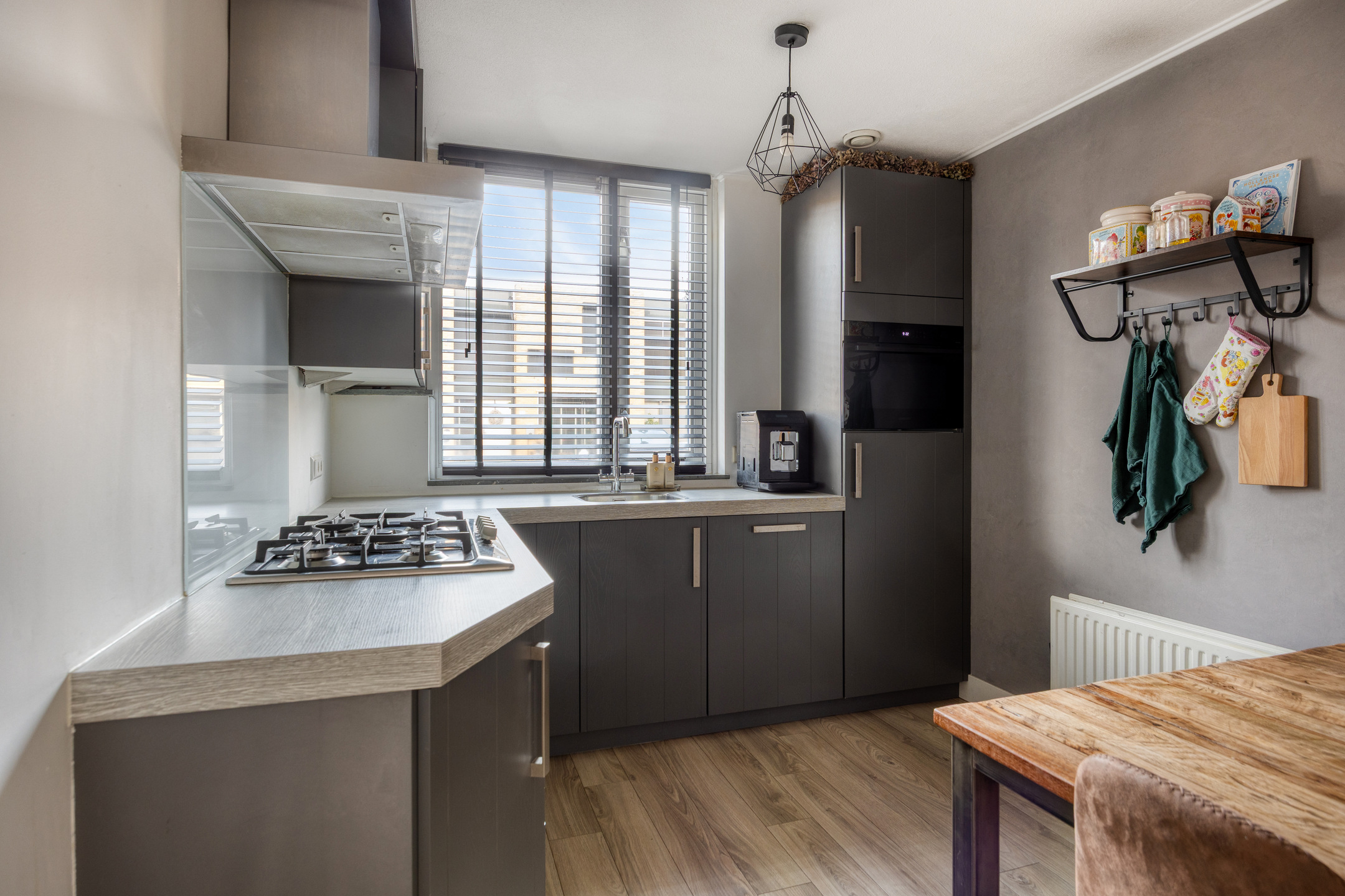 Aan de voorzijde van de woning bevindt zich de open keuken, praktisch ingericht, voorzien van diverse inbouwapparatuur.