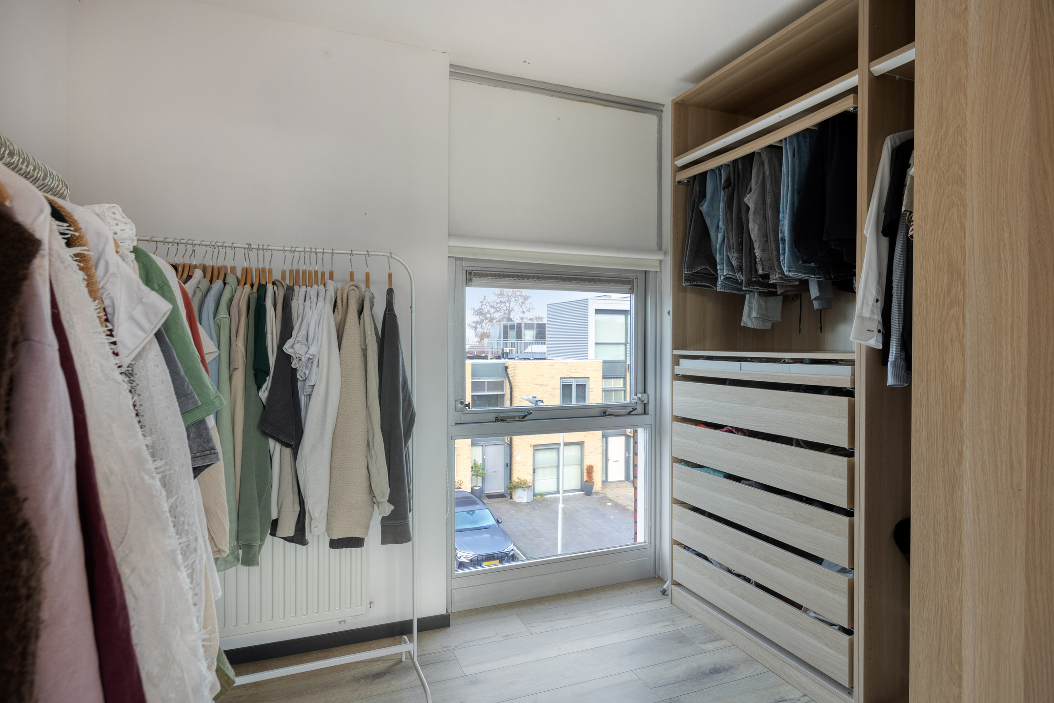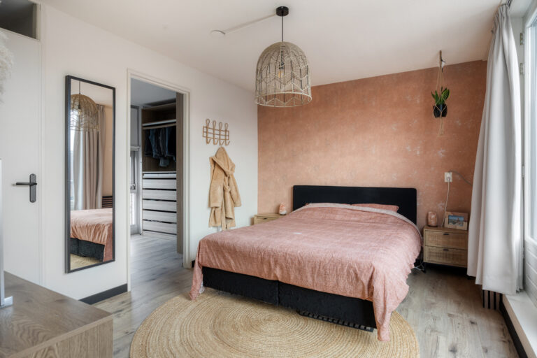 Hier bevindt zich een ruime slaapkamer met aangrenzend een walk-in closet (totaal groot ca.19m2), wat zorgt voor extra luxe en bergruimte.
