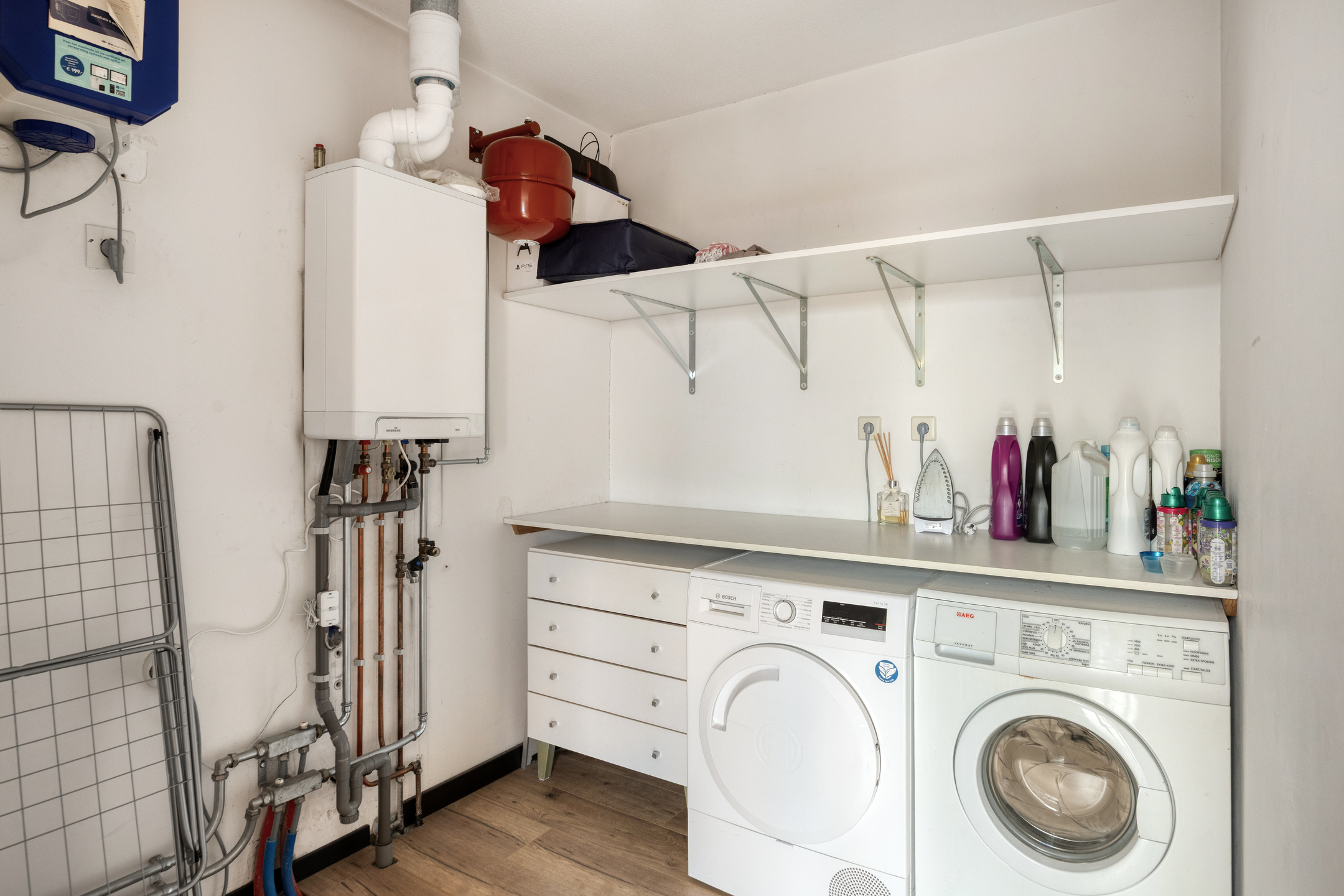 Daarnaast is er een aparte wasruimte met opstelling voor de wasmachine en droger en de stookruimte, praktisch en netjes uit het zicht.