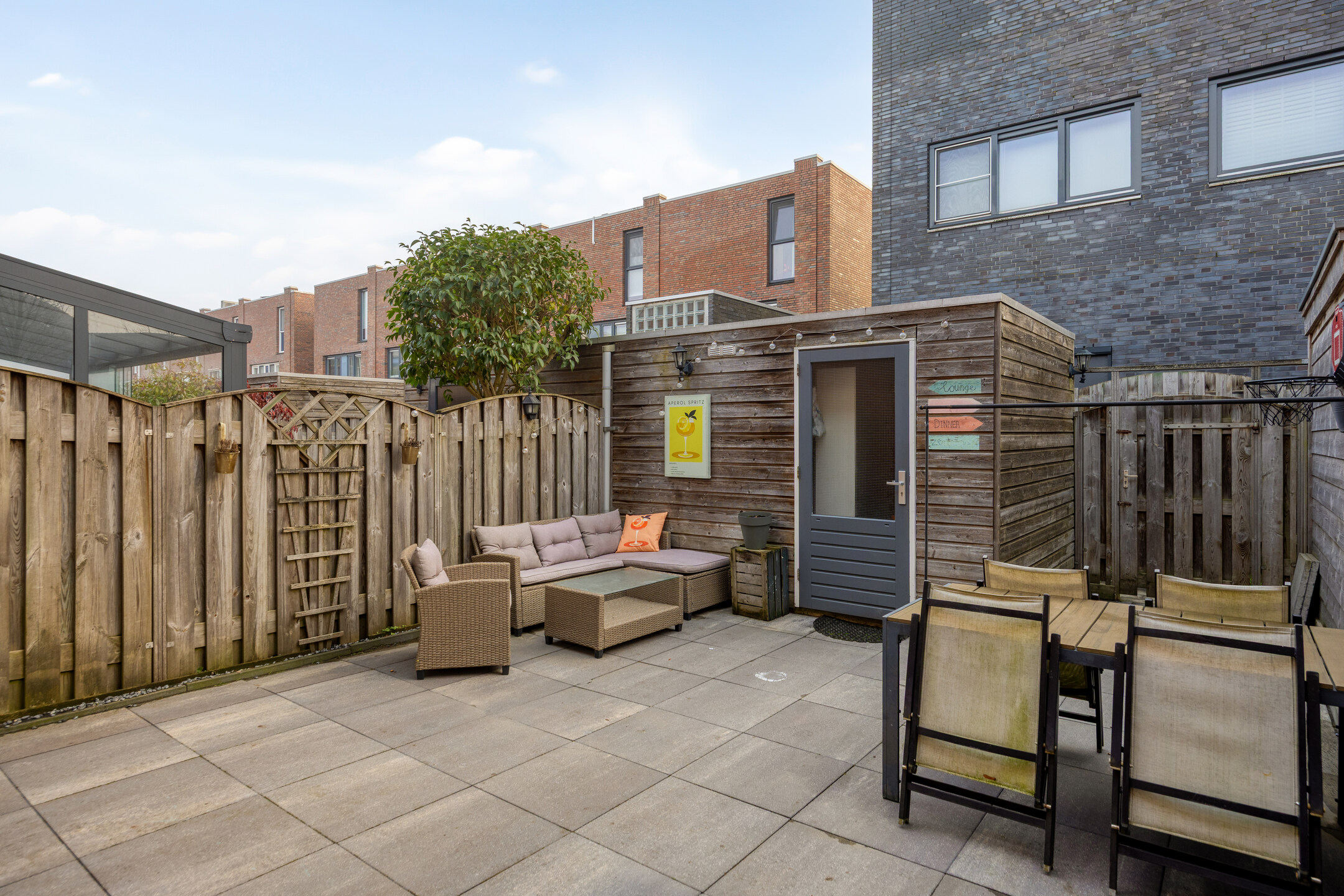 Daarnaast beschikt de achtertuin over een houten berging, ideaal voor het stallen van fietsen en het opbergen van tuinspullen.