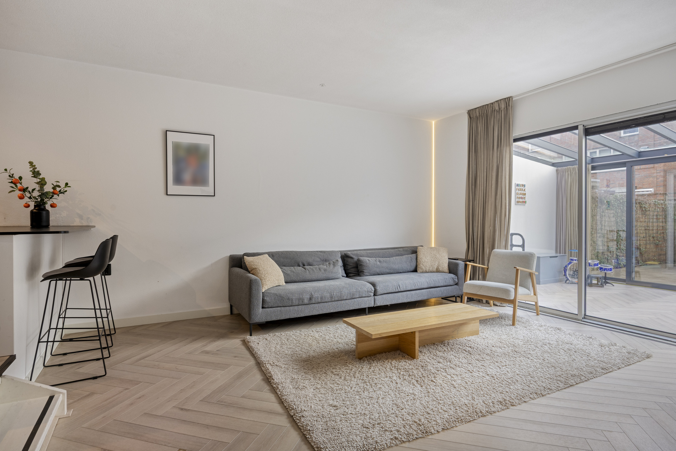 Momenteel ingericht als speelplek voor de kinderen, maar dankzij de veelzijdigheid ook uitstekend geschikt als loungeplek of extra eetkamer. Via de schuifpui stap je zo de achtertuin in.