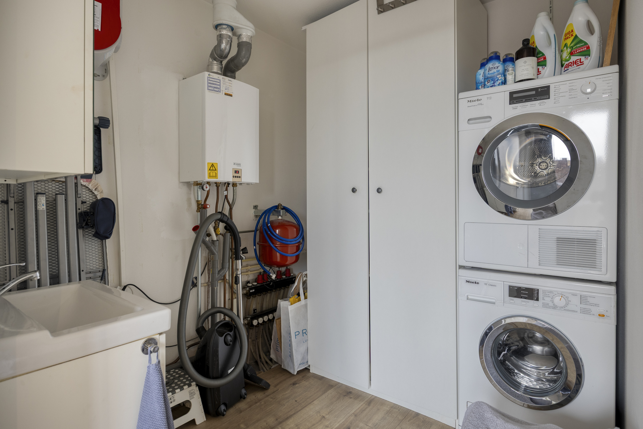 Deze ruimte biedt tevens extra bergruimte. Wat erg handig is; je treft hier ook een wastafel aan!